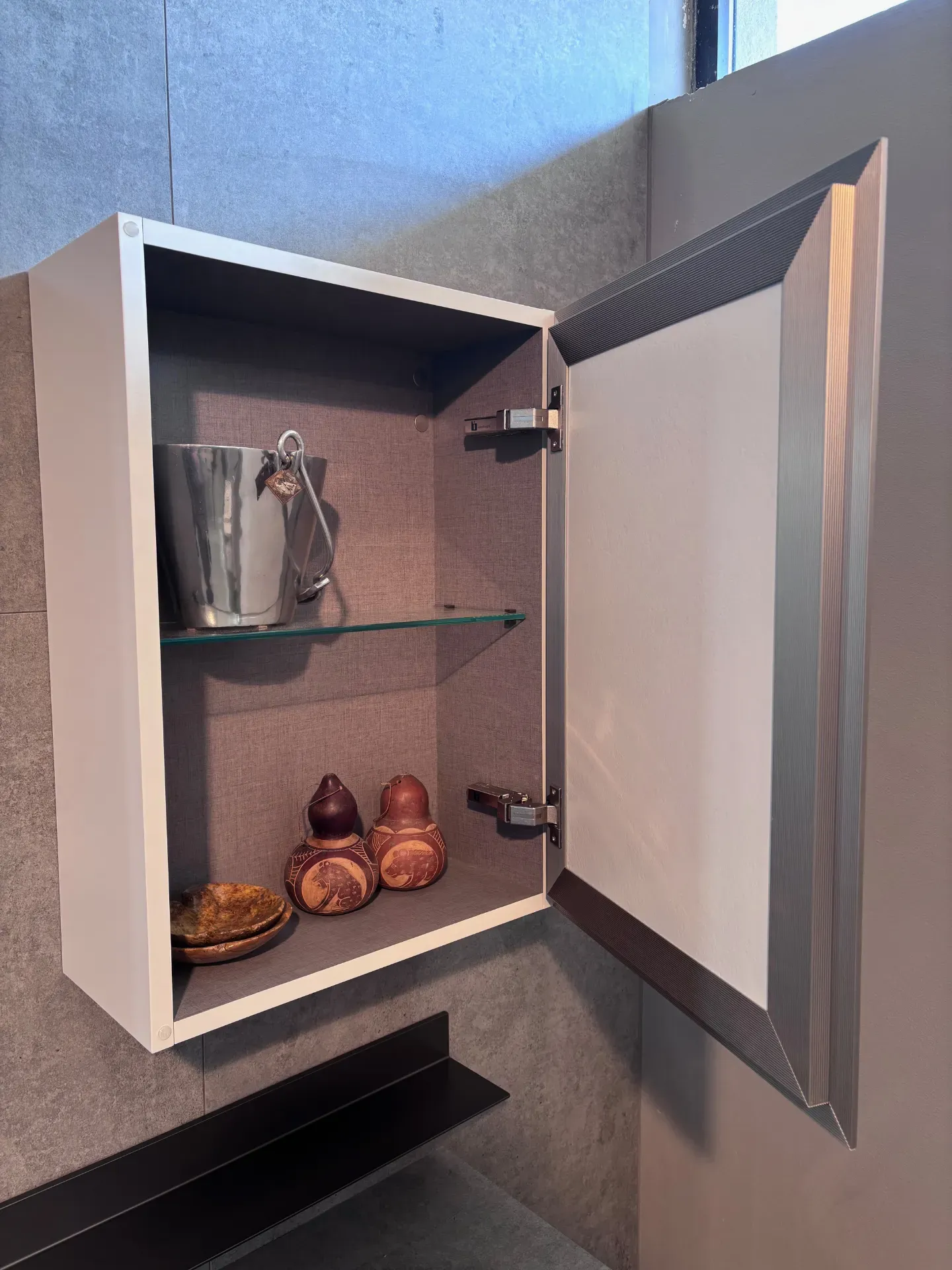 La composizione dell'annuncio ha le ante ed i fianchi della base in gres nella finitura CALACATTA mentre il pensile è laccato bianco opaco.