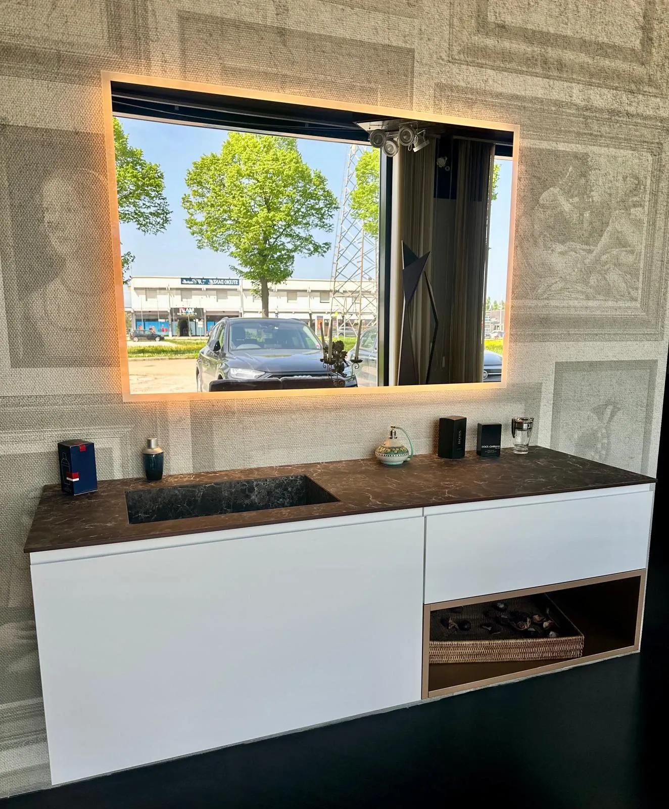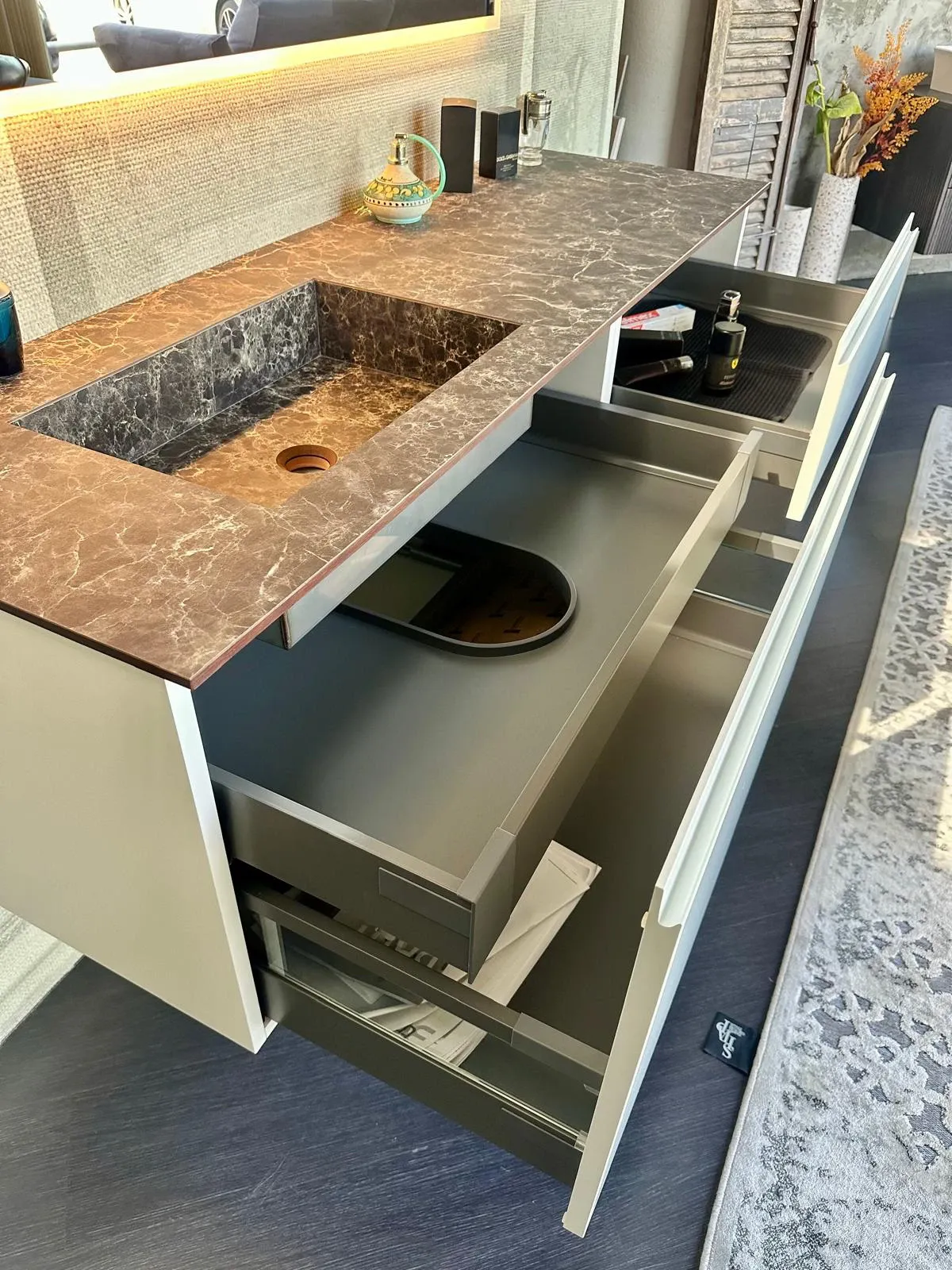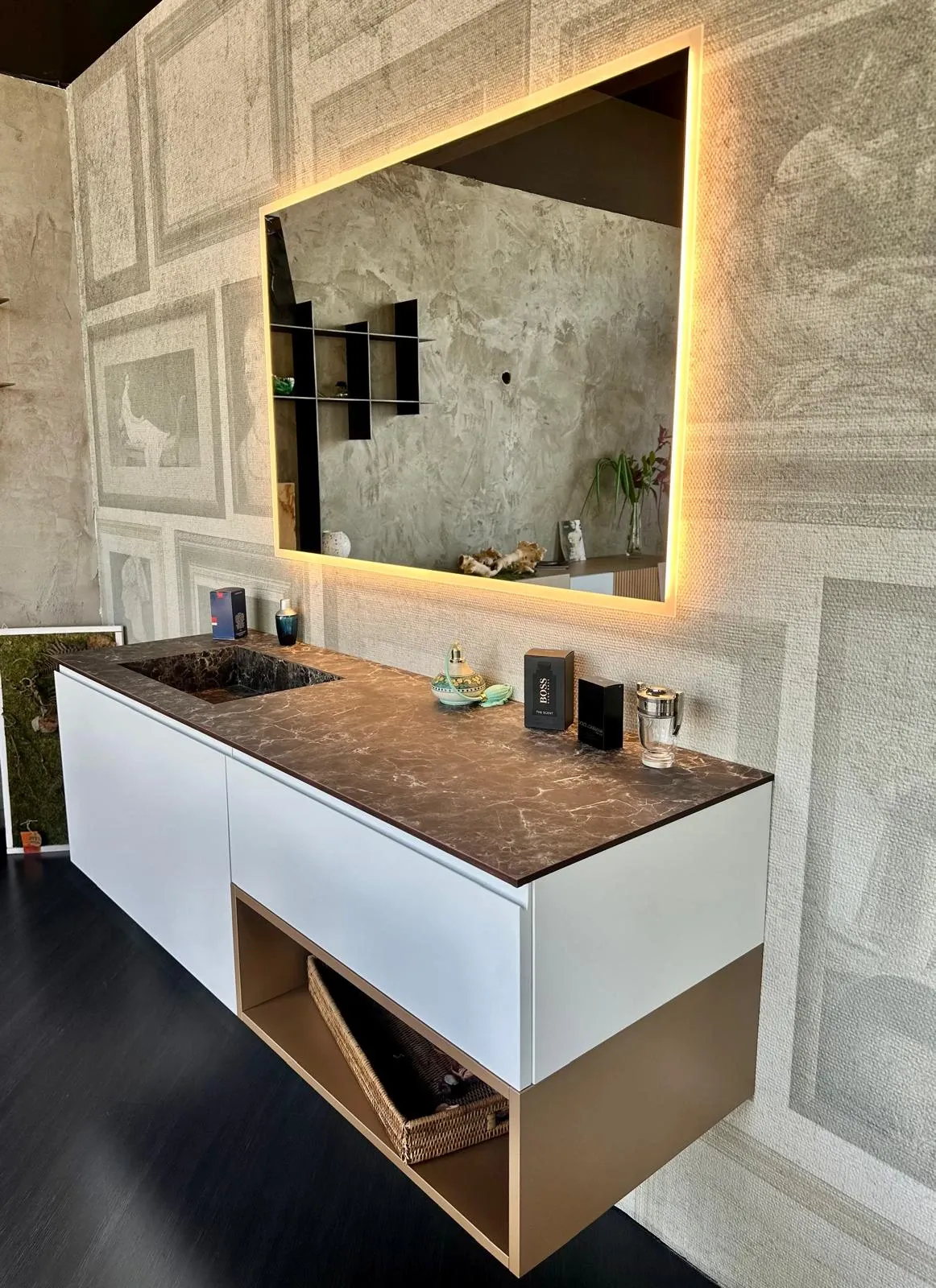 I frontali del cestone e cassetto sono laccato opaco bianco, il cestone è dotato di un cassetto interno. Vano a giorno laccato opaco bronzo. Il top è stratificato hpl kaiser con vasca integrata. La specchiera è retroilluminata.