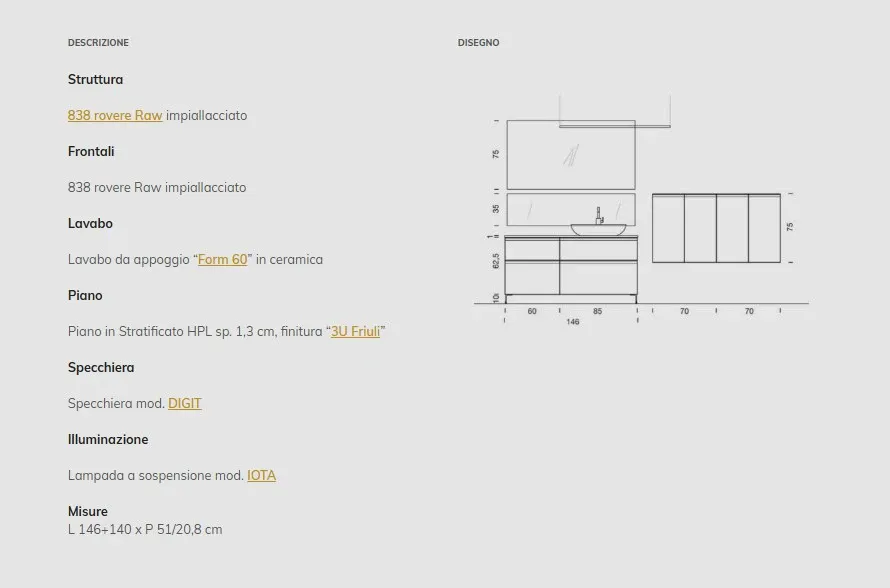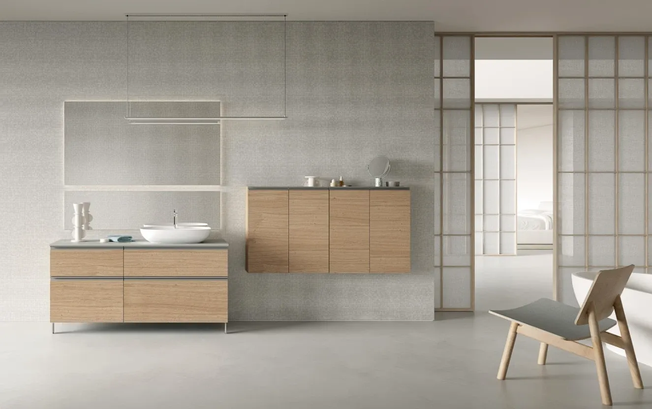 Bagno mod. BIK composizione 05 con frontali in legno rovere impiallacciato, piano in HPL stratificato e lavabo in appoggio in ceramica . Composizione l.146 e pensili l.140. Possibilità di personalizzarlo con misure e finiture anche in laminato o laccato.