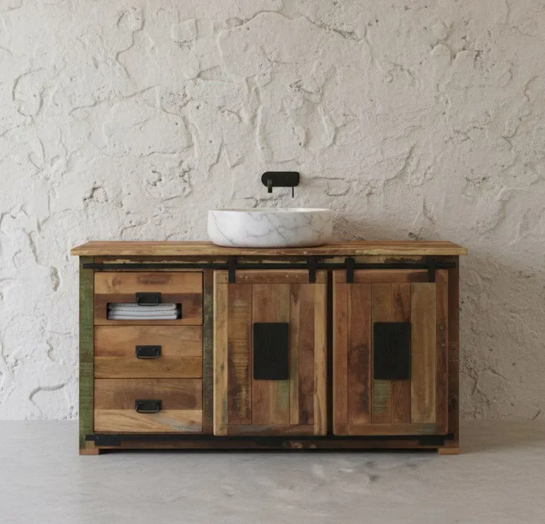 Credenza Jupiter 150, in legno massello riciclato con 2 ante scorrevoli su asta in ferro + 3 cassetti con maniglie in metallo
