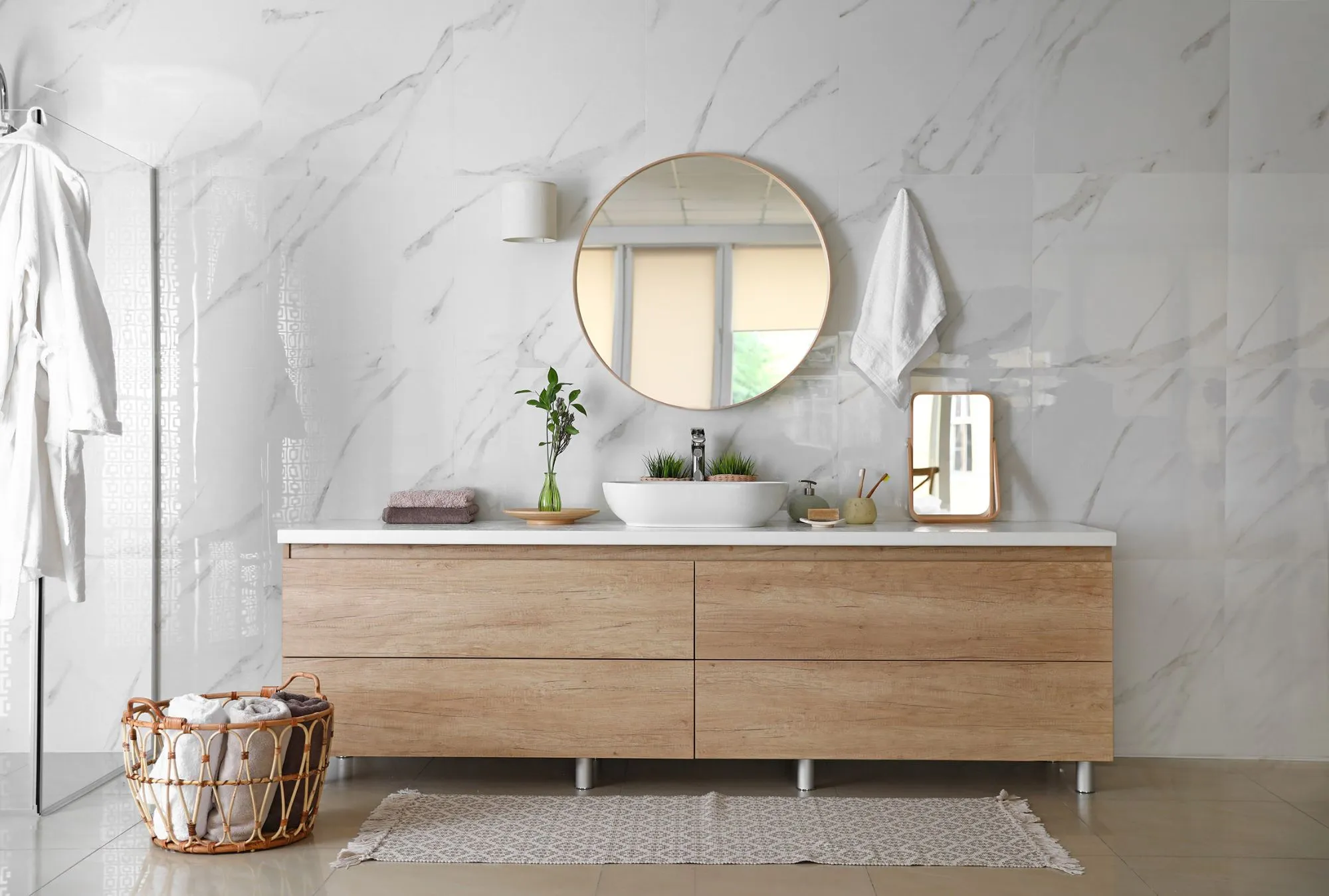 Composizione da bagno MobiLike modello Wilson, comprensiva di base con 4 cestoni, piano in agglomerato bianco assoluto, 1 lavabo d’appoggio e specchiera. Il mobile è realizzato in nobilitato rovere rustico. I cassetti sono montati su guide ammortizzate Blum ad estrazione totale per garantire la massima funzionalità e comodità. Sono inoltre attrezzati con sistema push/pull che ne permette l’apertura con una semplice pressione sul frontale dei cassetti, evitando l’istallazione delle maniglie. La specchiera è disponibile sia nella versione rotonda che rettangolare Il top è in agglomerato bianco assoluto spessore 3 cm. Su richiesta il mobile è personalizzabile, sia dal punto di vista delle misure che della finitura. Si può anche scegliere di sostituire il lavabo d’appoggio con un altro modello.