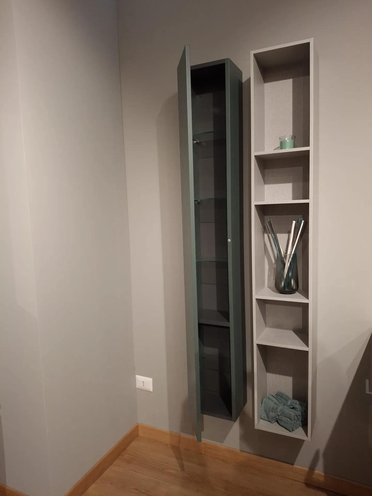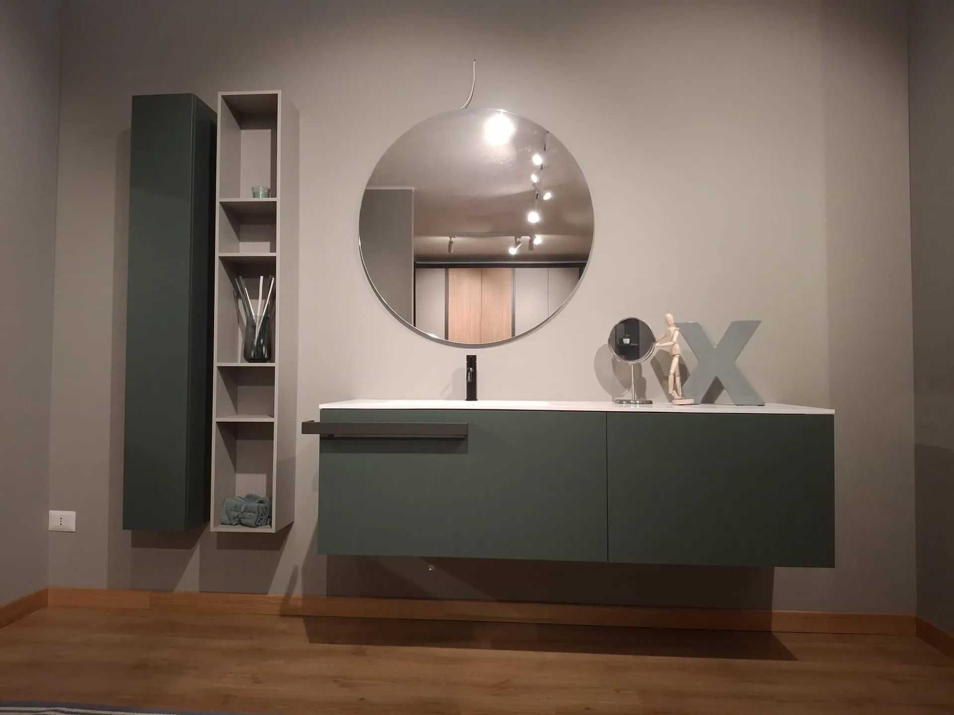 Bagno Cerasa mod. CARTABIANCA in finitura laminato garden opaco ed effetto materico polaris, composizione da L 250 cm (misura variabile e riducibile a 215 cm se tutti gli elementi vengono montati in linea) H 205 cm P 51 cm.