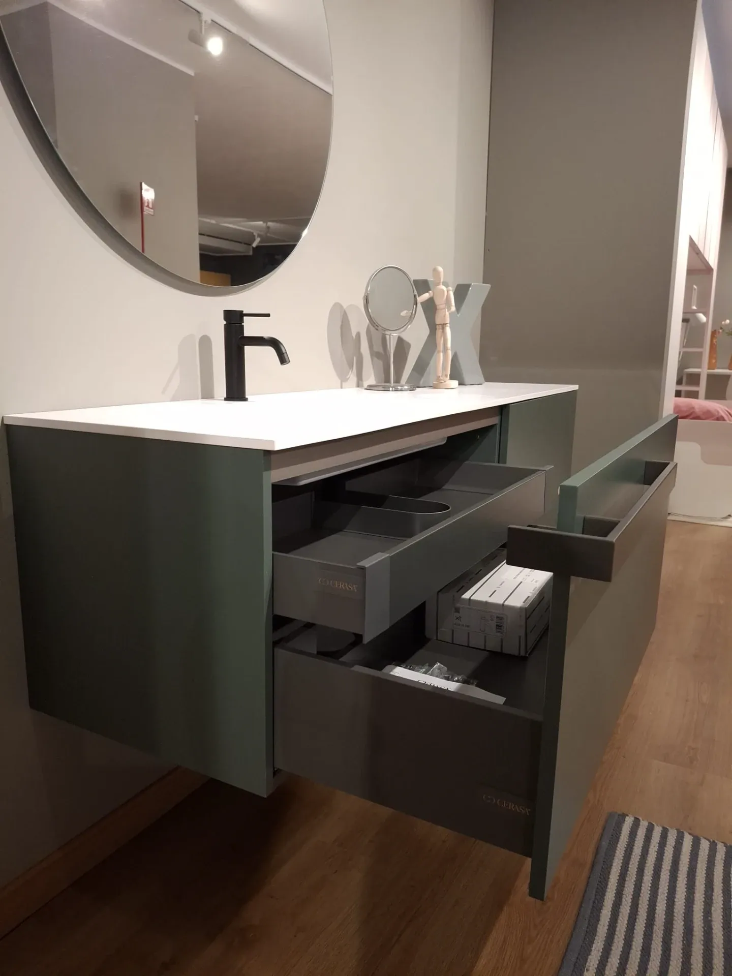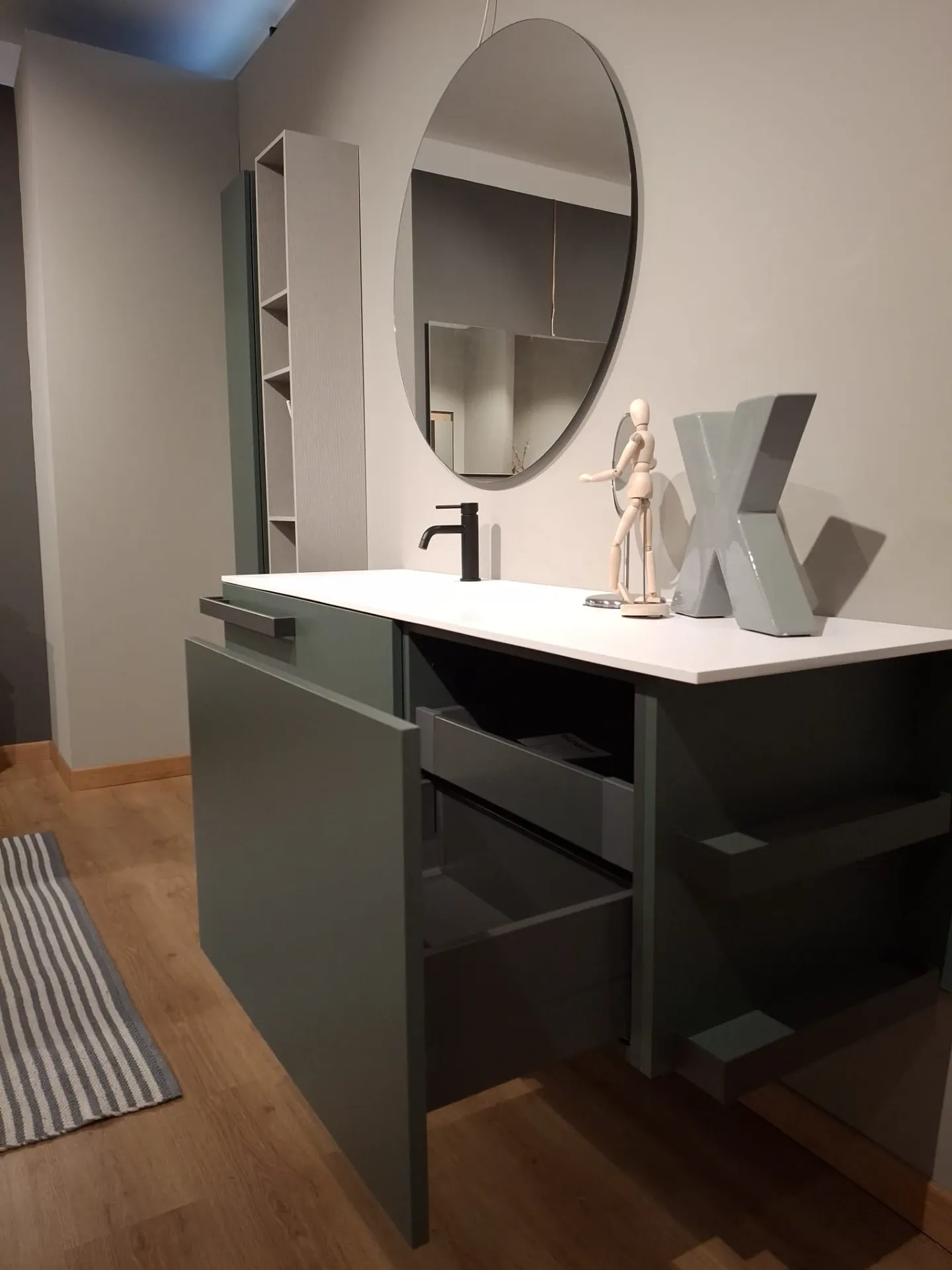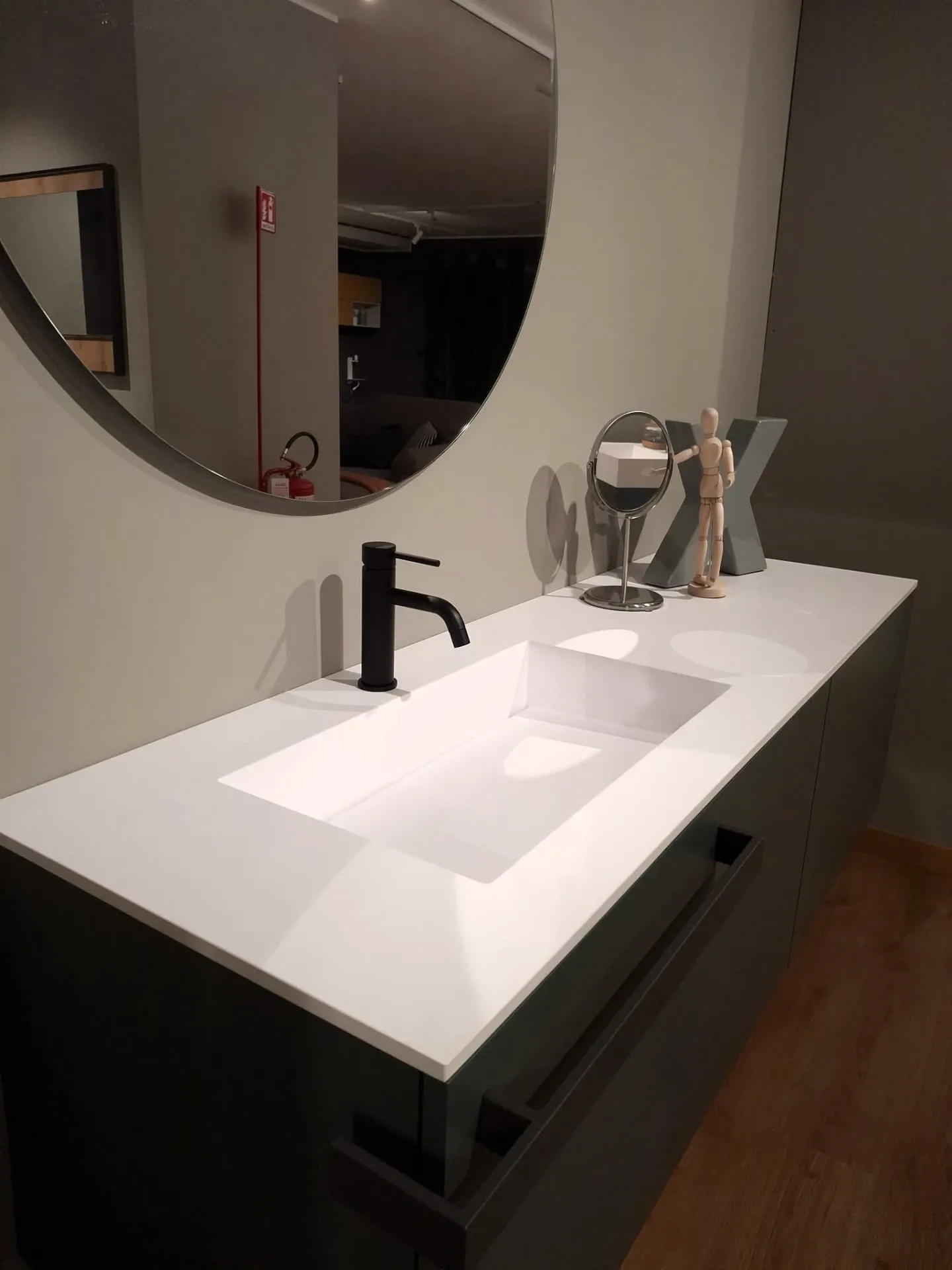 Con il fine di poter far fronte a svariate problematiche abitative, il marchio ha messo a punto una linea di mobili di differenti tipologie per la stanza da bagno; il modello mostrato in foto è un mobile sospeso, multifunzionale e spazioso.