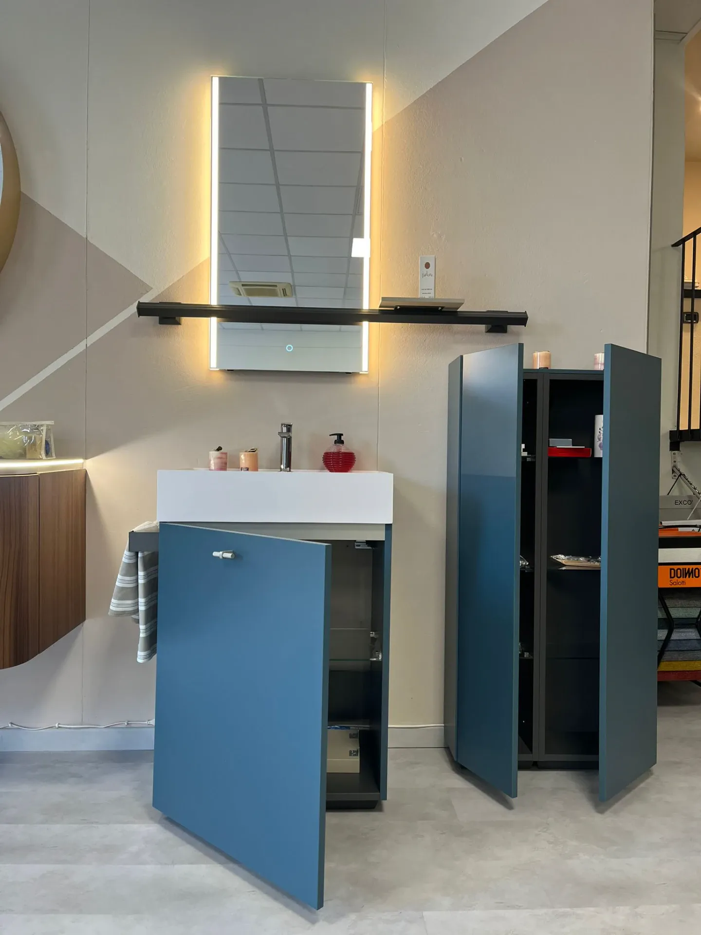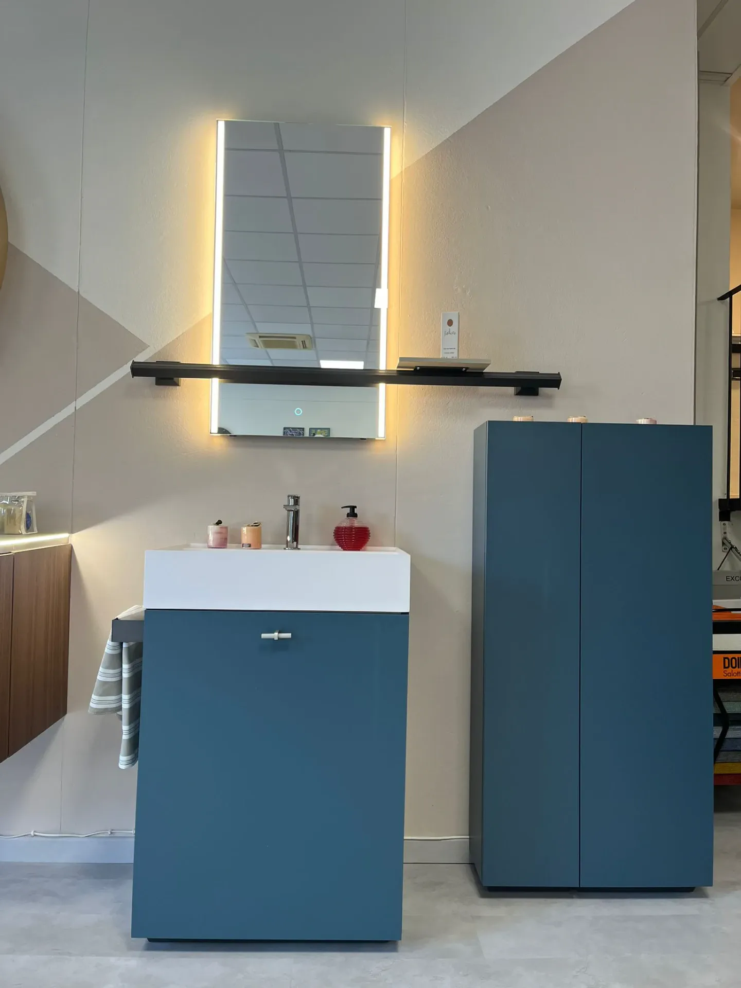 Protagonista della composizione è lo specchio illuminato, dotato di illuminazione frontale con regolazione della tonalità da luce calda a fredda, per adattarsi a ogni momento della giornata. Lo specchio è inoltre connettibile allo smartphone e consente la riproduzione audio, ideale per ascoltare musica o podcast durante la routine quotidiana.