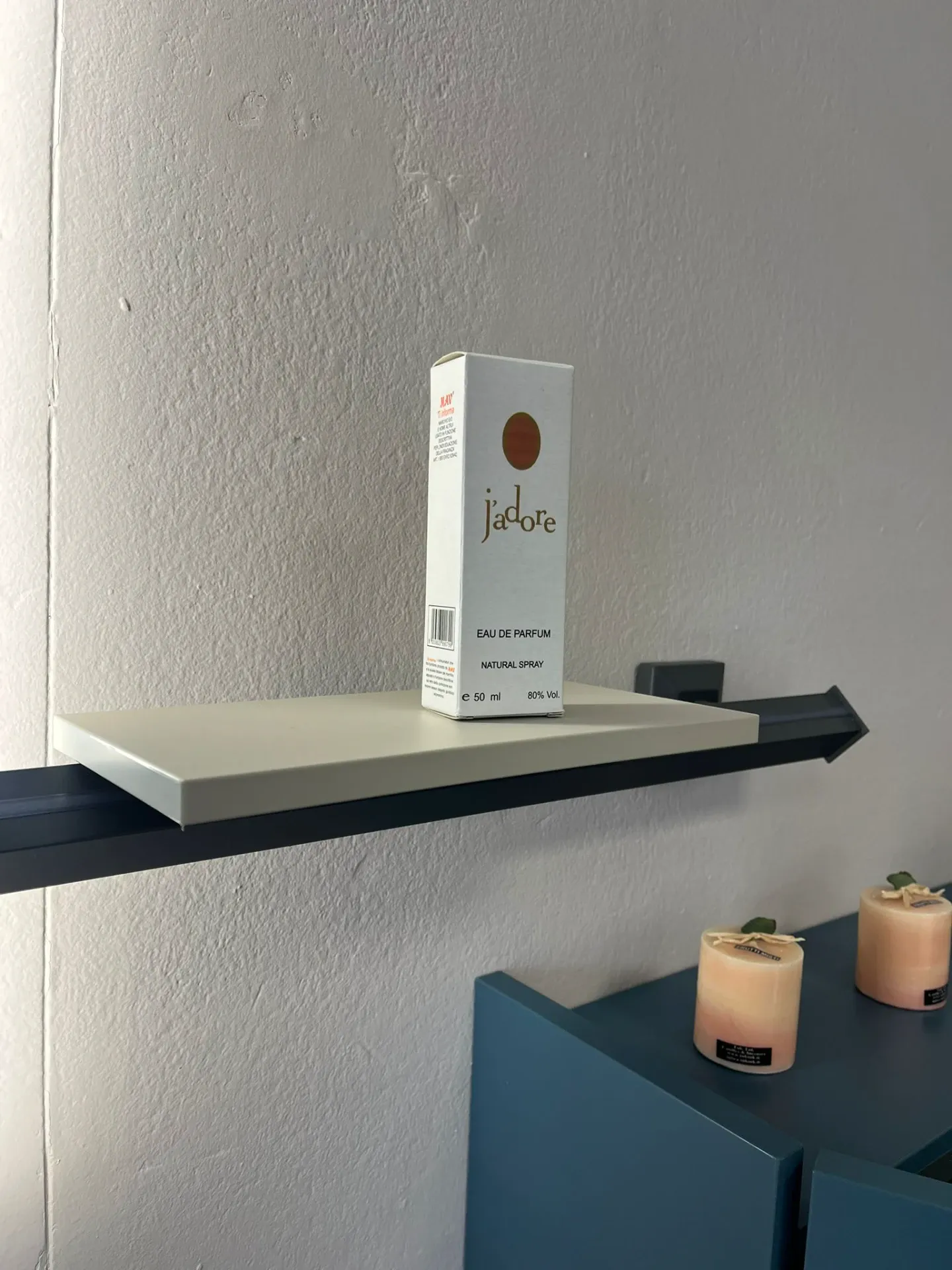 A completare l insieme, la barra Kako porta-oggetti in metallo antracite, che attraversa lo specchio con un segno grafico deciso e funzionale, abbinata a una mensolina in finitura sabbia (L25, P12, H1,2 cm), perfetta per organizzare gli oggetti di uso quotidiano.