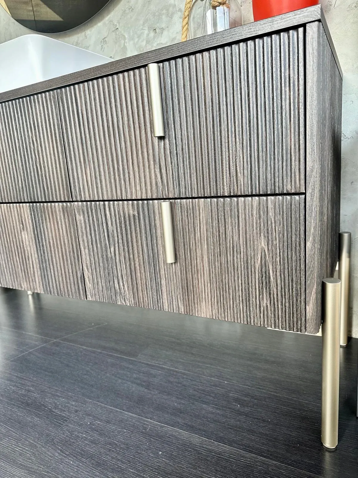 Bagno composto da due basi con due cestoni in finitura 188x Thermo A polimerico con maniglie verticali finitura bronzo come i piedi di appoggio.