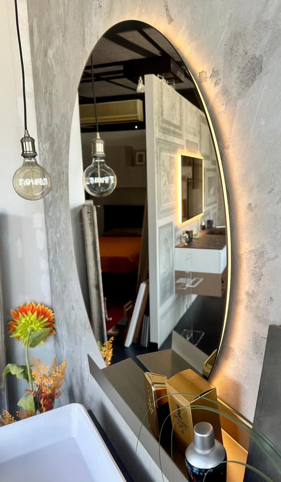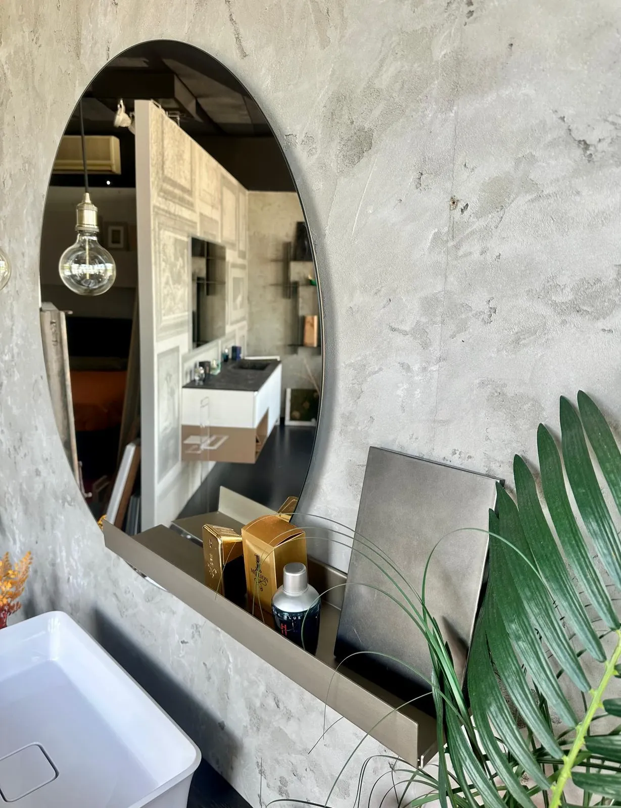 Specchio tondo a parete retroilluminato con mensola BLADE in finitura bronzo, creata per adattarsi agli specchi a muro.