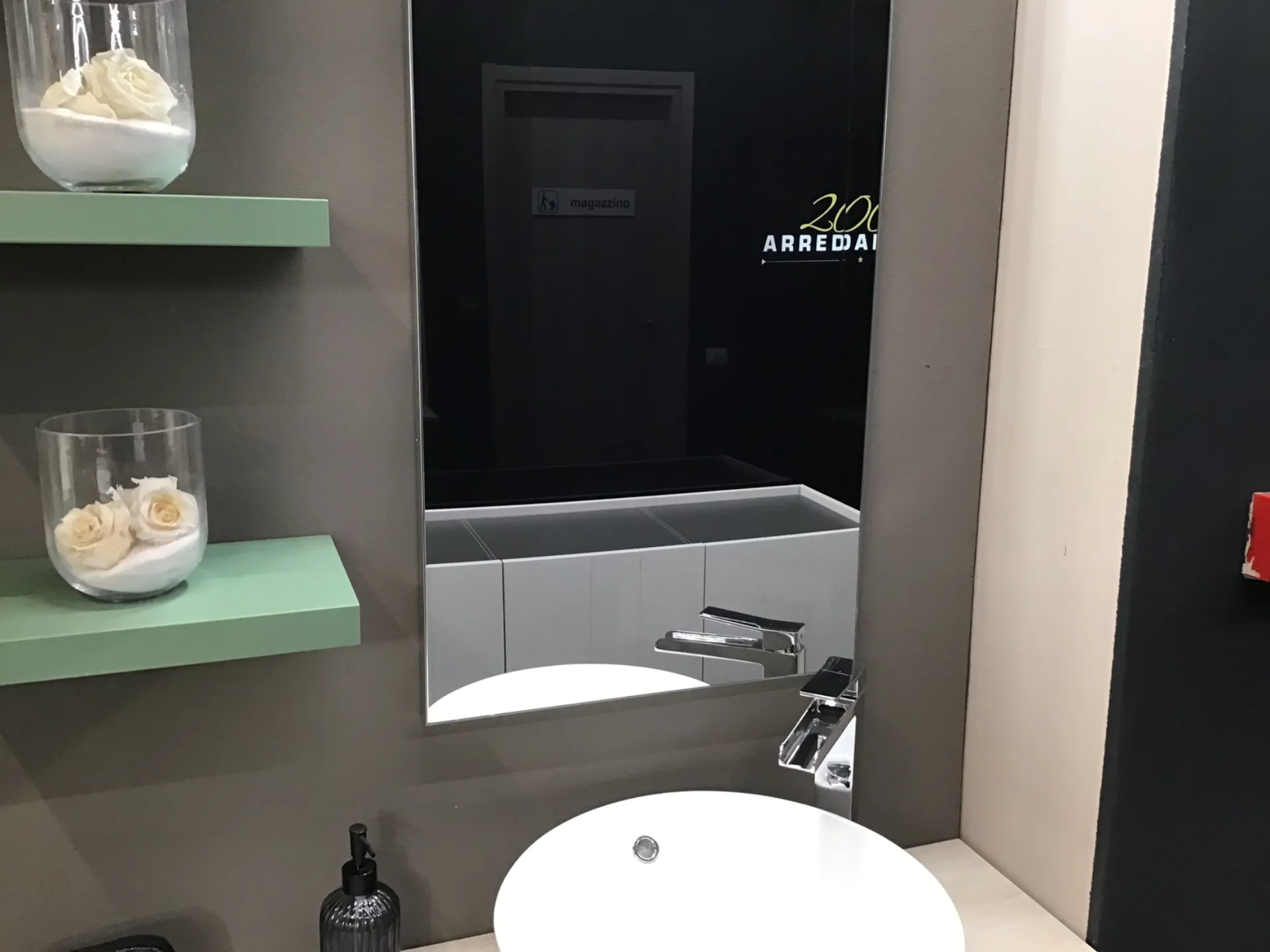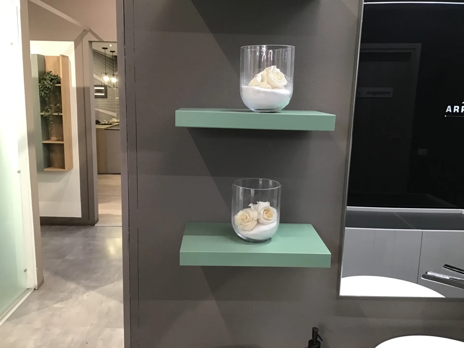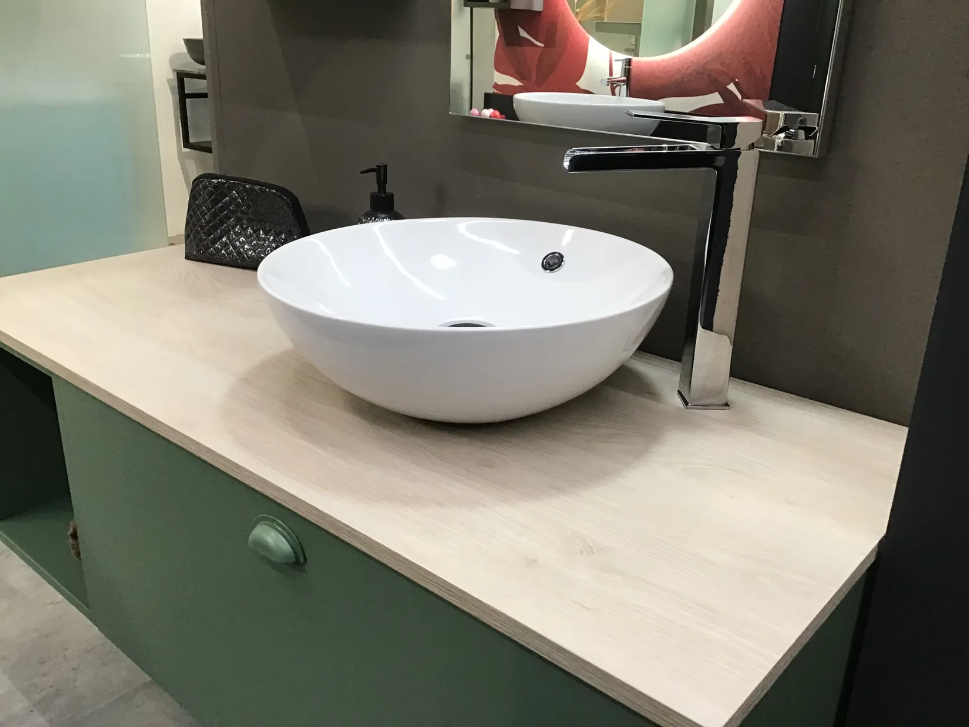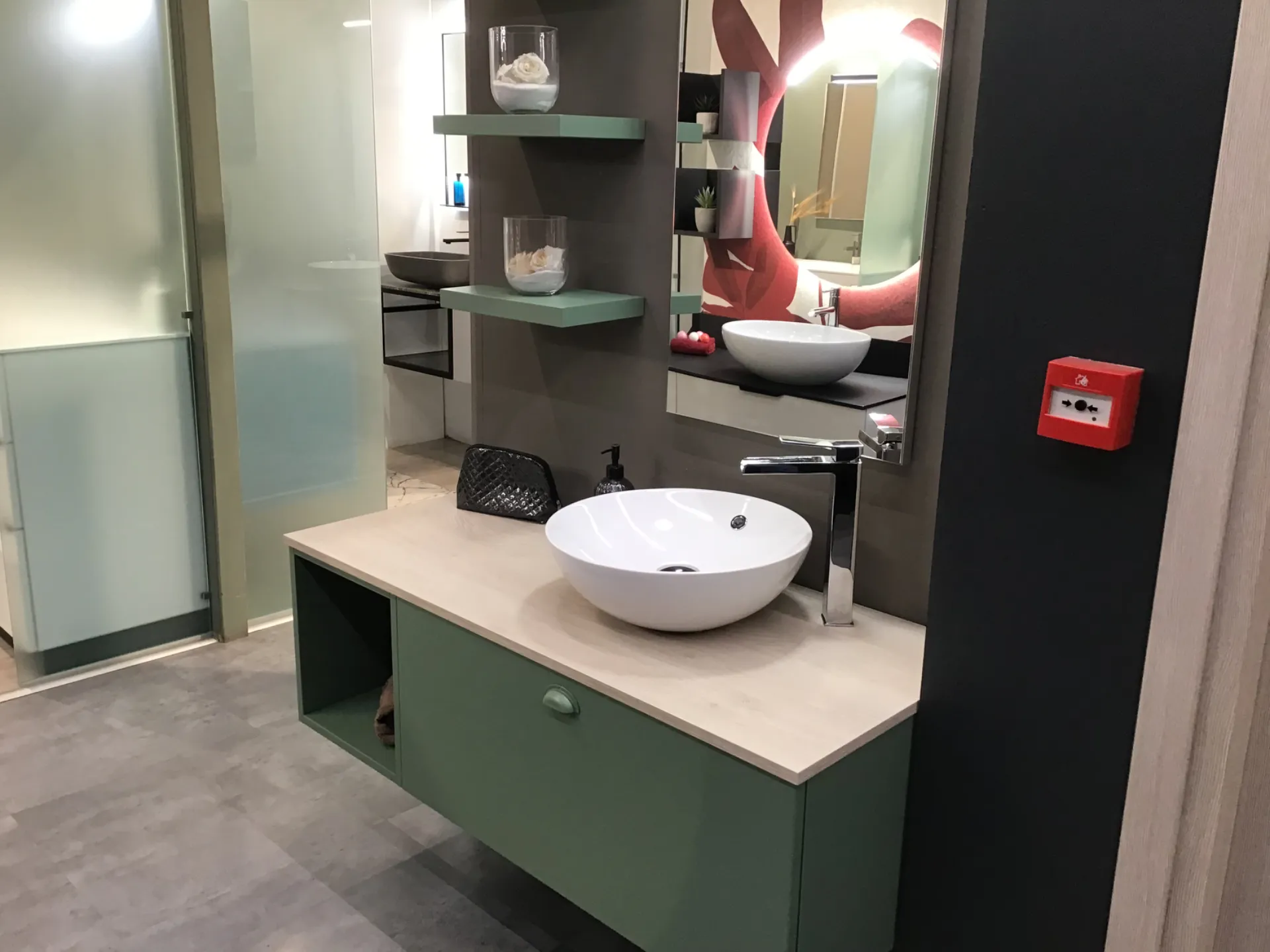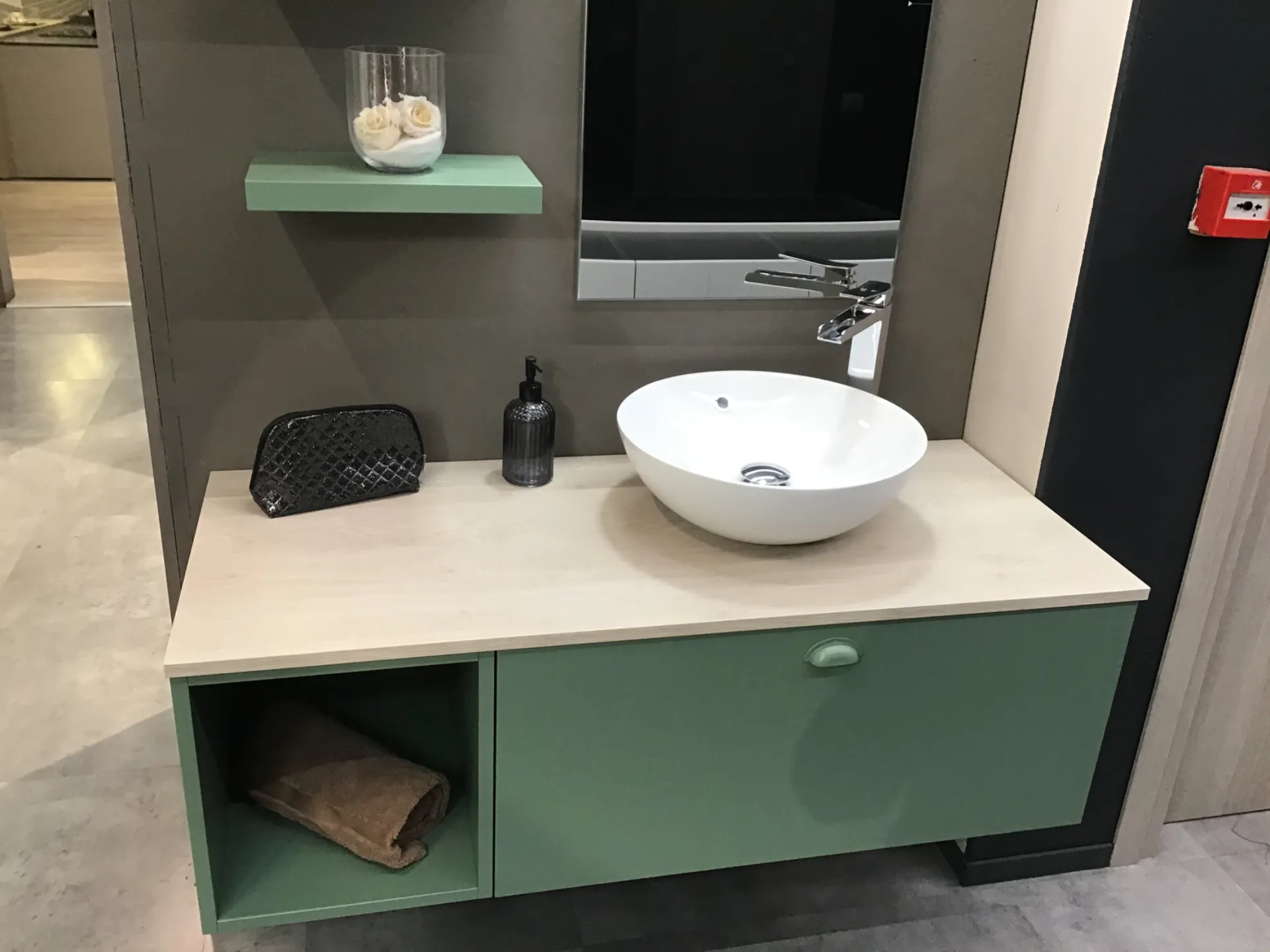 BAGNO STRUTTURA LODEN OPACO, MANIGLIA MEZZALUNA LACCATA, LAVABO CASTILLON IN CERAMICA, SPECCHIERA MOD. WAP FINITURA BRILL, MENSOLE LODEN OPACO, TOP SETA 210 SP. 1,8 CM.