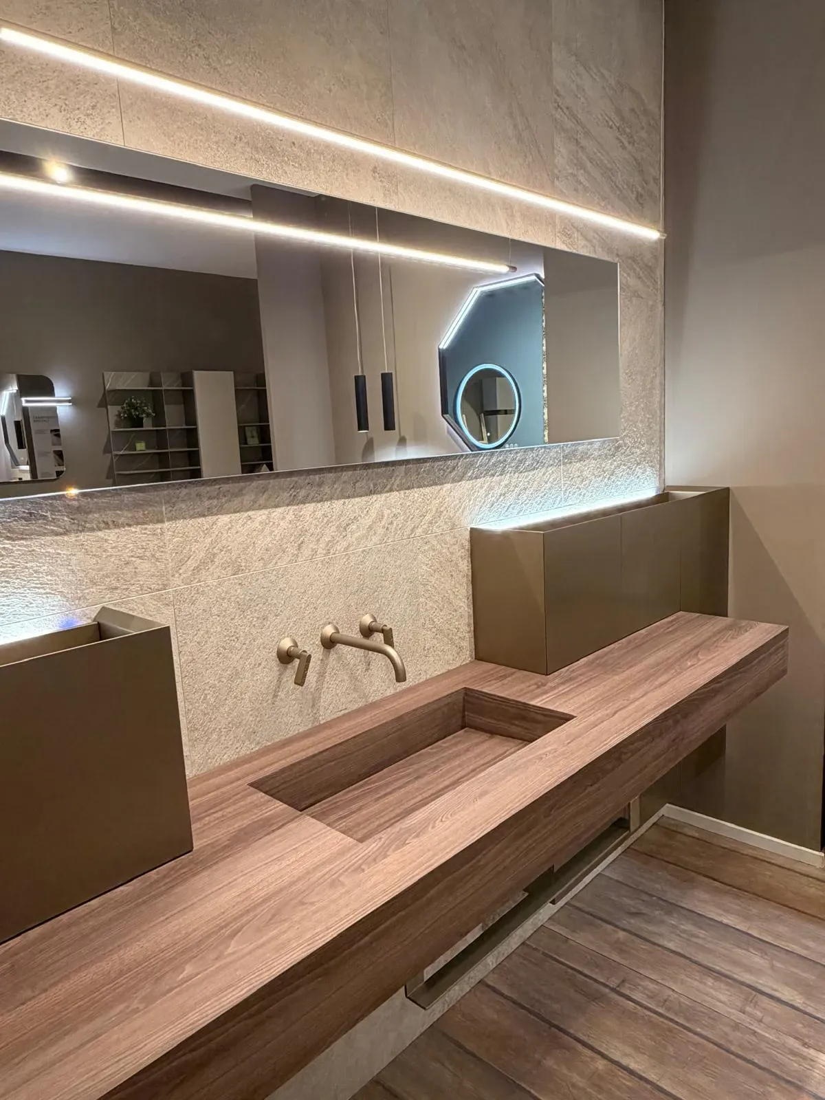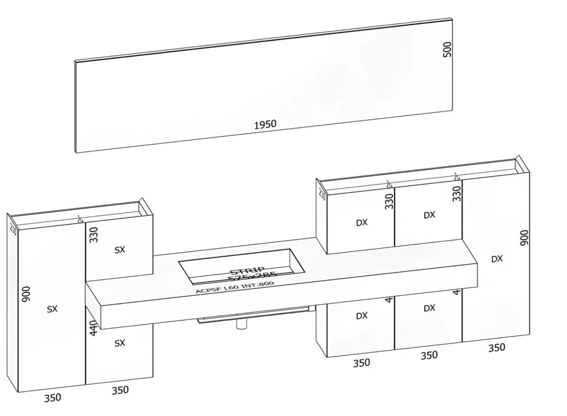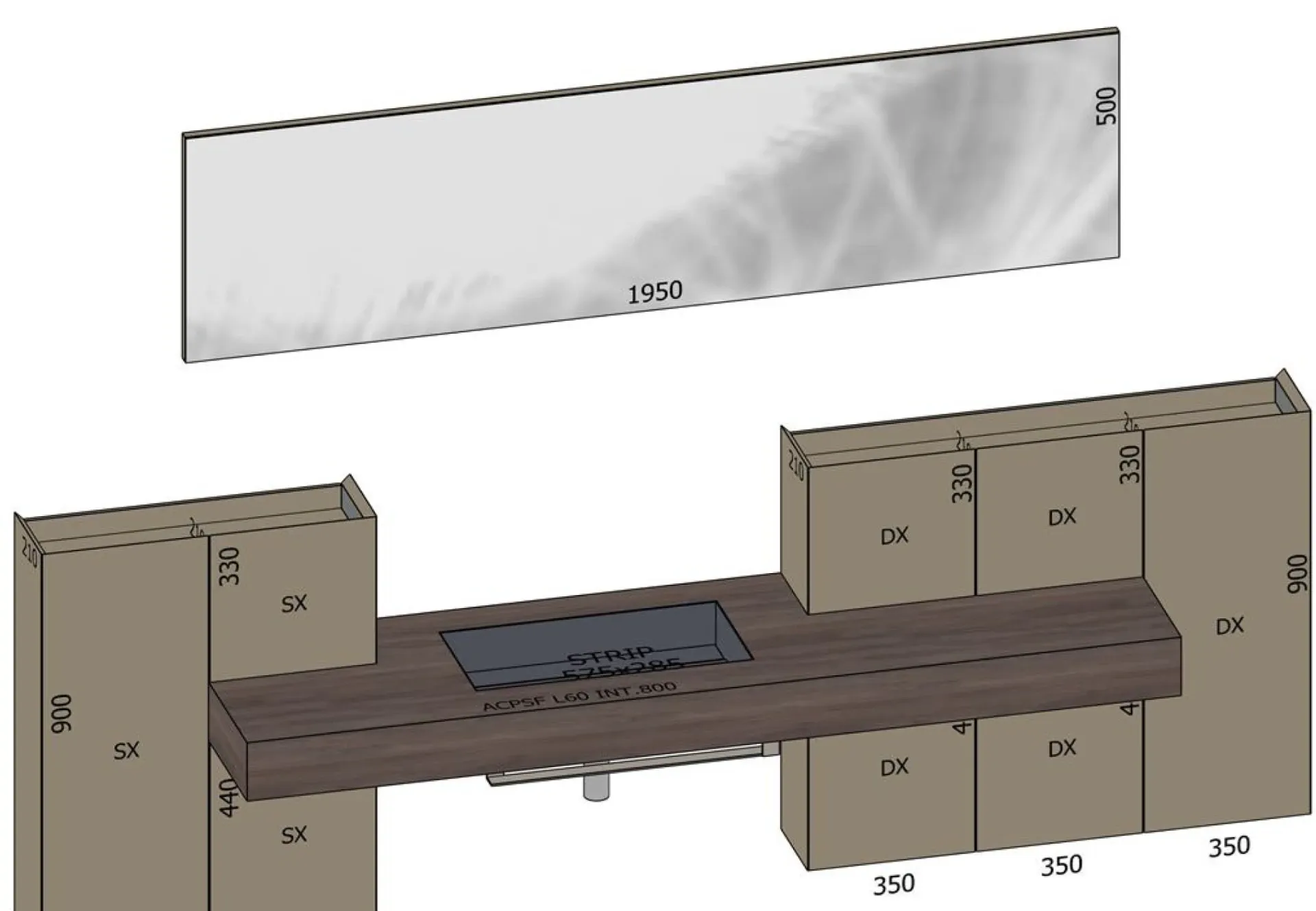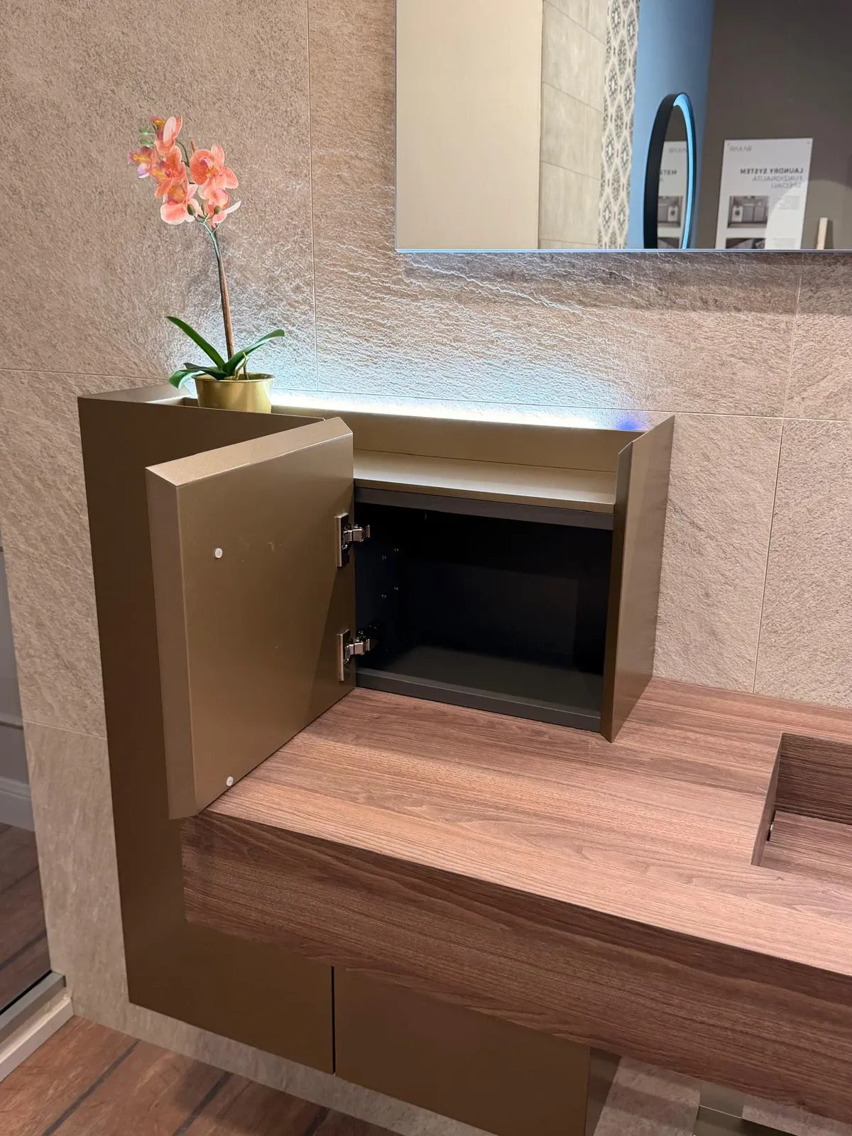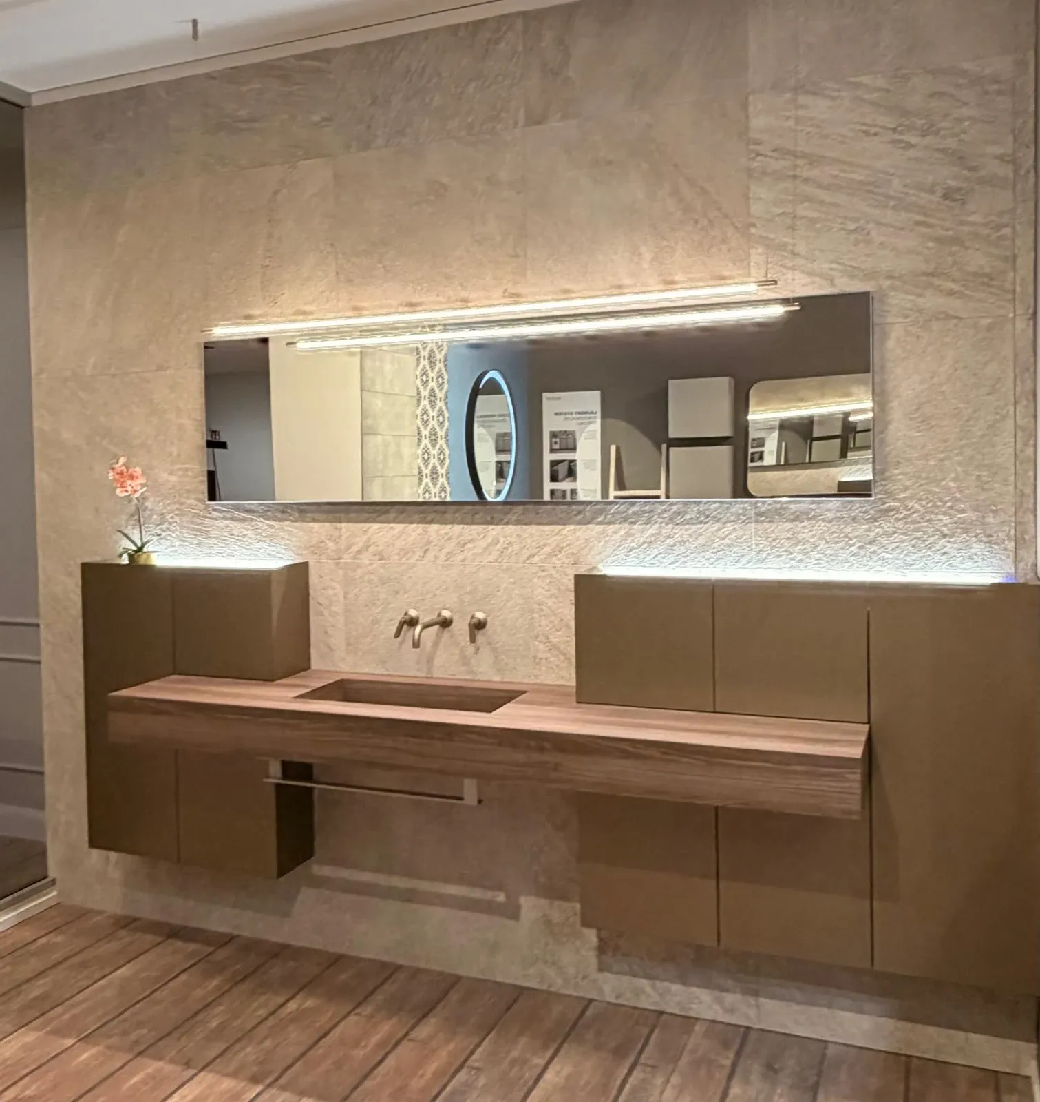 Composizione bagno con boiserie ad ante profondità 19 cm con led. Specchio con led, no rubinetteria.