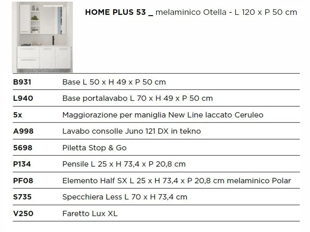 Arbi arredo bagno presenta Home Plus la linea di mobili arredo bagno per soddisfare l' esigenza di stile, design e funzionalità offrendo un ottimo rapporto qualità-prezzo . Visita il sito ufficiale Arbi per conoscere tutti i prodotti di questo nostro storico fornitore. Nella sede espositiva di Lissone promozioniamo l' intera gamma Home Plus. Nell' esempio: composizione Home Plus 53 melaminico Otella, maniglie laccate Ceruleo. Dimensioni cm. 120x50. Offerta riferita a composizioni di ri-ordino. No merce outlet esposta. Trasporto e montaggio esclusi e preventivabili per le aree di Milano - Monza e limitrofi. Contattaci per conoscere tutte le promo 2026. Luigi Fontana Arredamenti Lissone.