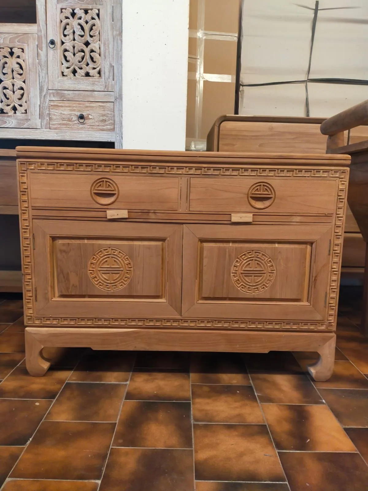 Mobile Bagno Oriente 100, mobiletto in legno di teak massello intagliato a mano da artigiani indonesiani, con una mensola interna. Dispone di 2 ante intagliate e decorate a mano, 2 cassetti.