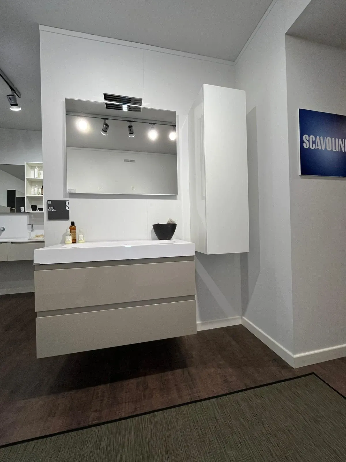 Composizione bagno Scavolini modello Juno dal design moderno ed legante, realizzata in finitura laccato lucido color visone. Il mobile sospeso con maniglia integrata a forma di J dona leggerezza estetica e praticità d'uso. Completa la composizione il lavabo monoblocco da 90cm, lo specchio con illuminazione e l'armadietto laterale in vetro bianco lucido