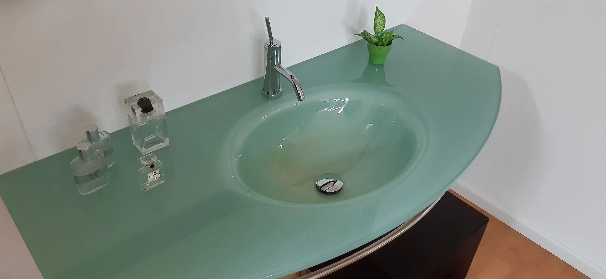 Il mobile è realizzato in legno Wengè con un elegante piano in cristallo bianco lucido e lavabo integrato, che unisce resistenza e design moderno.