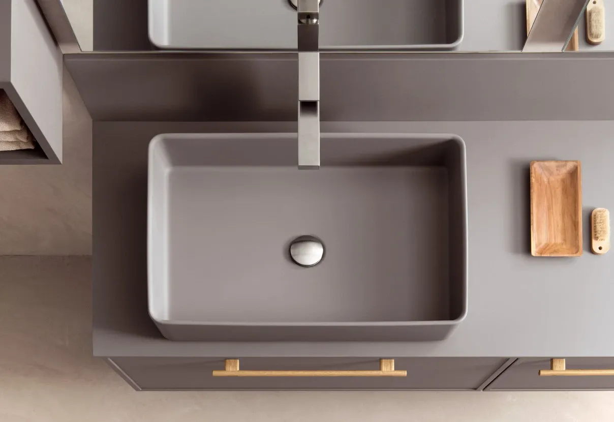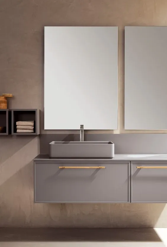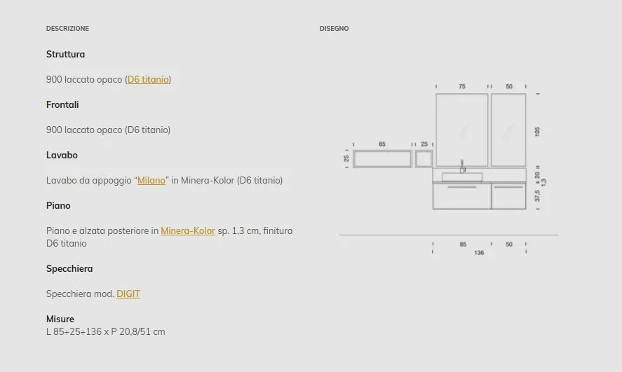 Bagno mod. PICTA composizione 01 con frontali in Laccato Opaco, piano e lavabo in Minera-Kolor . Composizione l.136 per base e l.110 per vani a giorno. Possibilità di personalizzarlo con varie misure.
