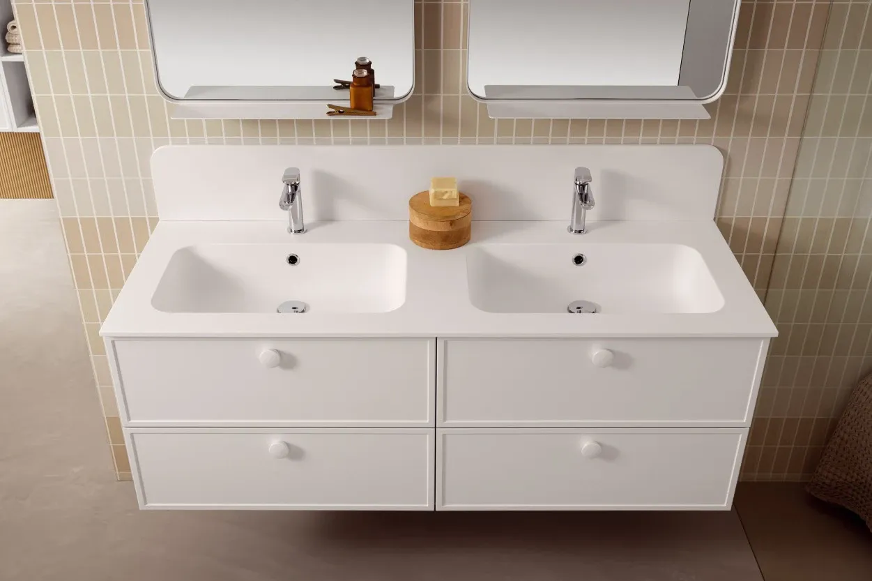 Bagno mod. PICTA composizione 02 con frontali in Laccato Opaco, piano in Mineralguss Bianco opaco con 2 vasche integrate . Composizione l.1140.5 per base e l.70 per pensile. Possibilità di personalizzarlo con varie misure e colori.