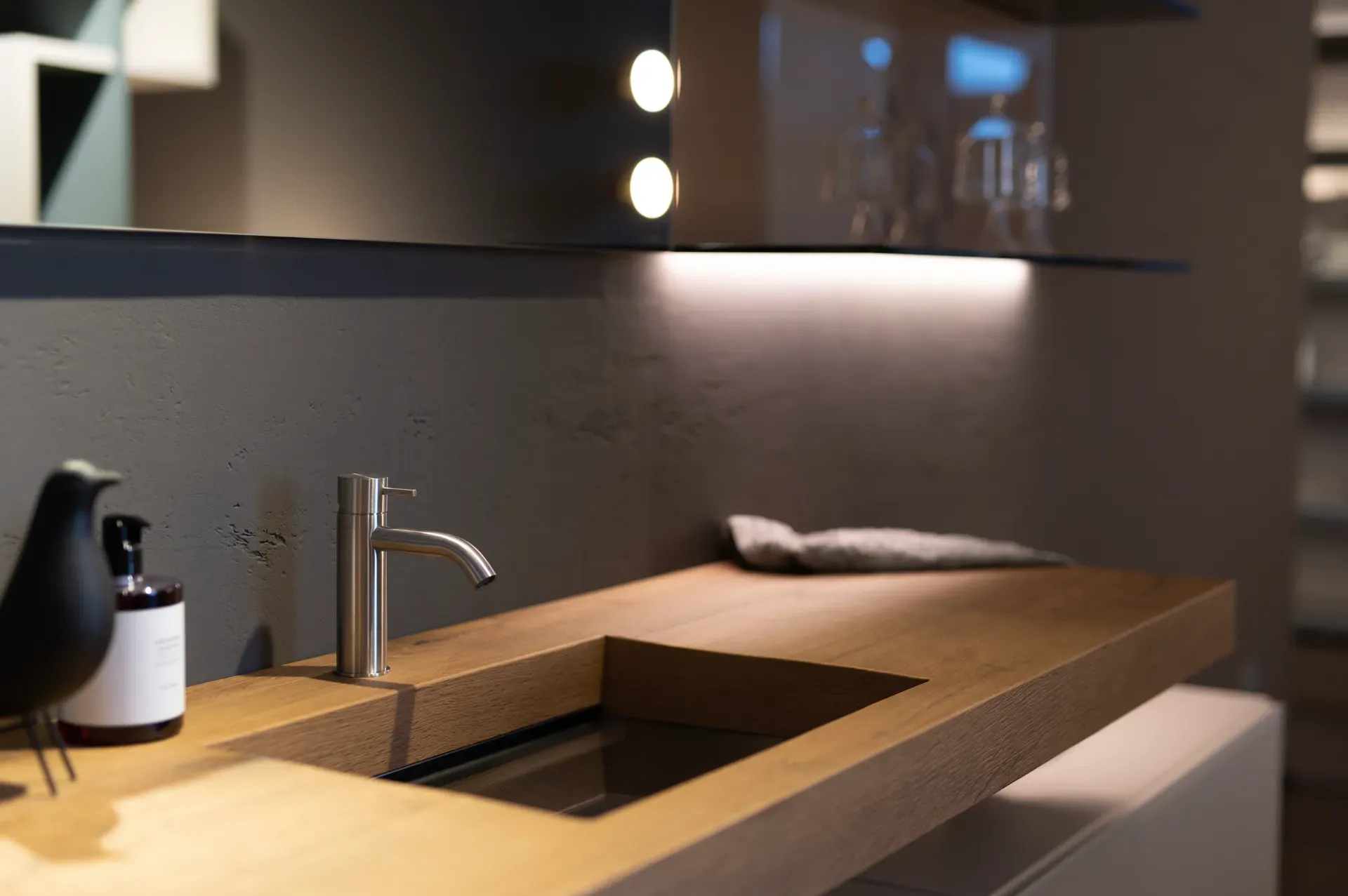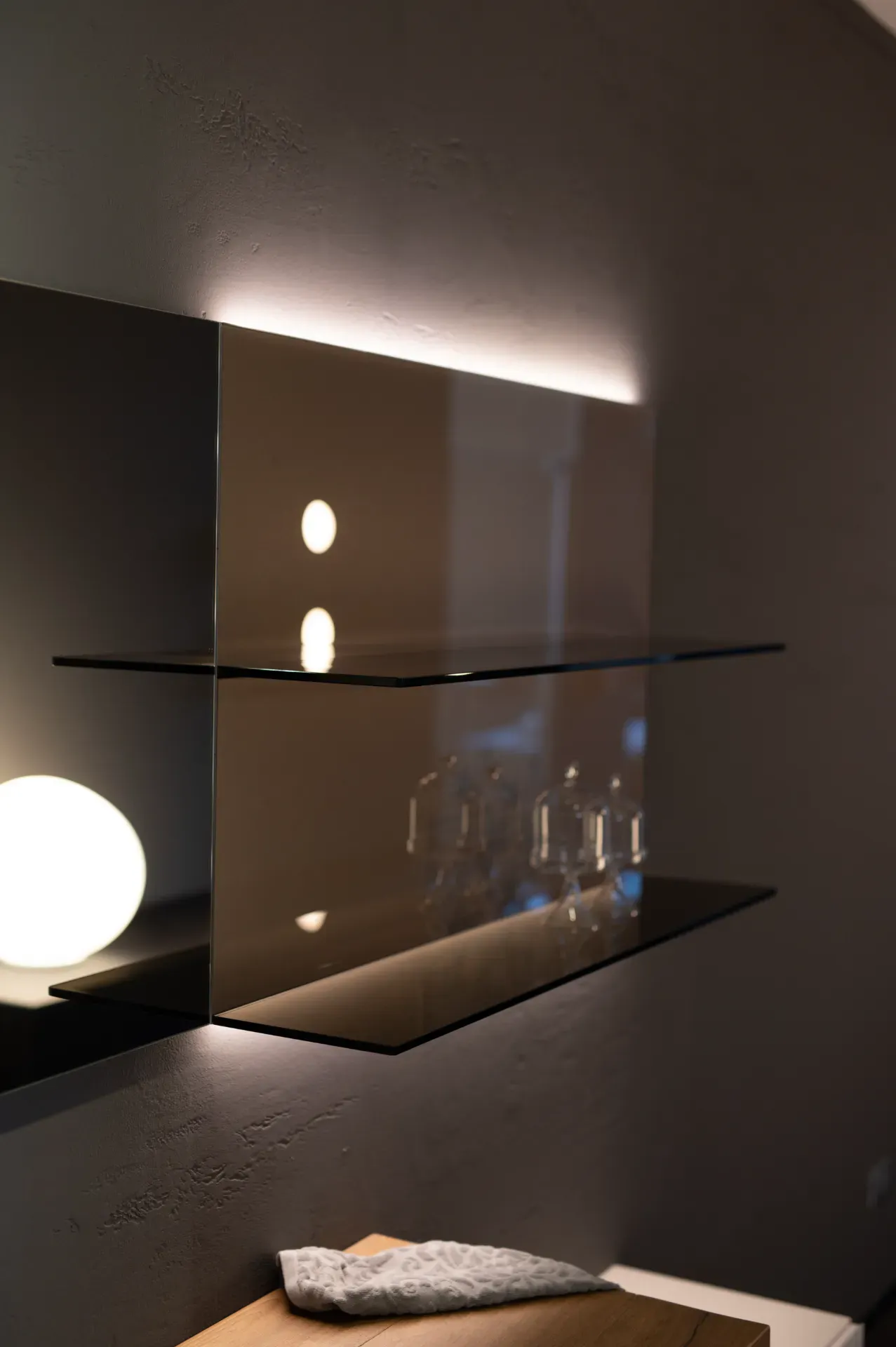 Bagno composto da: lavabo Depth finitura ww.naturale con specchio vasca singola L.147,2x8x52cm, specchiera L.110,1x73,3x2,3cm, glasserie_shelf completa di n.02 mensole fin.ripiani vetro lucido fumè bronzo e schiena fin.vetro lucido champagne metal. Completa di illuminazione sopra e sotto e n.01 contenitore cestone 36e8 sospeso L.110,4 Con frontale fin.vetro lucido cocco interno cassetto fin.carta pomice. Completo di miscelatore.