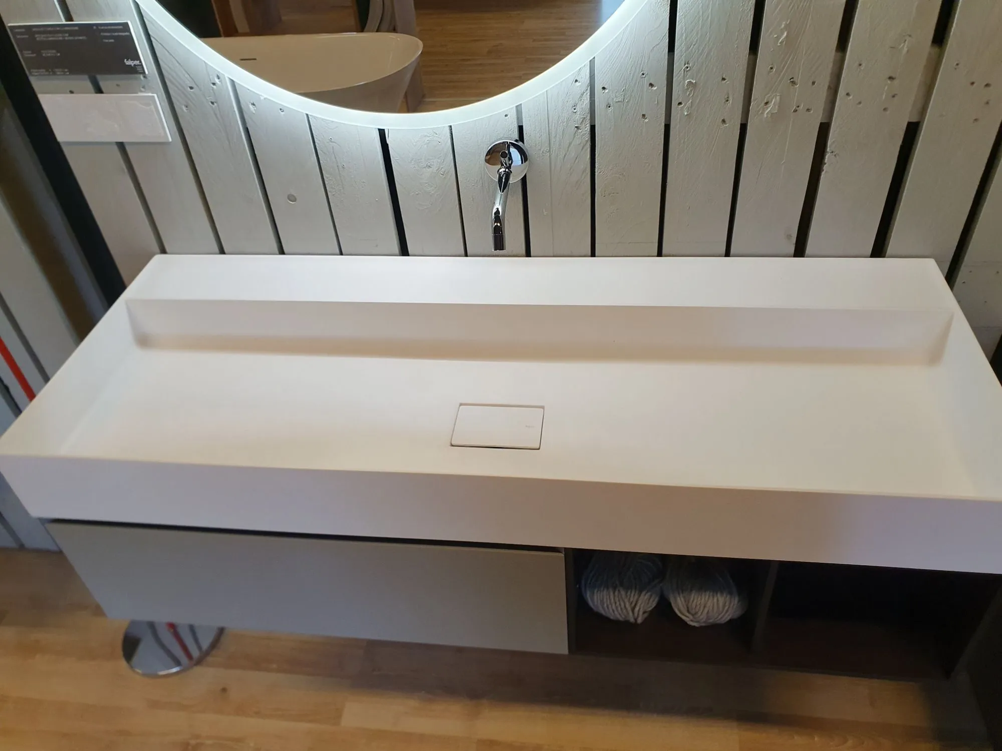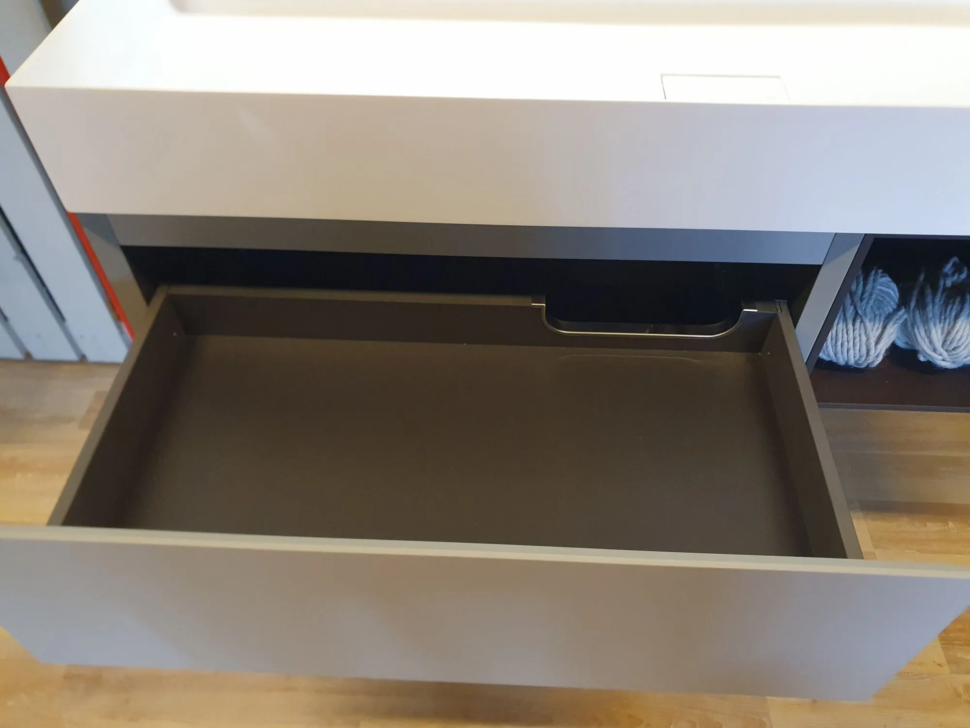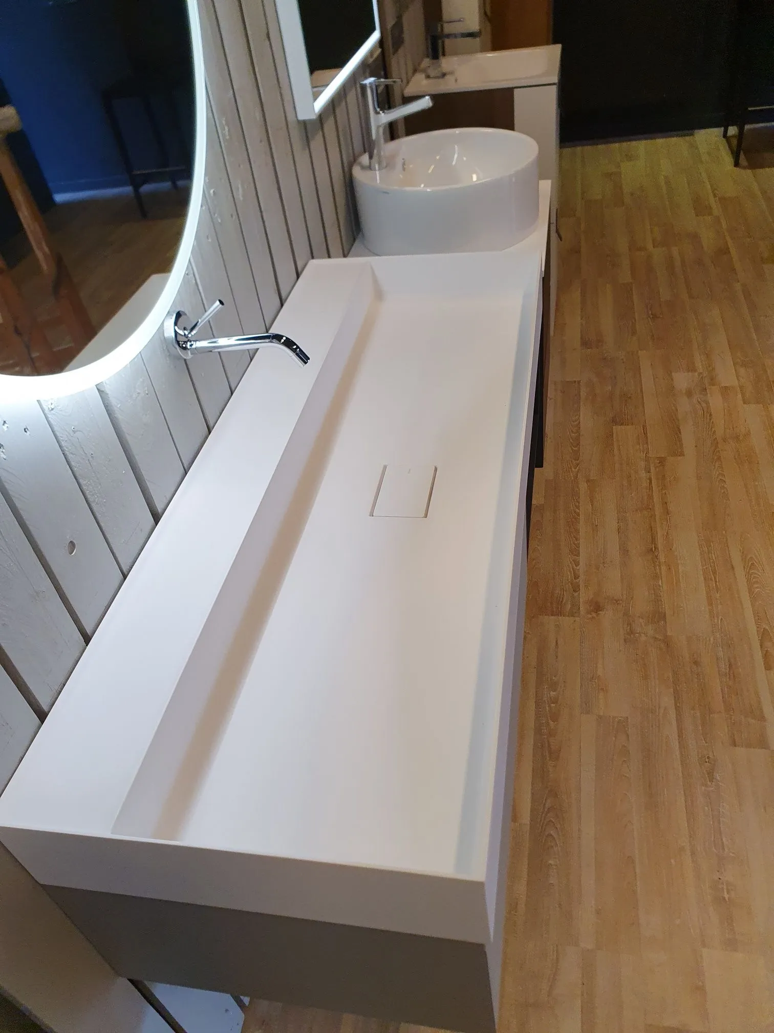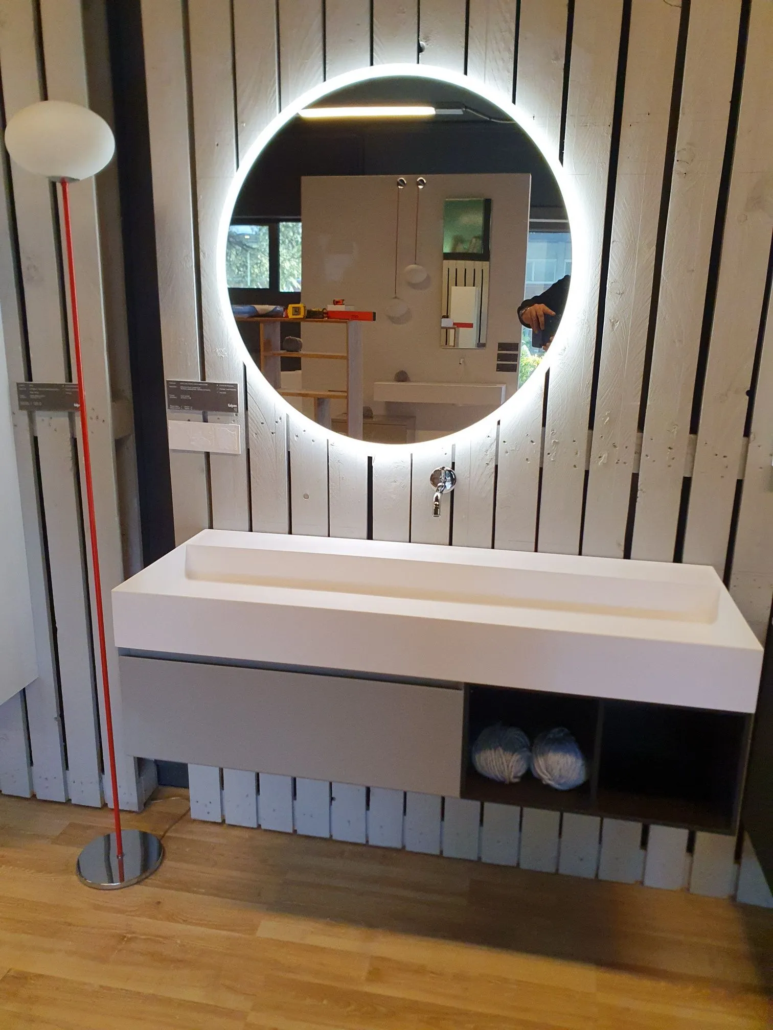 Mobile Quattro.Zero con un cassetto e vano a giorno in legno. Colori: Laccato Grigio Pioggia Opaco + Legno Noce Canaletto scuro Dimensioni: 120 x 45 x H 25+12 Lavabo in Ceramilux bianco Opaco, possibile foro per rubinetto sul piano. Provenienza: Expo Falper