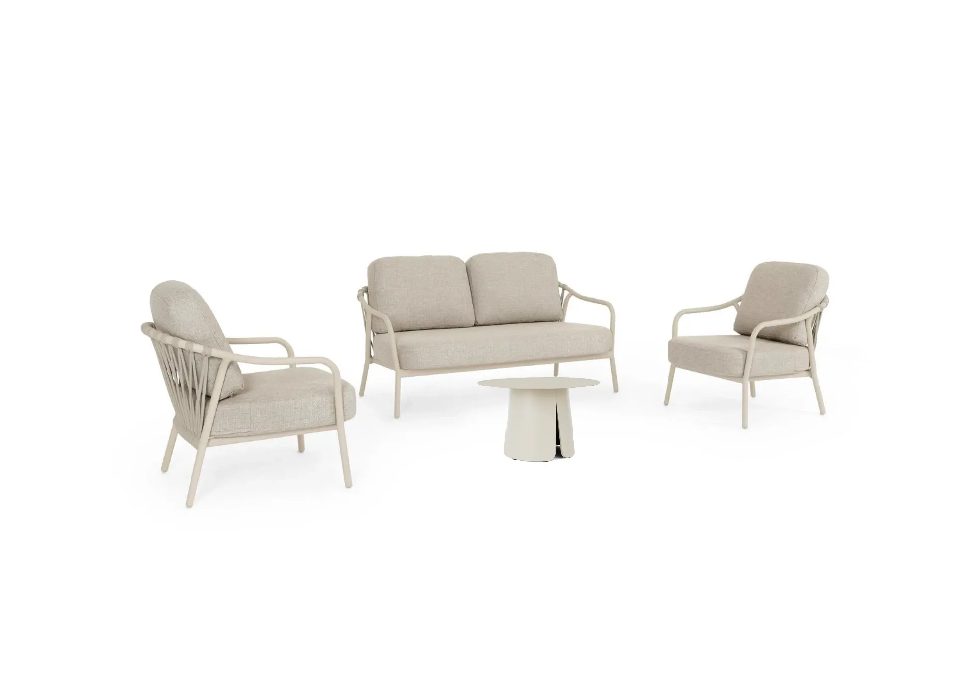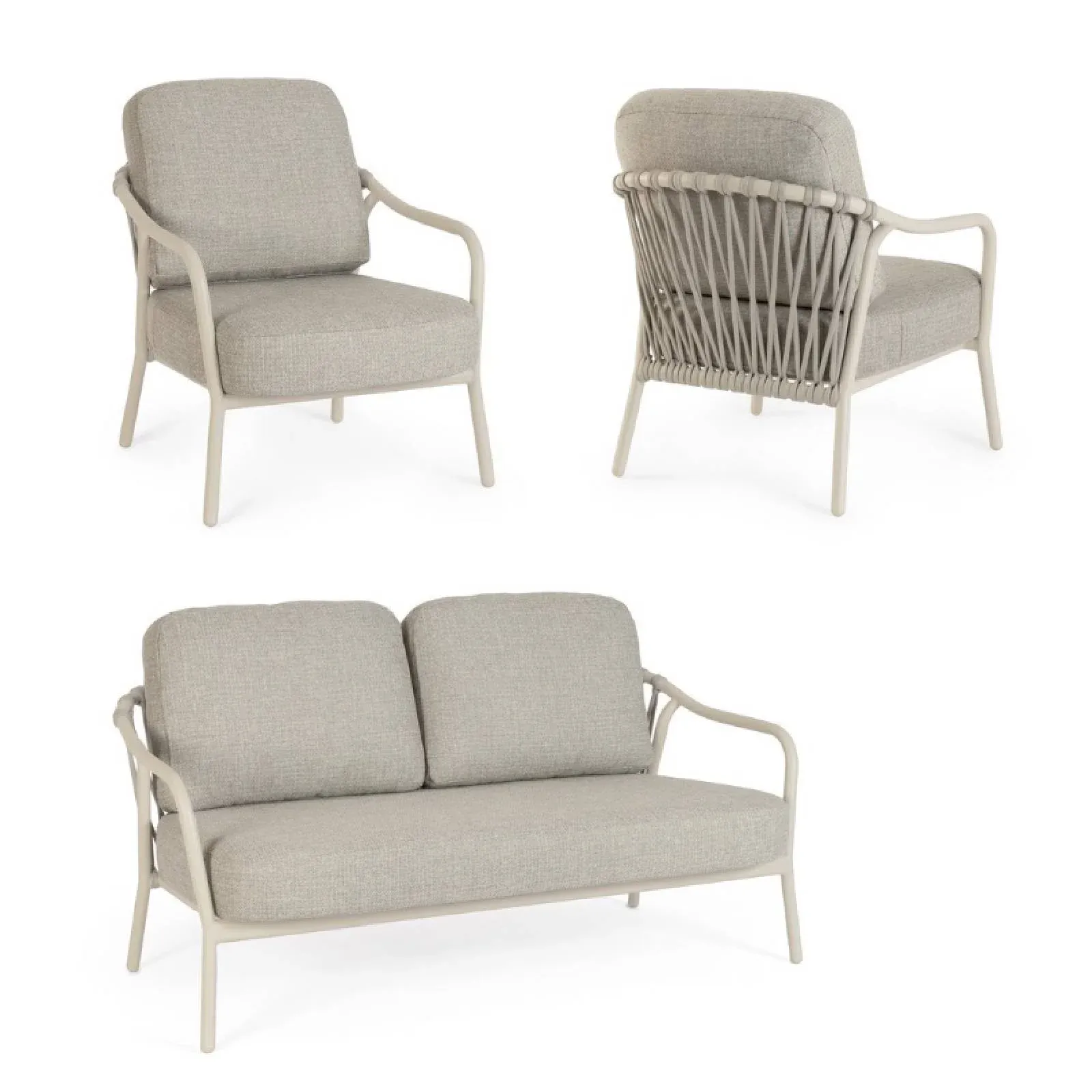 STRUTTURA IN ALLUMINIO VERNICIATA A POLVERE (POLIESTERE). SCHIENALI CON INTRECCIO IN CORDA OLEFIN. CUSCINI SFODERABILI CON TESSUTO IDROREPELLENTE OLEFIN (100% POLIPROPILENE).
