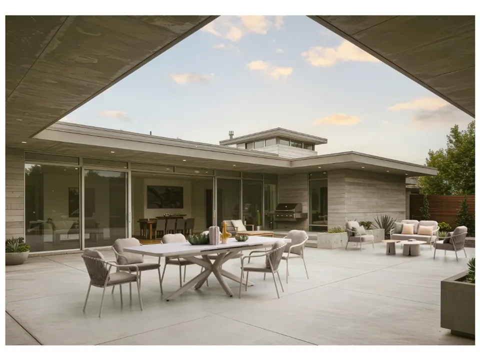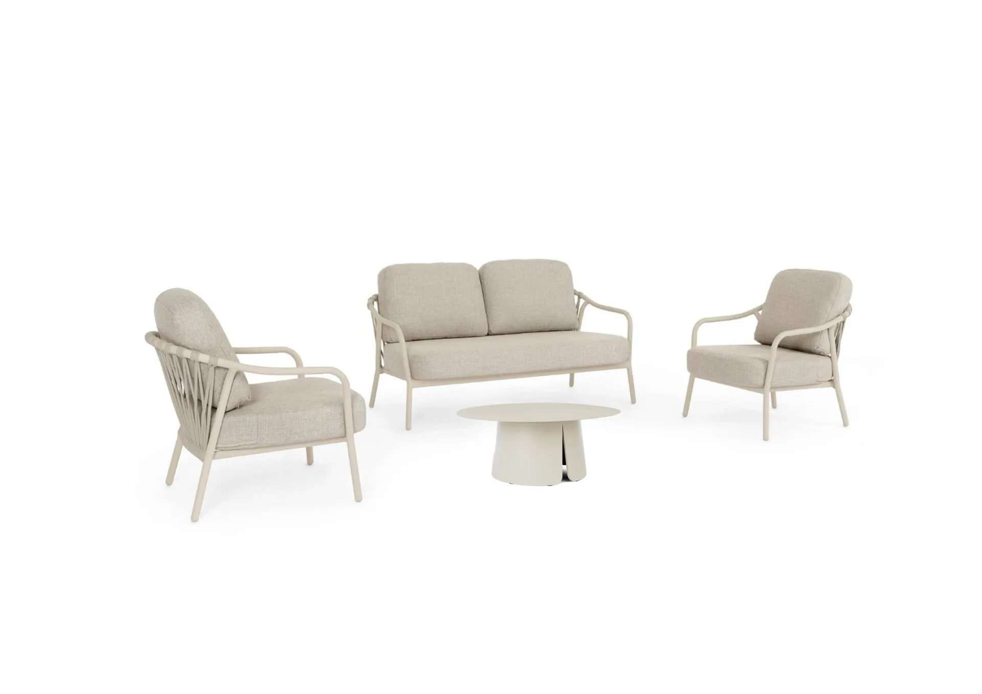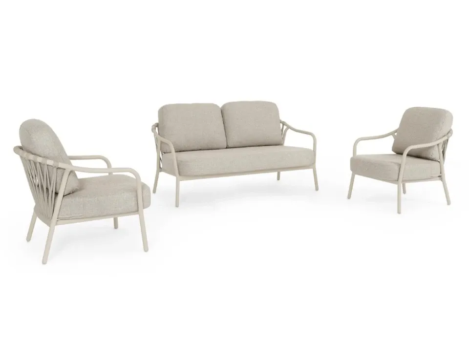 STRUTTURA IN ALLUMINIO VERNICIATA A POLVERE (POLIESTERE). SCHIENALI CON INTRECCIO IN CORDA OLEFIN. CUSCINI SFODERABILI CON TESSUTO IDROREPELLENTE OLEFIN (100% POLIPROPILENE).