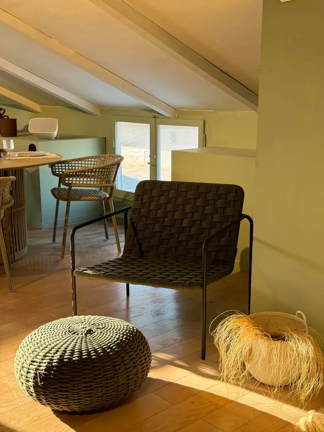 Poltrona di dimensioni minime ma di grande impatto, design puro in uno spazio ridotto. Questa poltrona con braccioli può essere abbinata al tappeto tondo verde e al pouf venduti a parte e non inclusi in questa offerta.