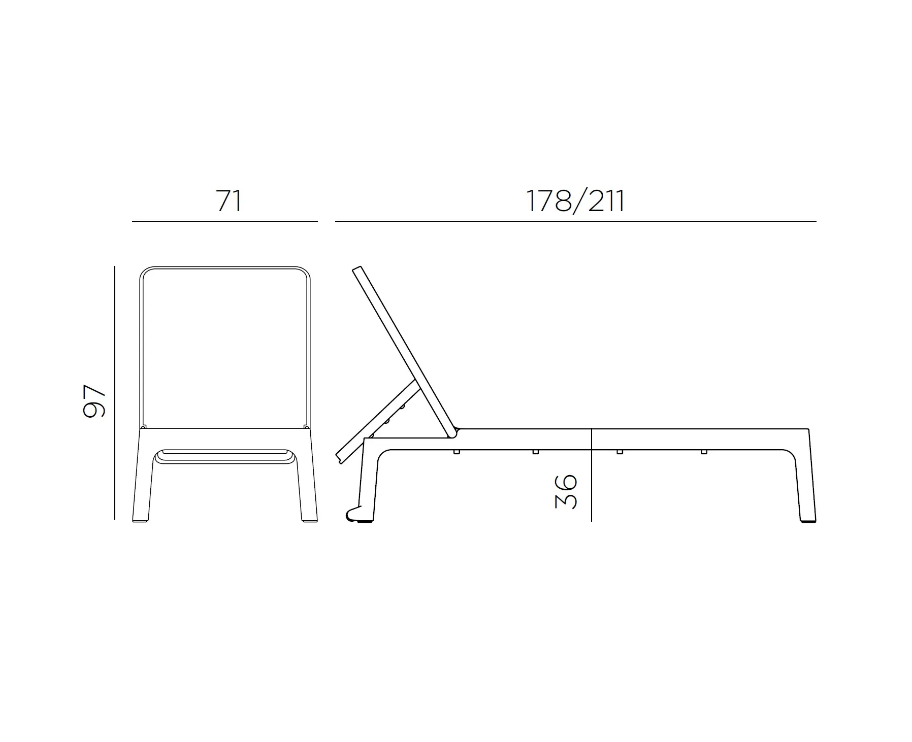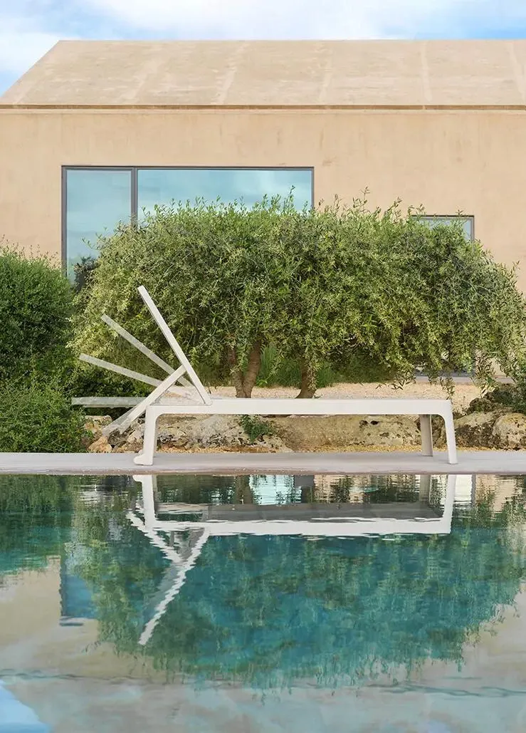 Lettino prendisole dalle linee pulite e armoniose unite a una superficie d appoggio ampia e accogliente. Schienale regolabile in quattro posizioni fino alla completa planarità.