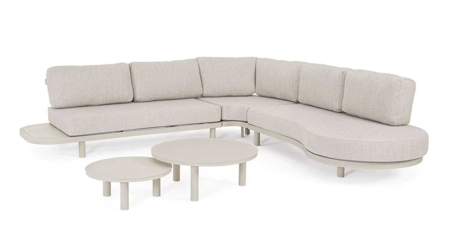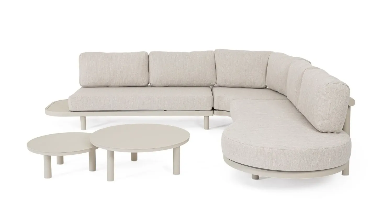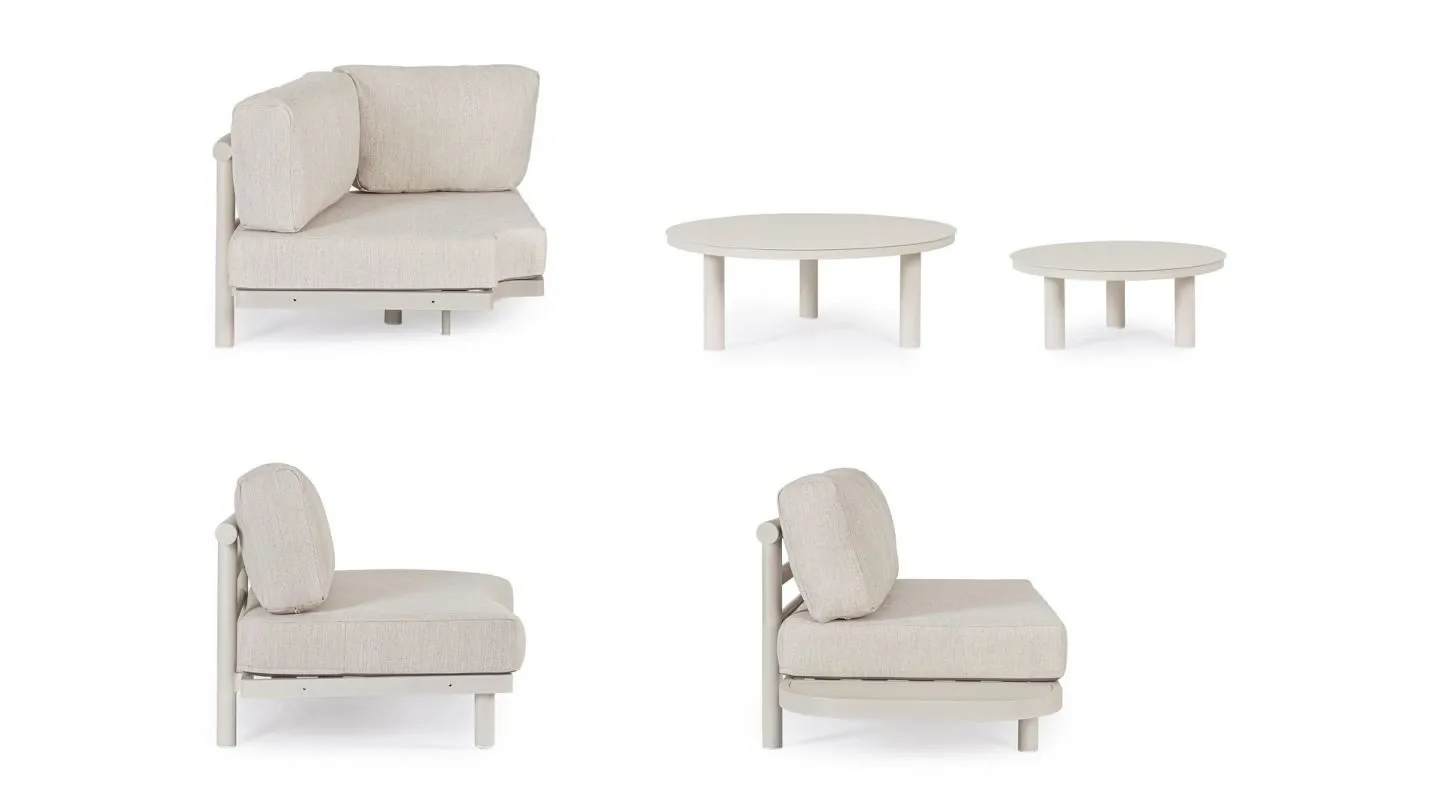 STRUTTURA IN ALLUMINIO VERNICIATO A POLVERE (POLIESTERE). CUSCINI SEDUTA E SCHIENALE SFODERABILI IN TESSUTO IDROREPELLENTE OLEFIN (100% POLIPROPILENE). PIEDINI REGOLABILI. GAMBE ANGOLARE E TAVOLINO (VITERIA IN ACCIAIO INOSSIDABILE) DA ASSEMBLARE.