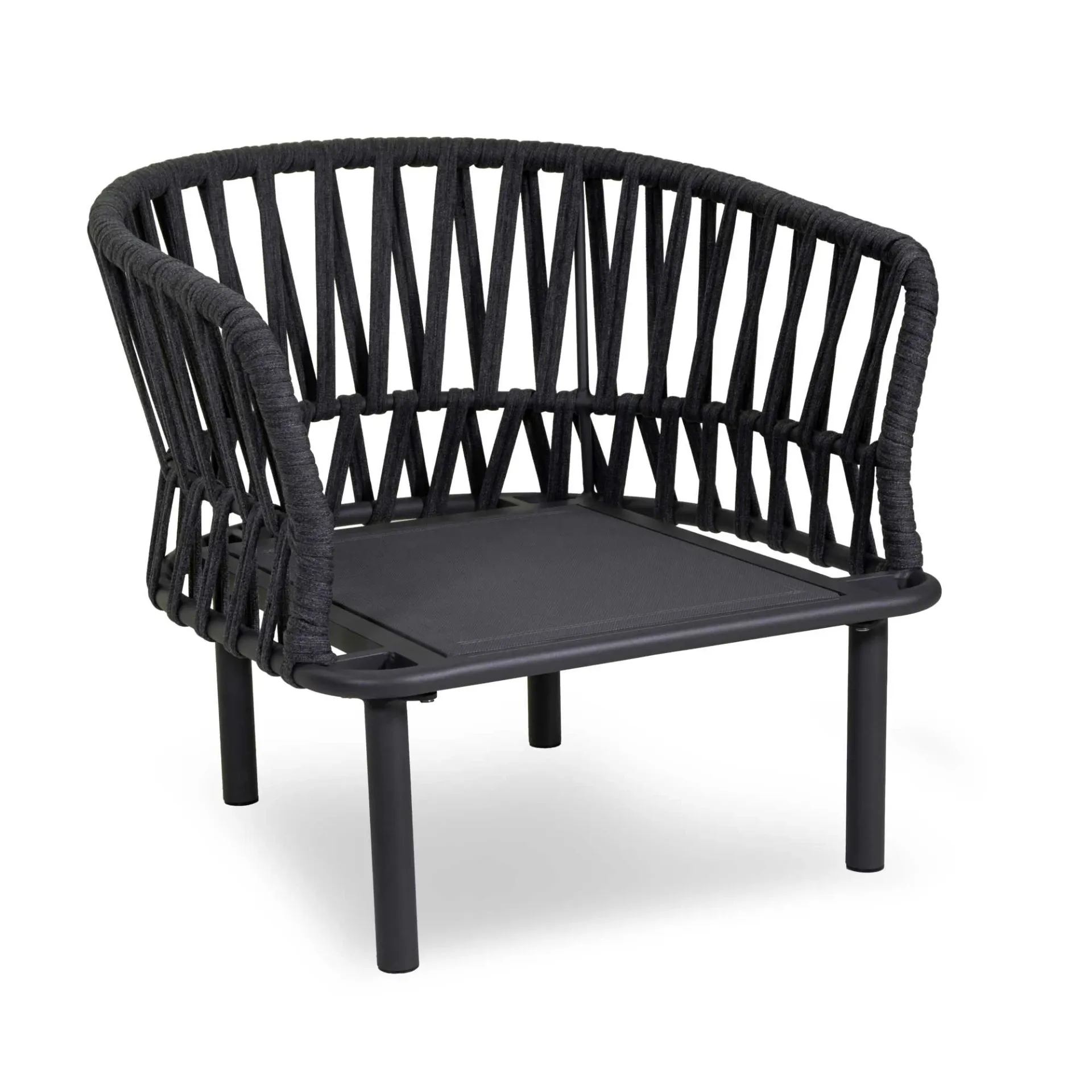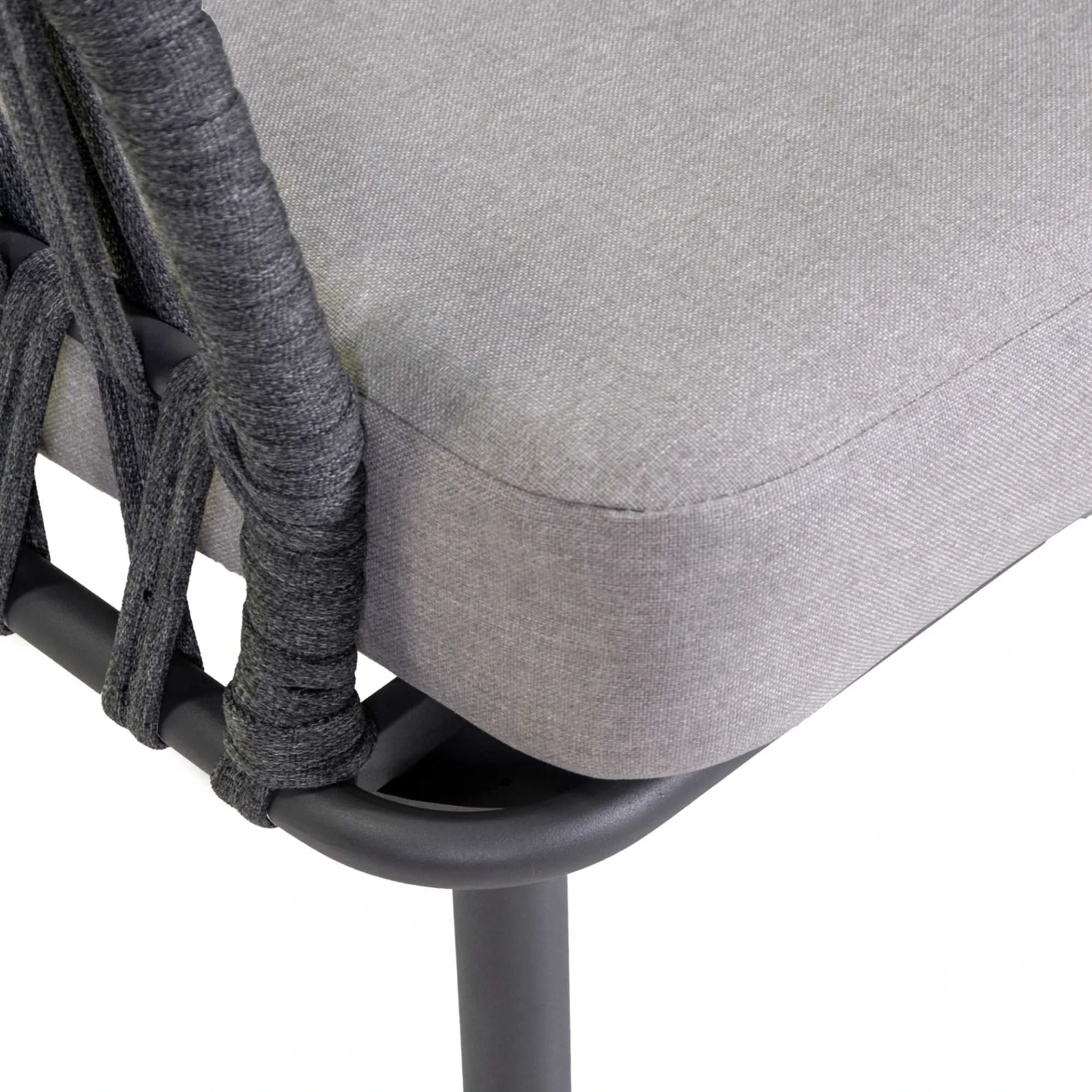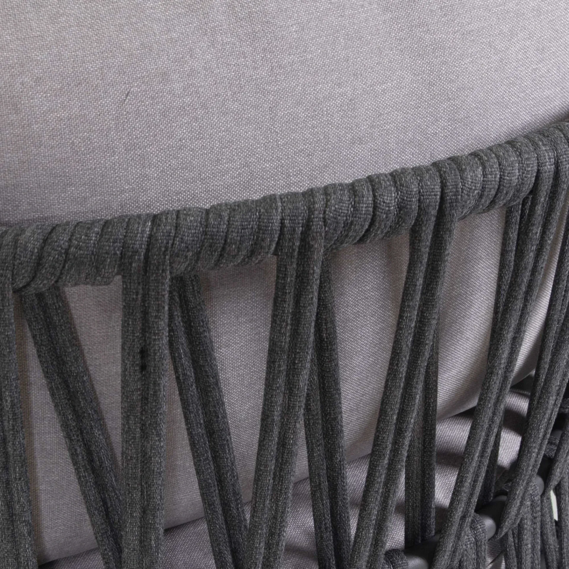 Struttura in alluminio verniciato a polvere con intreccio schienale e fianchi in corda di poliestere a fettuccia