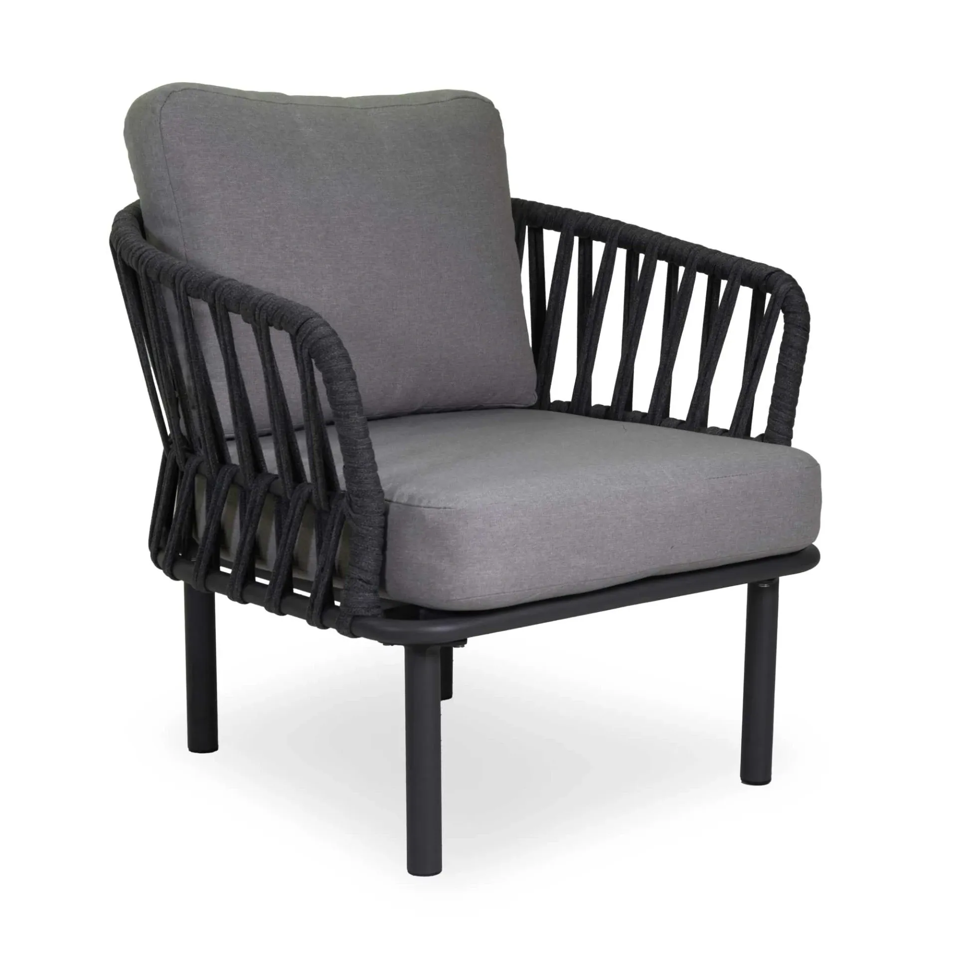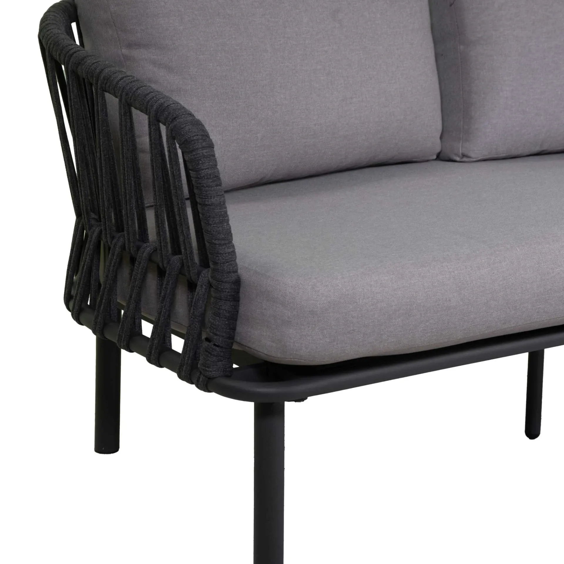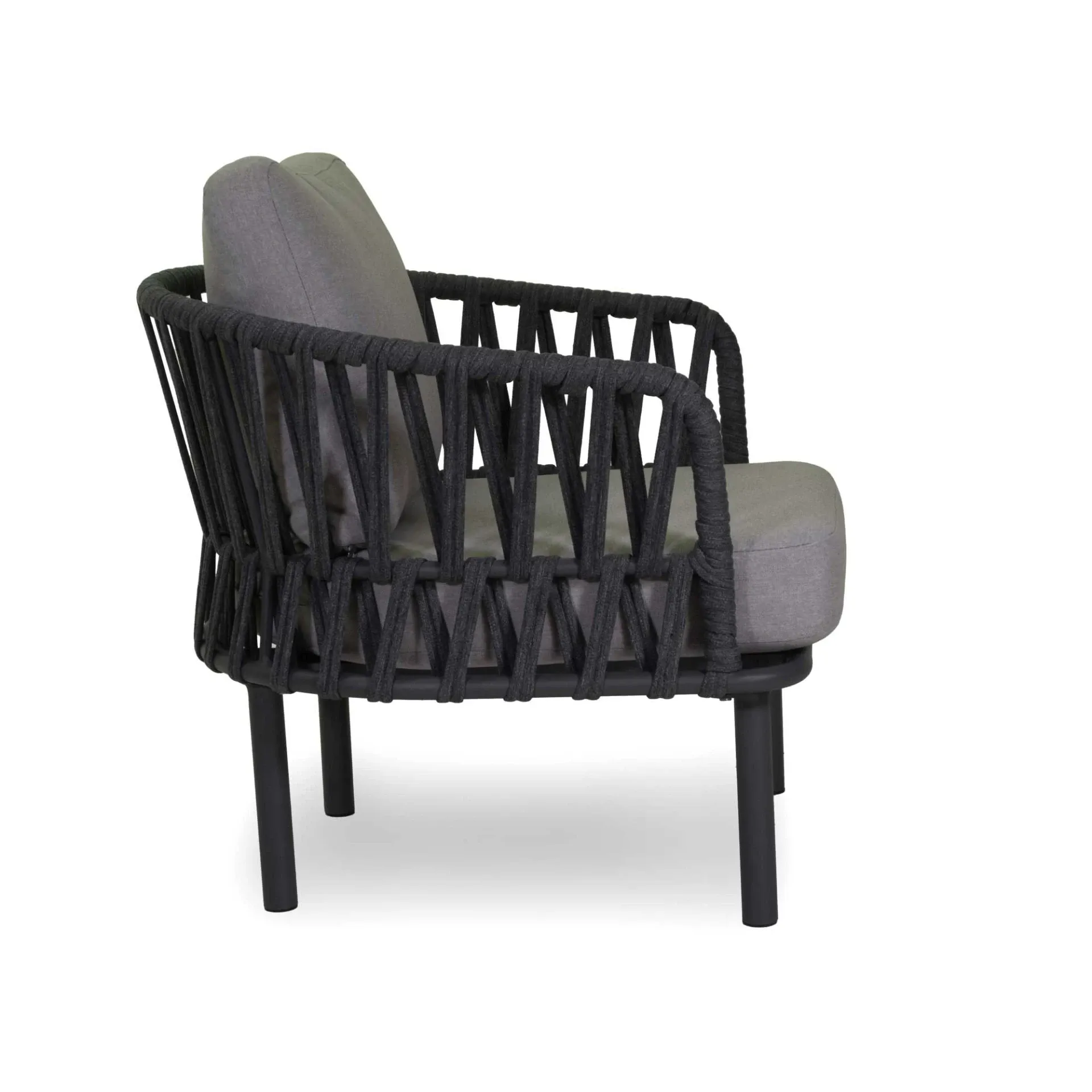 Struttura in alluminio verniciato a polvere con intreccio schienale e fianchi in corda di poliestere a fettuccia