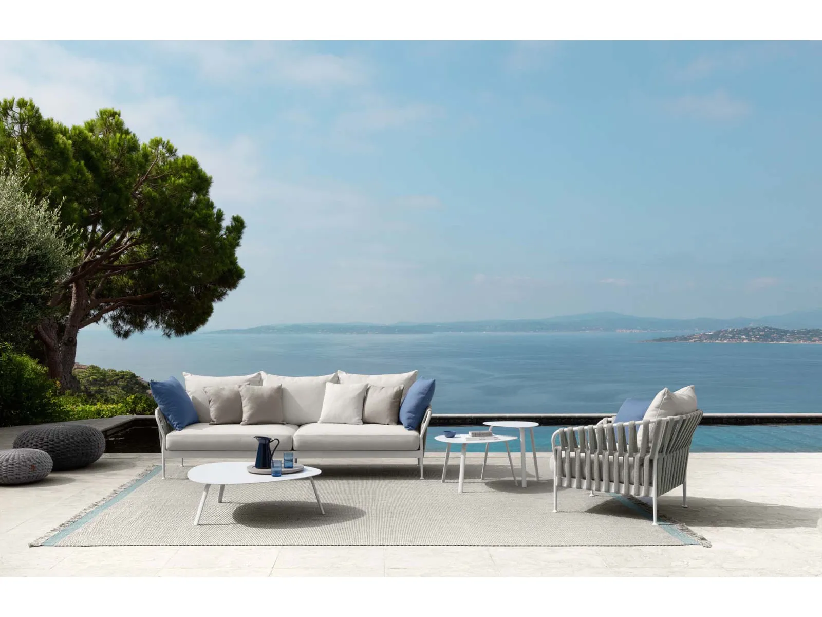 LINEA FRAME: Caratterizzata dall accostamento di strutture in alluminio, intrecci in corda e confortevoli cuscinature, indiscutibile la sua sensuale presenza nello spazio outdoor.