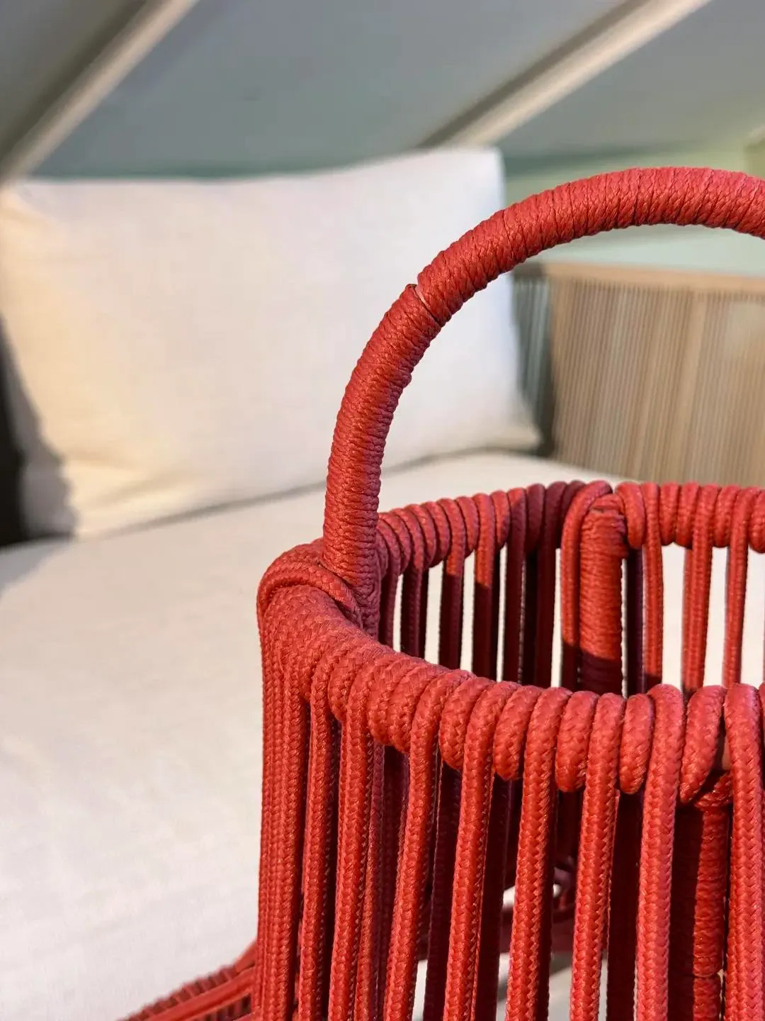 Lampada caratterizzata da struttura a cono in alluminio verniciato a polvere rosso rivestito con corda nautica intrecciata rossa. Progetto dello studio Palomba Ludovica e Roberto. All'accensione della lampada led ricaricabile, si creano effetti di luce unici.