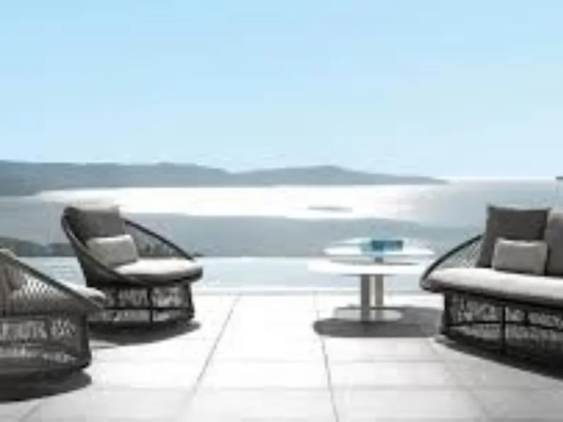 Composizione salotto mod ROPE serie Talenti, 1 divano a tre posti da cm. 182, 2 poltrone e 1 tavolino da cm. 80x80x33H-struttura in alluminio verniciato a polvere col.grigio,rivestita da un intreccio di corde in tessuto sintetico grigio- cuscineria in tessuto sfod.e lavabile resistente agli agenti atmosferici,inbottiture in dacron