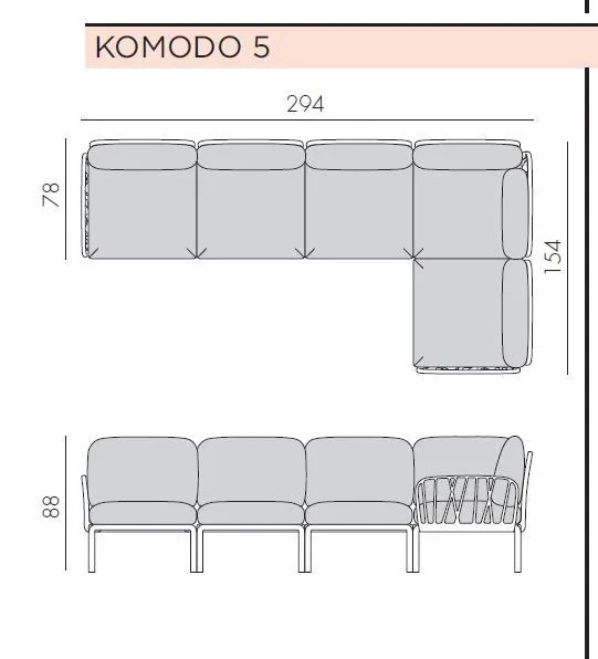Il divano Komodo 5 è un sistema modulare di sedute combinabili in più combinazioni. Fa parte del set il tavolino Komodo in polipropilene. Struttura in polipropilene fiberglass trattato anti-UV e colorato in massa, reciclabile. Schienale e braccioli agganciabili su tutti i lati della seduta. Smontabile. Finitura opaca. Dotato di piedini antiscivolo. Kit cuscini sfoderabili per 5 posti incluso nell'imballo. Dimensioni L294 P78/154 H88.
