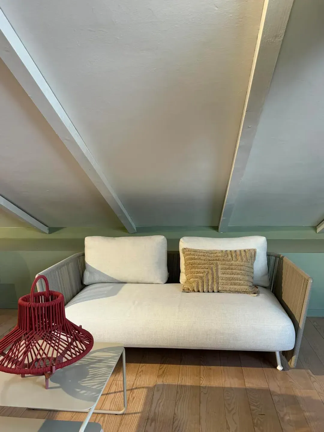 Coral divano outdoor 2 posti comodi della linea Icon di Talenti, il top di gamma. Struttura in alluminio verniciato a polvere colore bianco, con braccioli e schienale rivestiti da un intreccio di corde nautiche colore beige. I cuscini schienali e di seduta sono sfoderabili e con imbottitura brevettata Quick dry foam, studiati per l'outdoor, impermeabili con interni a cellule aperte per far drenare l'acqua in caso di pioggia.