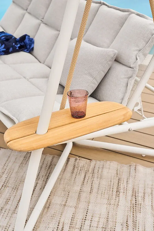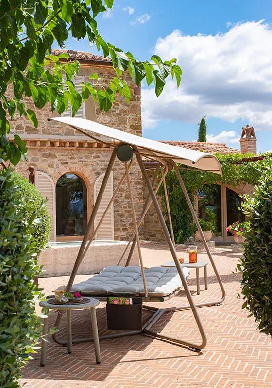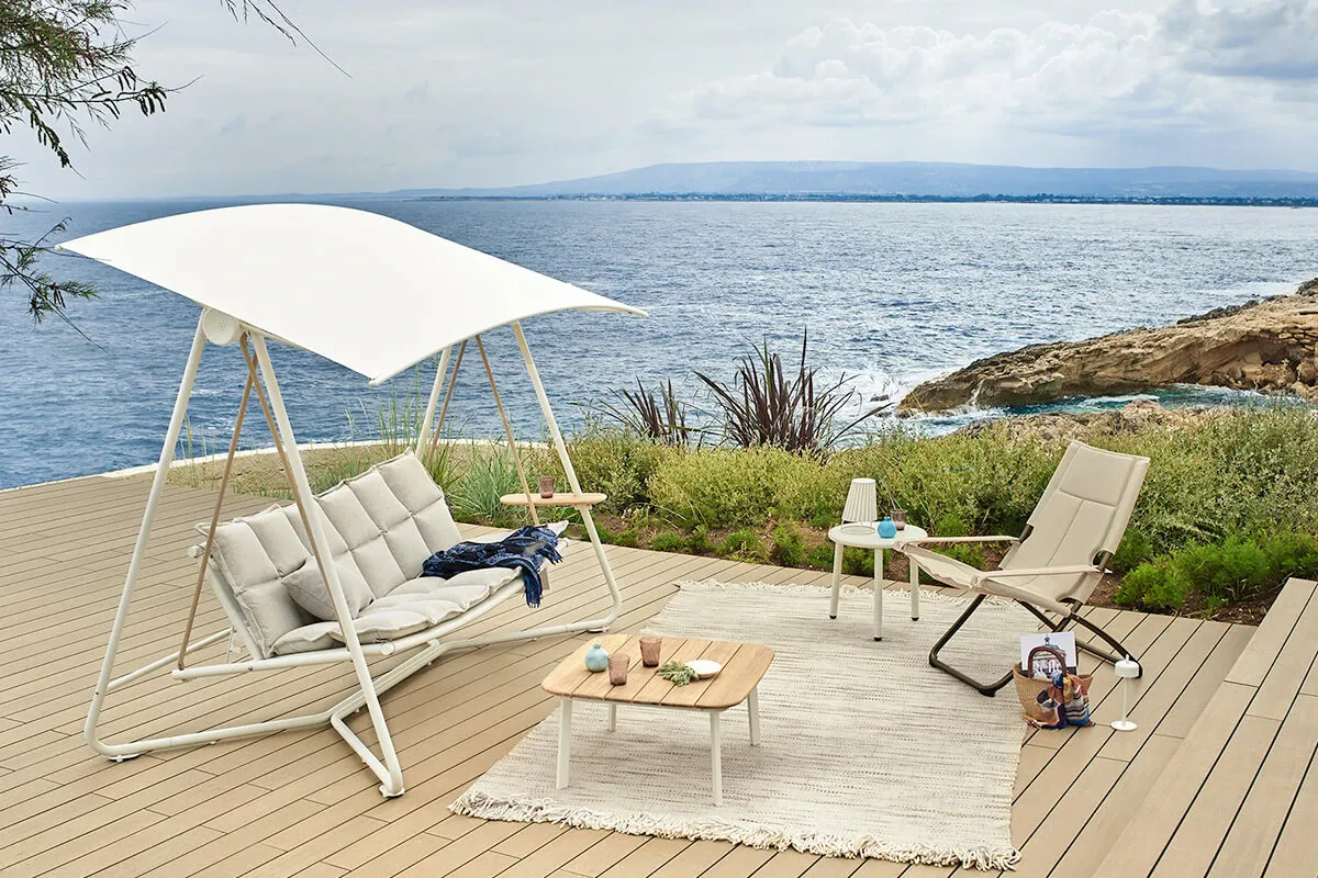 Reel è un divano a dondolo che si trasforma in un generoso e confortevole daybed, poiché il suo schienale può essere facilmente regolato in base all esigenza. Il parasole che lo completa, anch esso inclinabile e regolabile, permette alla luce di filtrare in maniera naturale e delicata, assicurando massimo relax. Il concetto alla base del design di Reel è la curva, come la curva di un sorriso che invita ad un intimo e rilassante viaggio oltre il caos e lo stress della quotidianità che ci circonda. Reel ci invita a giocare e a farci dolcemente cullare, in un costante equilibrio tra continuità formale, eleganza e comfort d utilizzo.