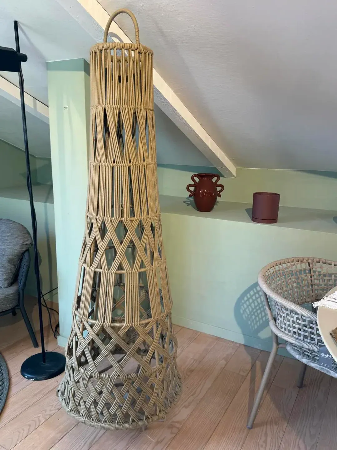 Lampada mod. Tribal di Talenti, disegnata da Ludovica e Roberto Palomba e caratterizzata da una struttura a cono in alluminio verniciato a polvere e rivestito con corda nautica intrecciata colore sabbia. All'accensione della lampada led ricaricabile, si creano effetti di luce unici.