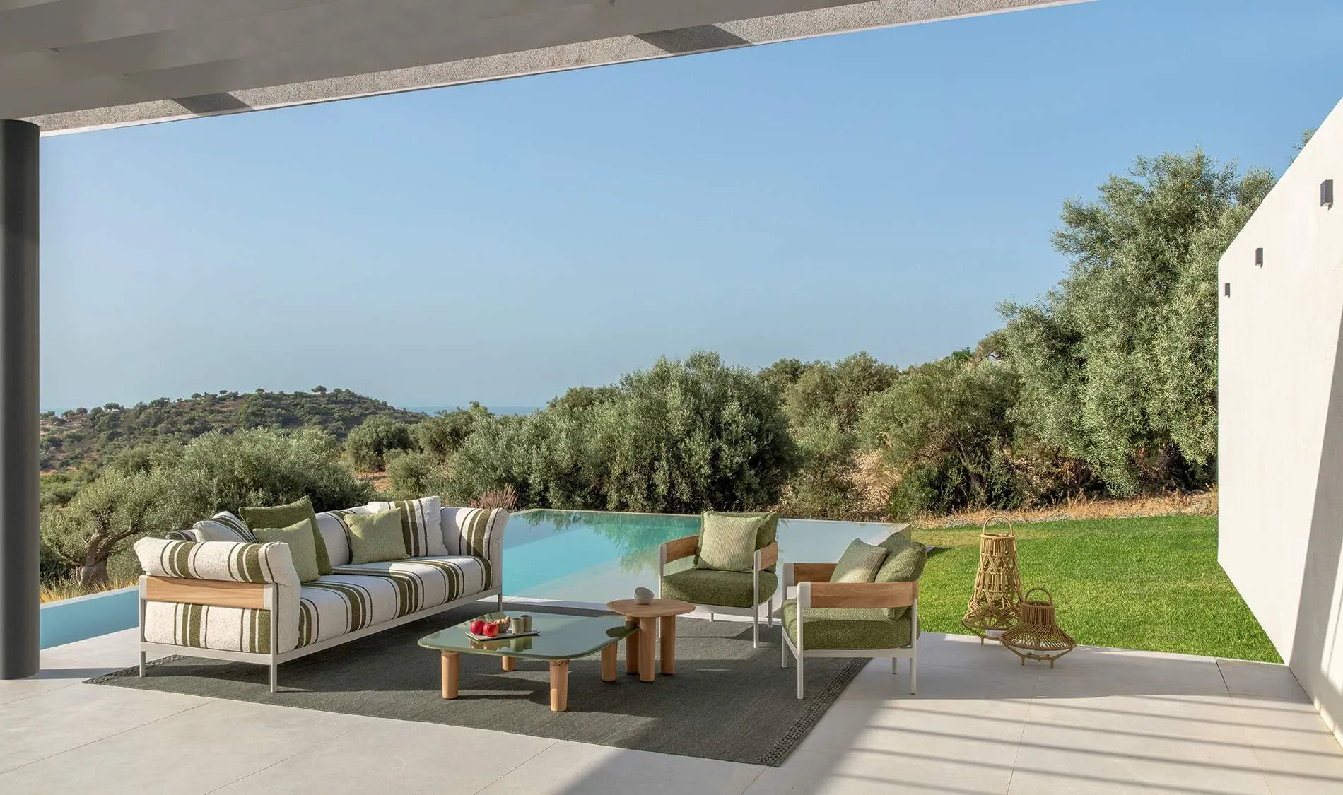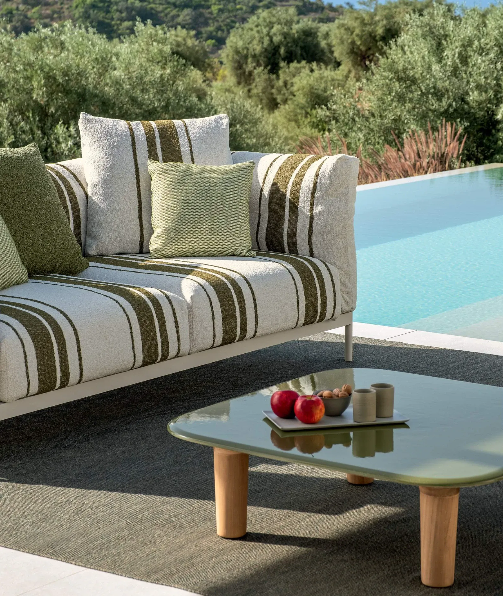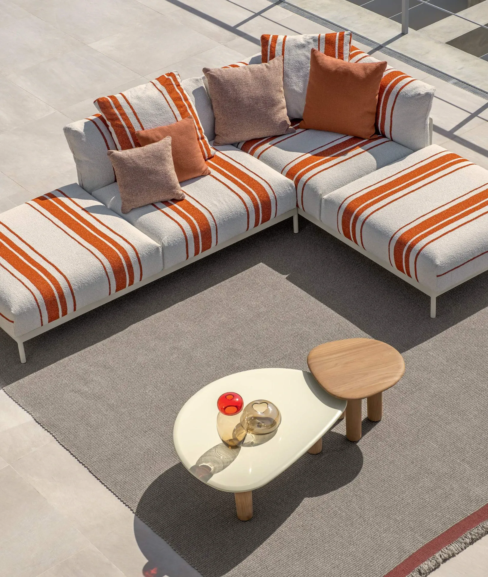 Comfort e multi-materialità sono gli elementi chiave di questa collezione che, come rievoca il nome, vuole trasmettere una sensazione di fluidità, di benessere vissuto lasciando che il tempo per il relax scorra liberamente. Una raccolta di elementi dove i cuscini avvolgenti, abbinati a materiali ricercati e a tessuti a righe dal forte valore decorativo, contribuiscono a portare l atmosfera dell indoor negli spazi esterni. La struttura in alluminio, in elegante bianco caldo o il più deciso mokka, si integrano armoniosamente con le sinuose lavorazioni di legno, esaltando il know di Talenti nella realizzazione di arredi che fondono materiali apparentemente lontani. Il risultato è un mix raffinato e naturale tra il calore tradizionale del teak e la forza estetica degli elementi laccati, in grado di formare una famiglia di prodotti completa e versatile che include divani componibili, poltrone lounge, tavoli e sedute dining e soluzioni relax.