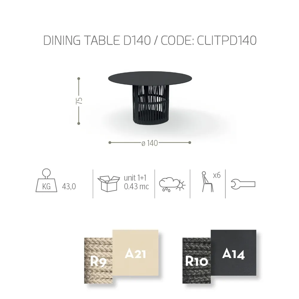 Il tavolo Cliff ha un diametro di 140 cm e un'altezza di 75 cm, ideale per spazi outdoor come terrazzi e giardini.