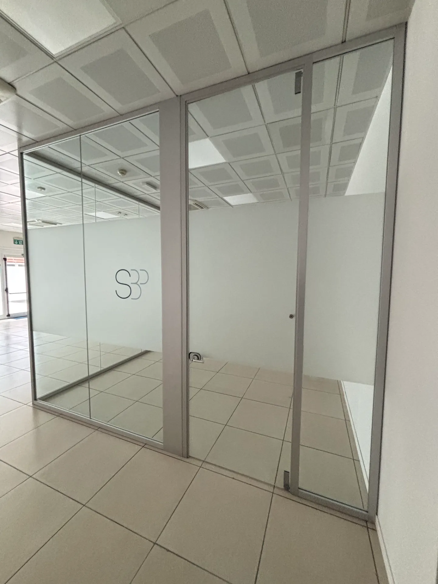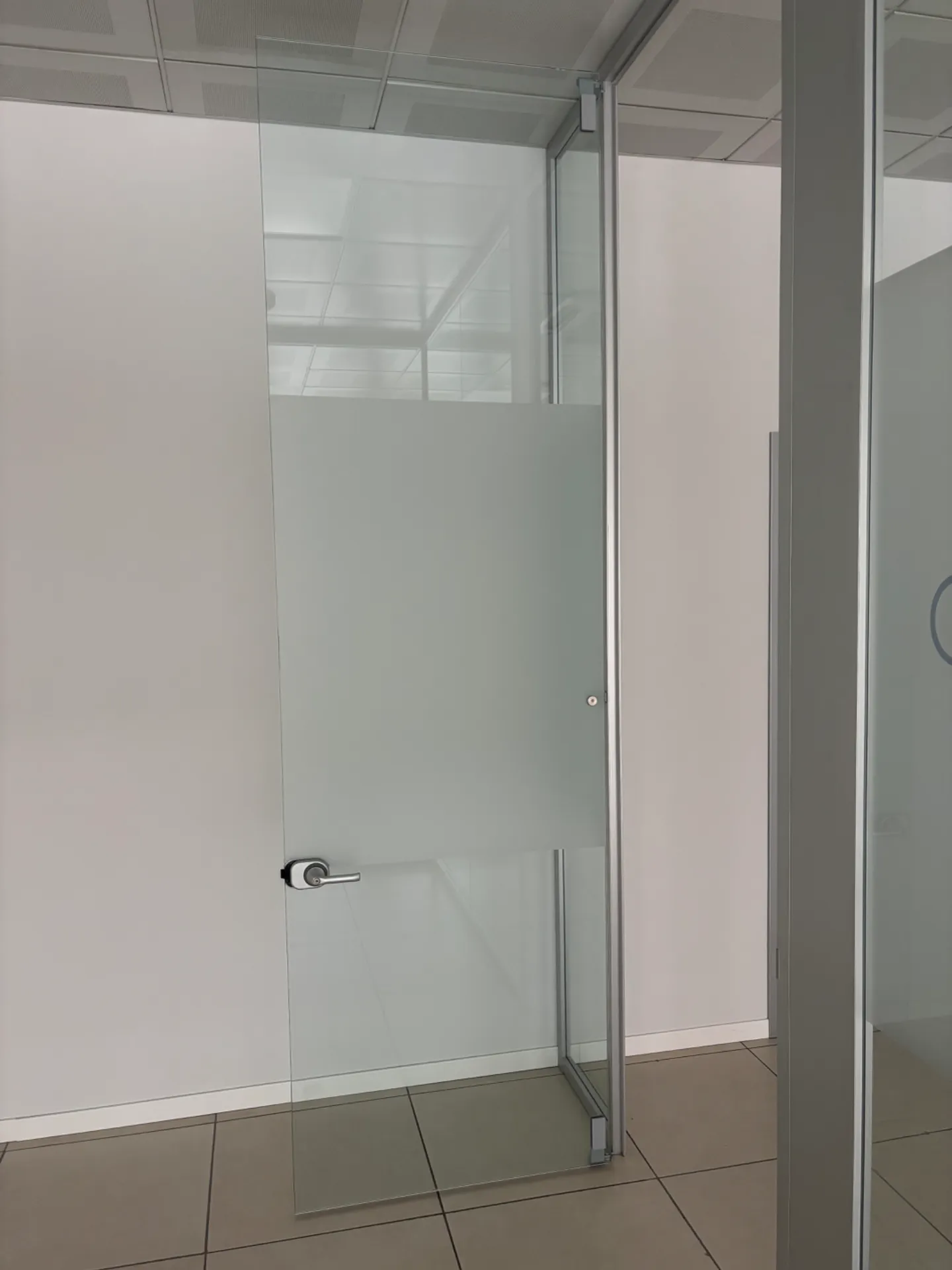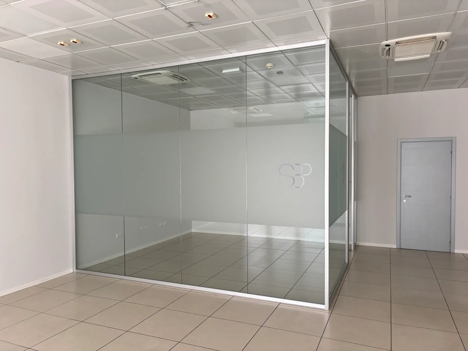Vendiamo parete vetrata divisoria angolare per ufficio, L.4 metri lato fisso X L.370 lato con porta X H.310.
