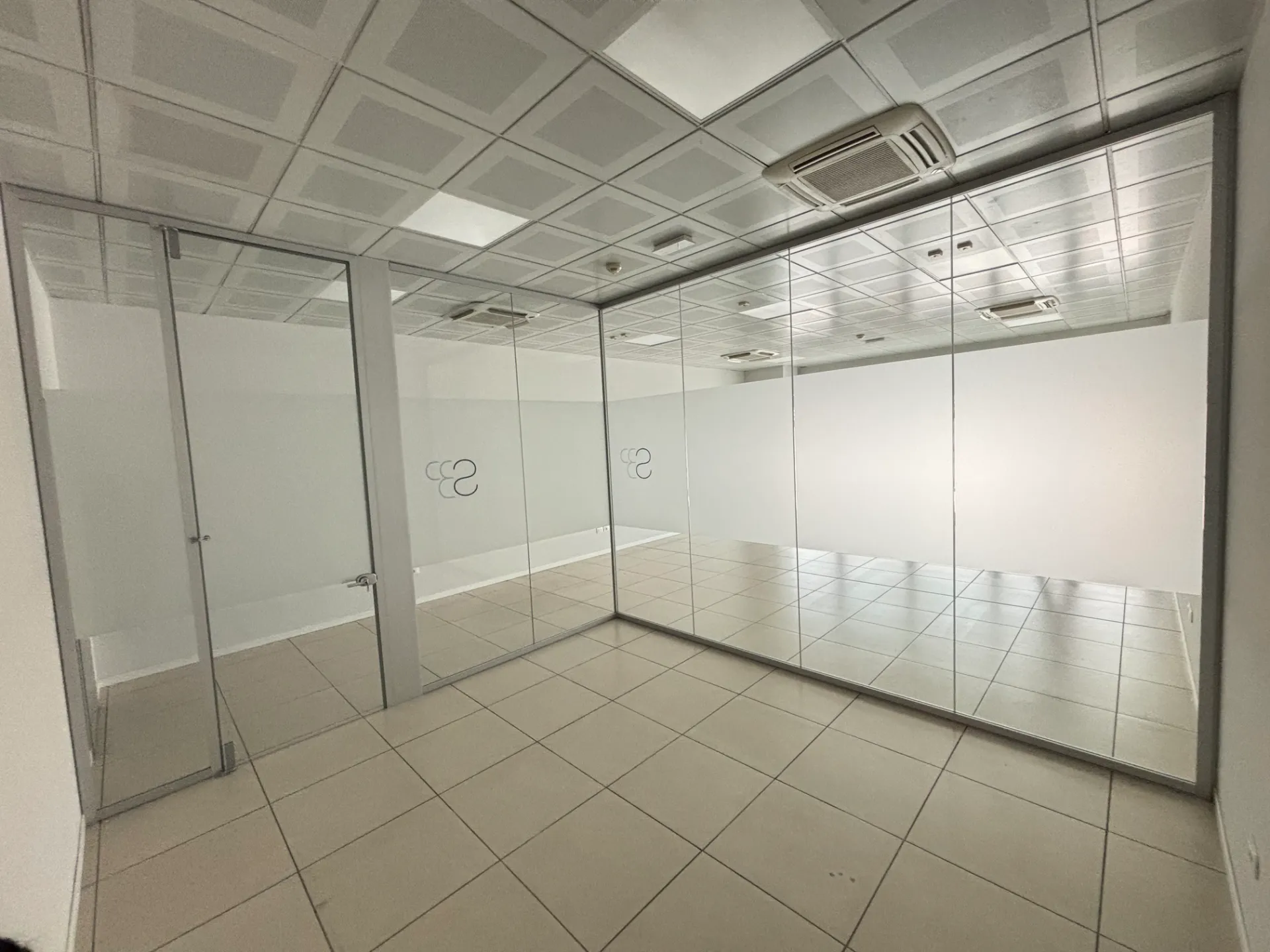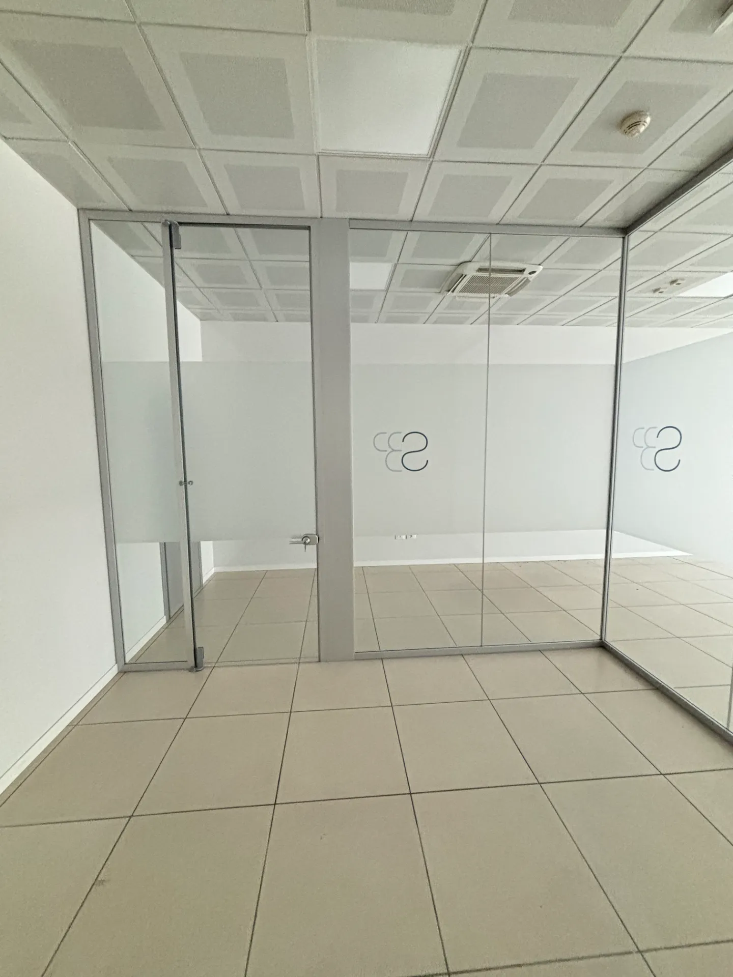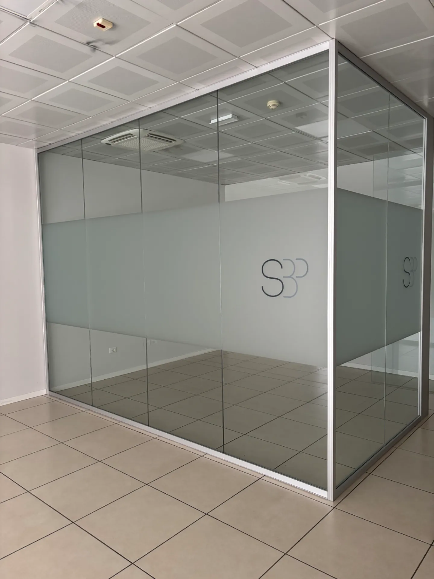 Vendiamo parete vetrata divisoria angolare per ufficio, L.4 metri lato fisso X L.370 lato con porta X H.310.