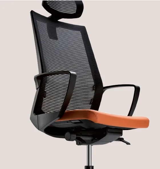Schienale in rete tecnica nera con sostegno lombare integrato; poggiatesta in rete.