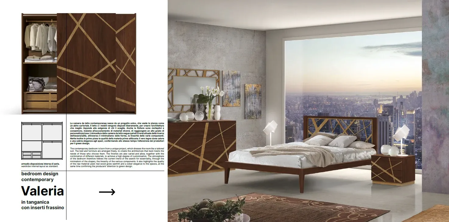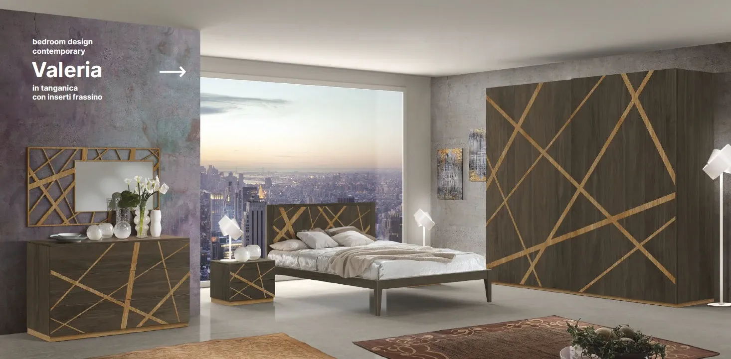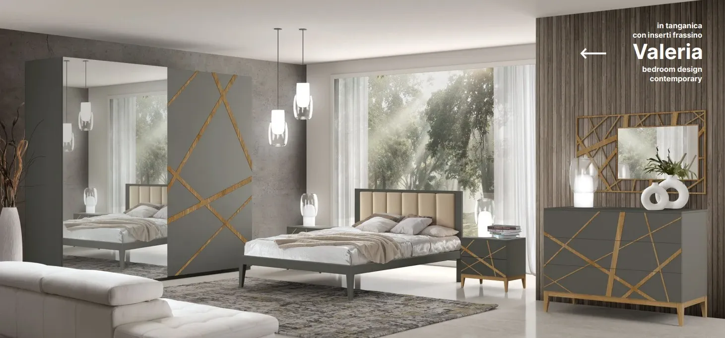 Dalla collezione esclusiva Mottes Mobili, presentiamo camera matrimoniale in legno di linea contemporanea modello VALERIA. Armadio in noce Tanganika con inserti in frassino di linea contemporanea con due ante scorrevoli. Dotazione interna: tre bastoni portaabiti, due ripiani. Possibilità di aggiunta cassettiera interna euro 200,00, eventuale specchio esterno con maggiorazione di 200,00 Larghezza: 274cm, Altezza: 248cm, Profondità: 65cm. Letto matrimoniale in noce tanganika di linea contemporanea con testata legno e inserto in ecopelle, completo di rete a doghe, materasso escluso. Comodino e comò in legno Noce Tanganica con inserti in legno di frassino di linea contemporanea con due cassetti con apertura push and pull, piedini in legno. Possibilità di scelta delle finiture senza variazione di prezzo. Consegna compresa nel prezzo in tutto il territorio nazionale, 60 giorni lavorativi. L'offerta per la camera MARICA come da foto è di euro 6.900,00. Per maggiori informazioni contattaci via mail o passa a trovarci nel nostro showroom.