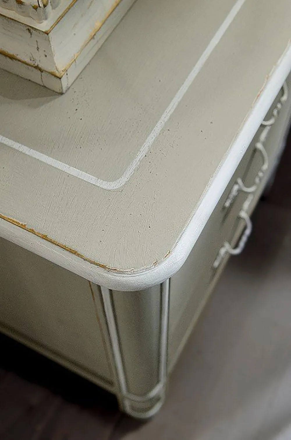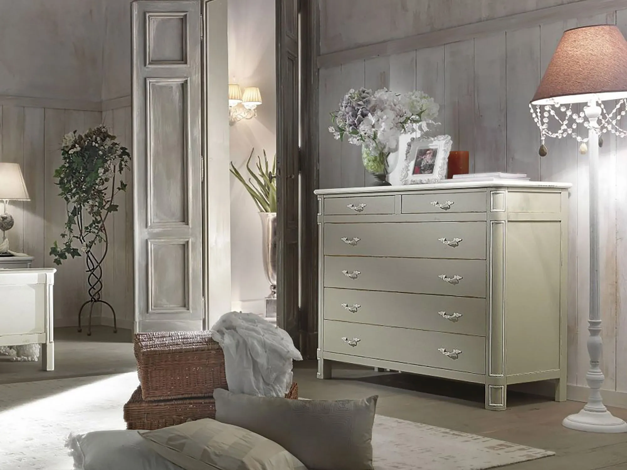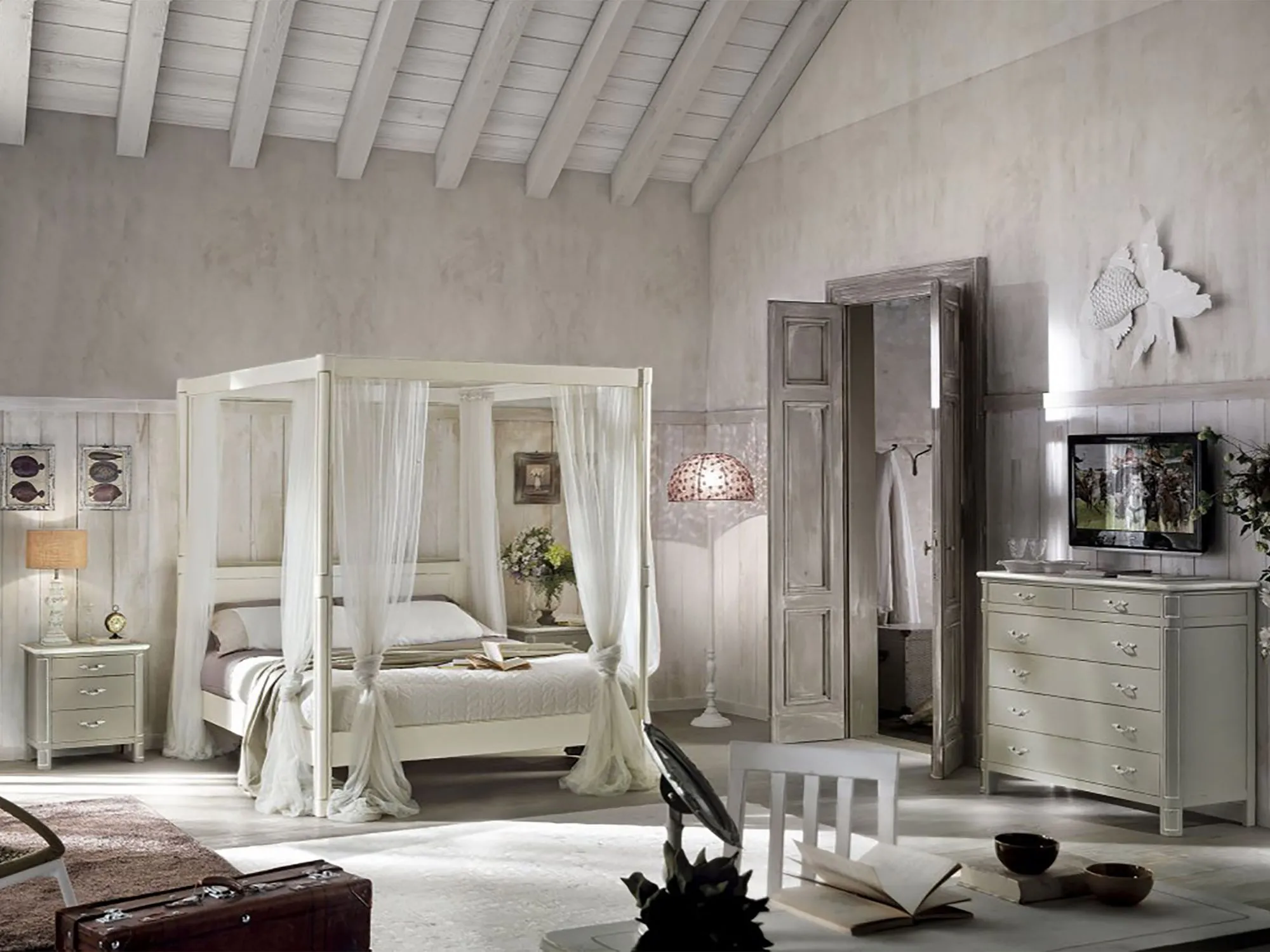 Camera da letto in stile provenzale Mobilike modello Isabeau, realizzata artigianalmente. Il letto è bianco con profili grigio provenzale lungo le colonne; la finitura a pennello è eseguita con con vernici effetto gesso e sabbia nelle tonalità del grigio-verde e bianco.