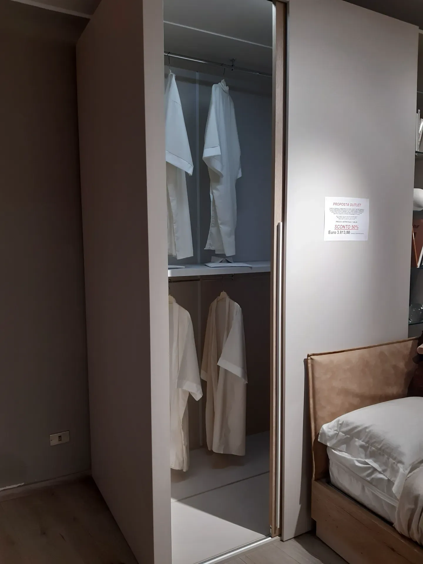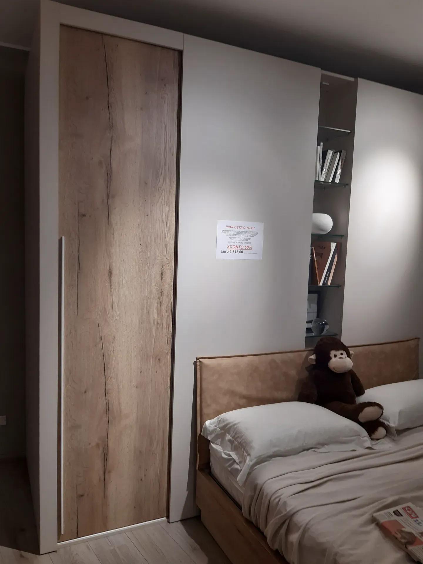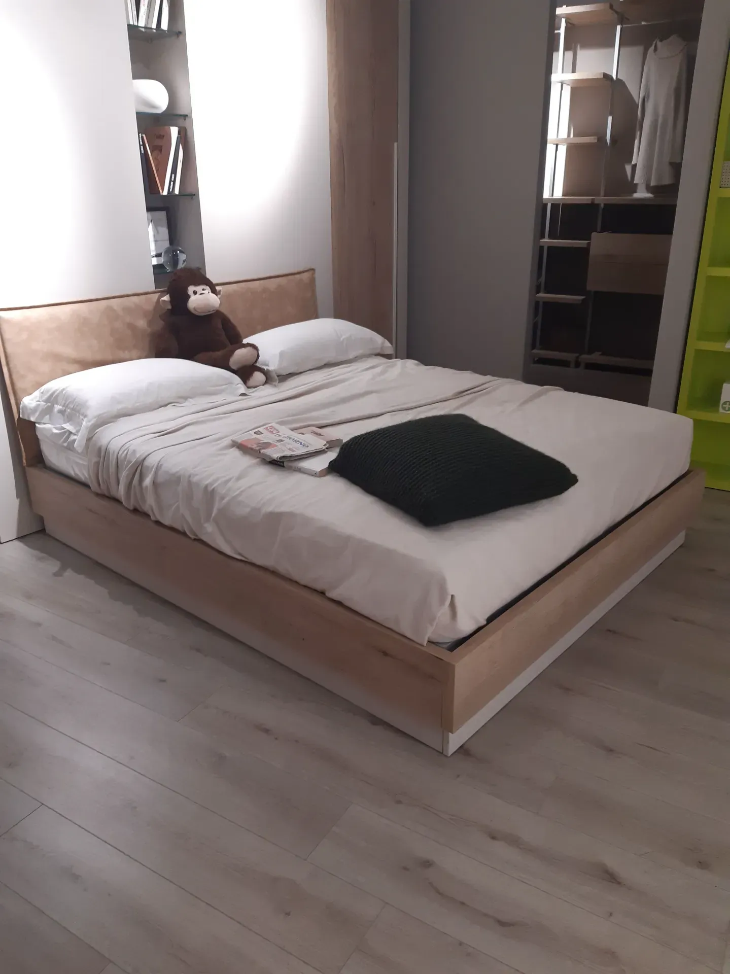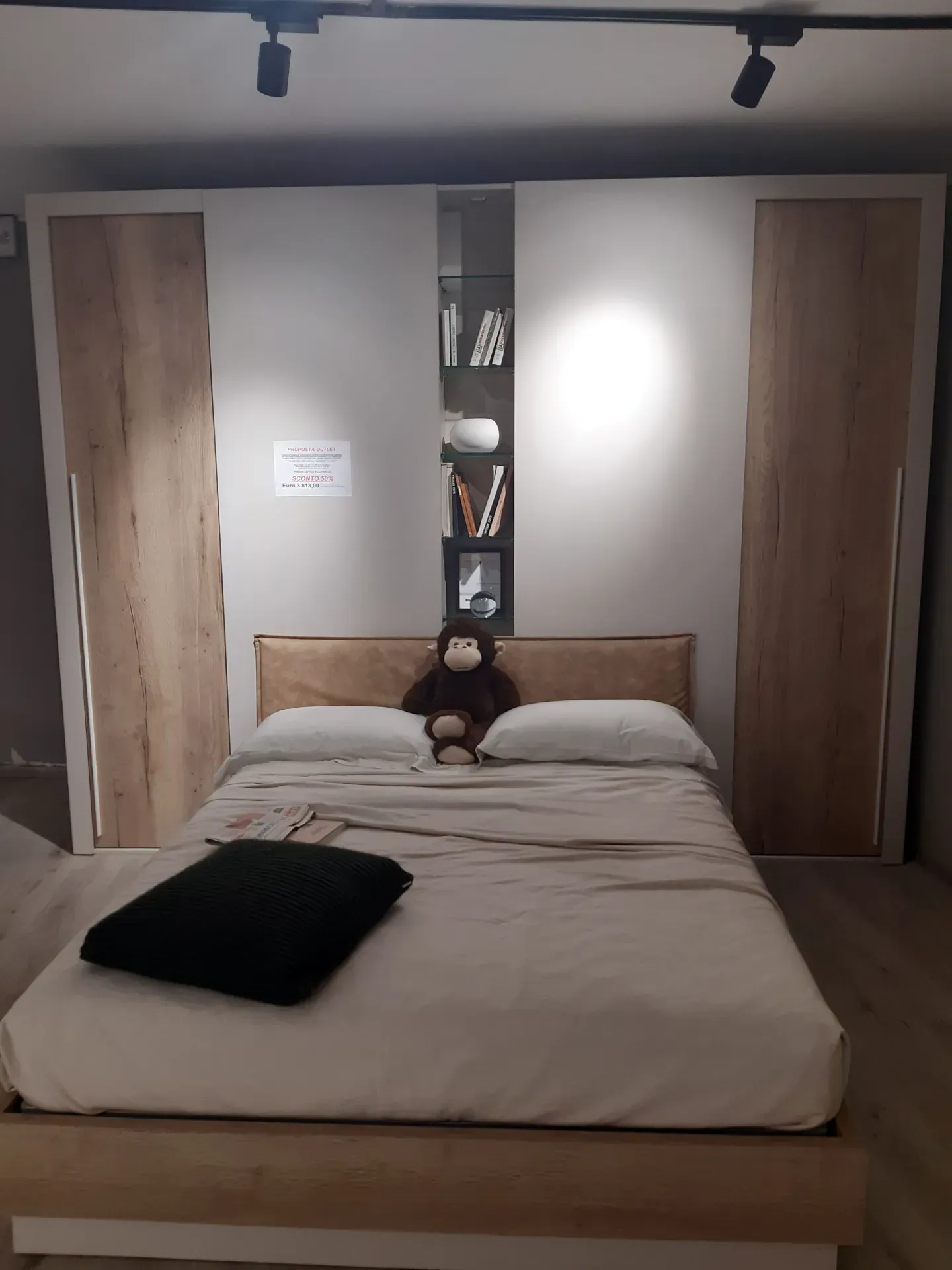 L'offerta comprende due pratiche cabine-armadio X-Cab con porte scorrevoli , attrezzatura interna e luce led a sensore, una colonnina centrale a giorno con ripiani in vetro e luce led, un letto a due piazze con grande contenitore in legno e testiera imbottita e rivestita in ecopelle lavabile