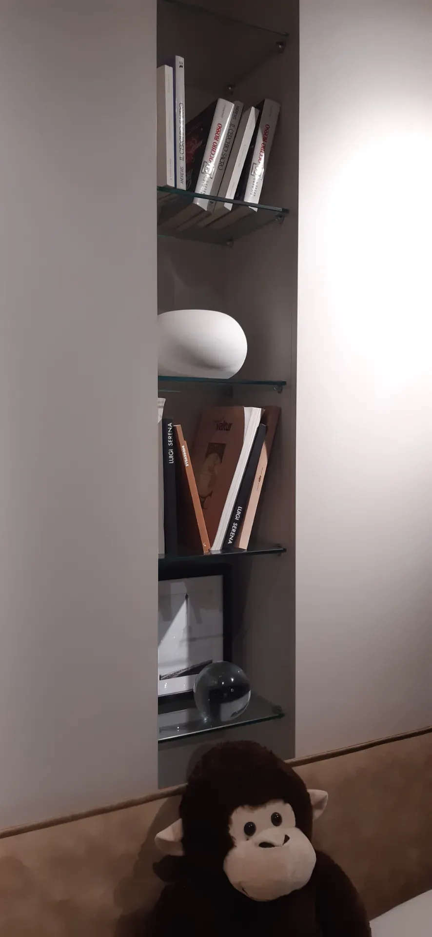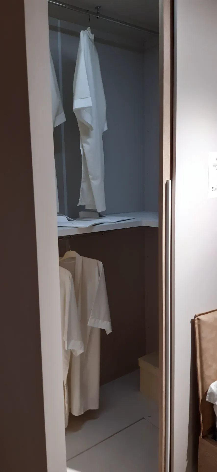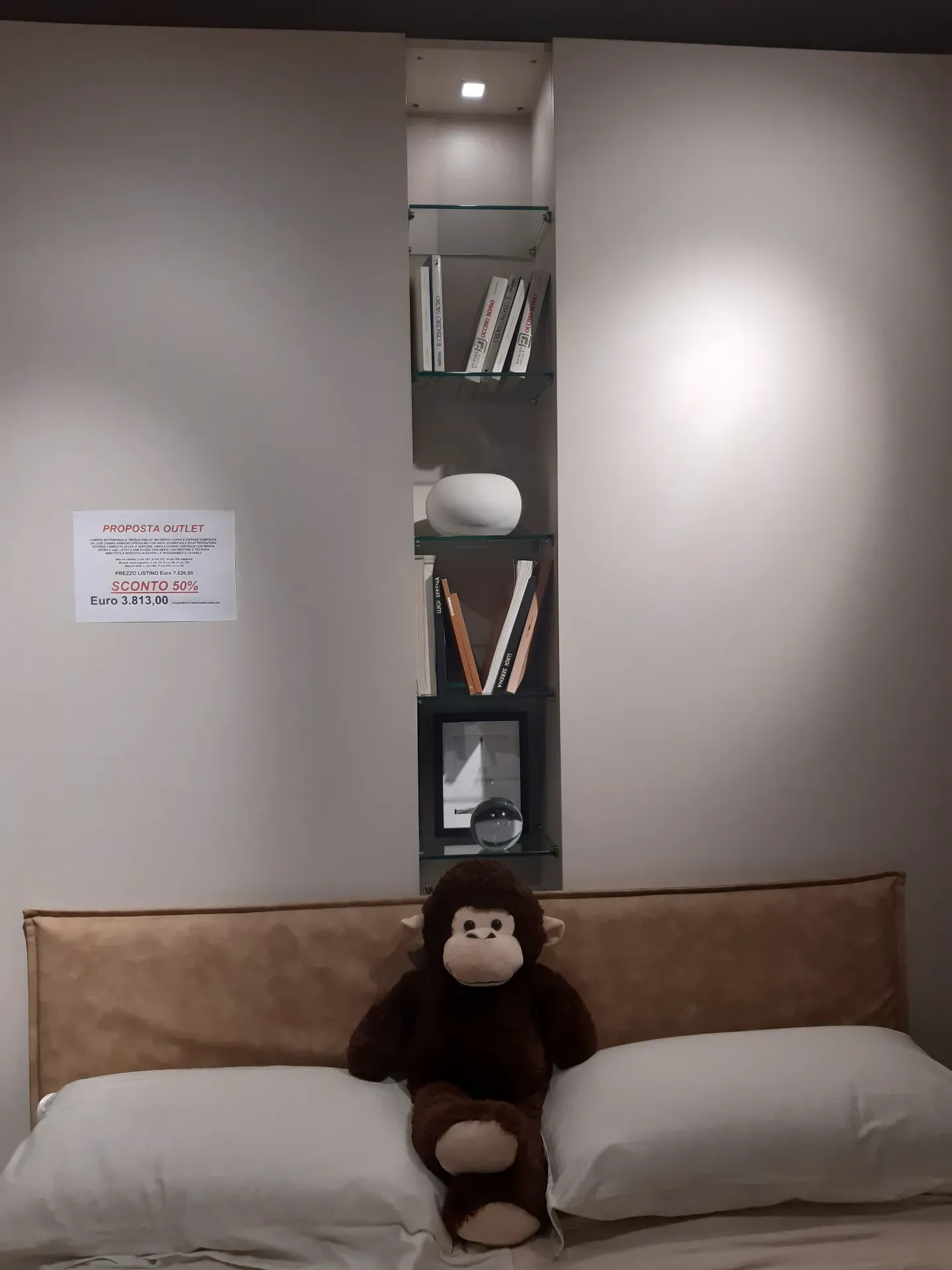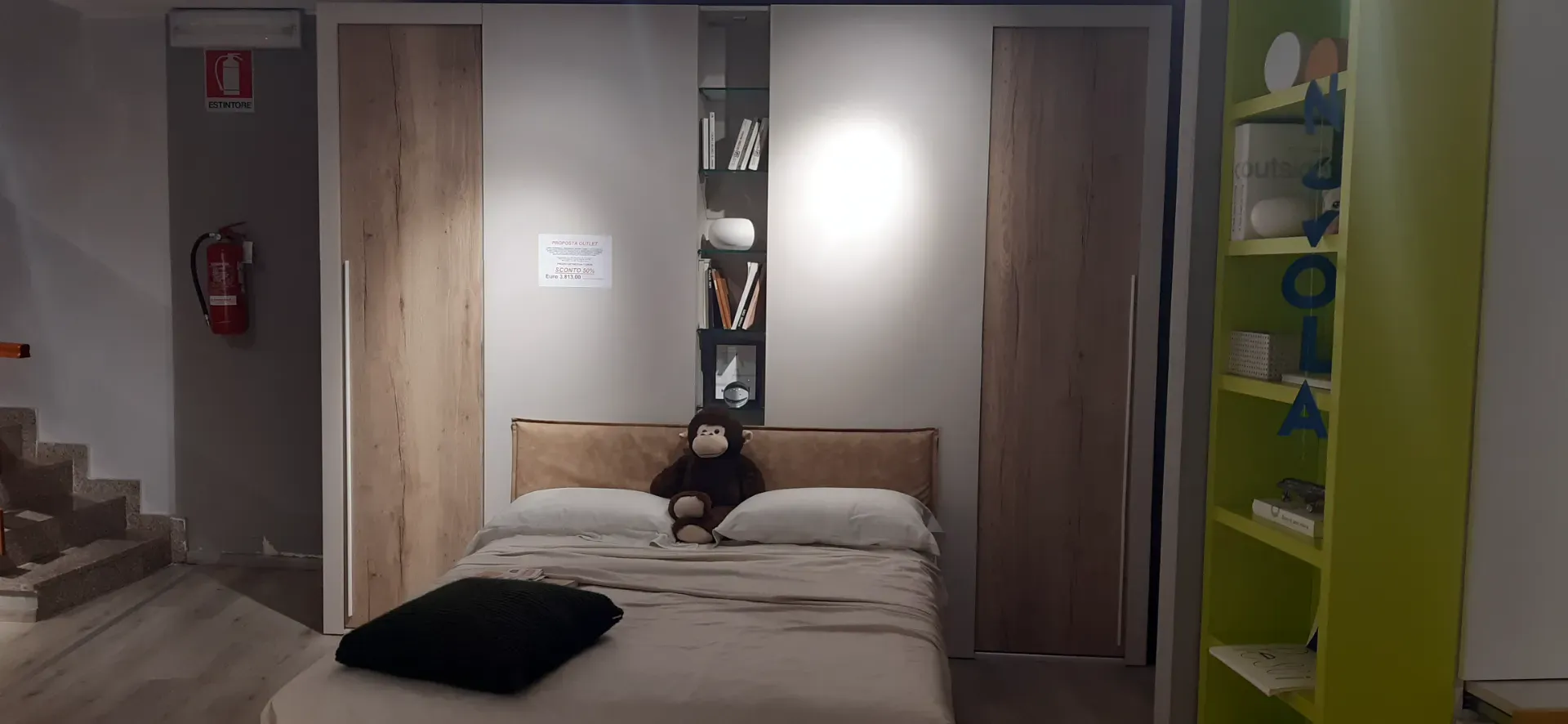 L'offerta comprende due pratiche cabine-armadio X-Cab con porte scorrevoli , attrezzatura interna e luce led a sensore, una colonnina centrale a giorno con ripiani in vetro e luce led, un letto a due piazze con grande contenitore in legno e testiera imbottita e rivestita in ecopelle lavabile