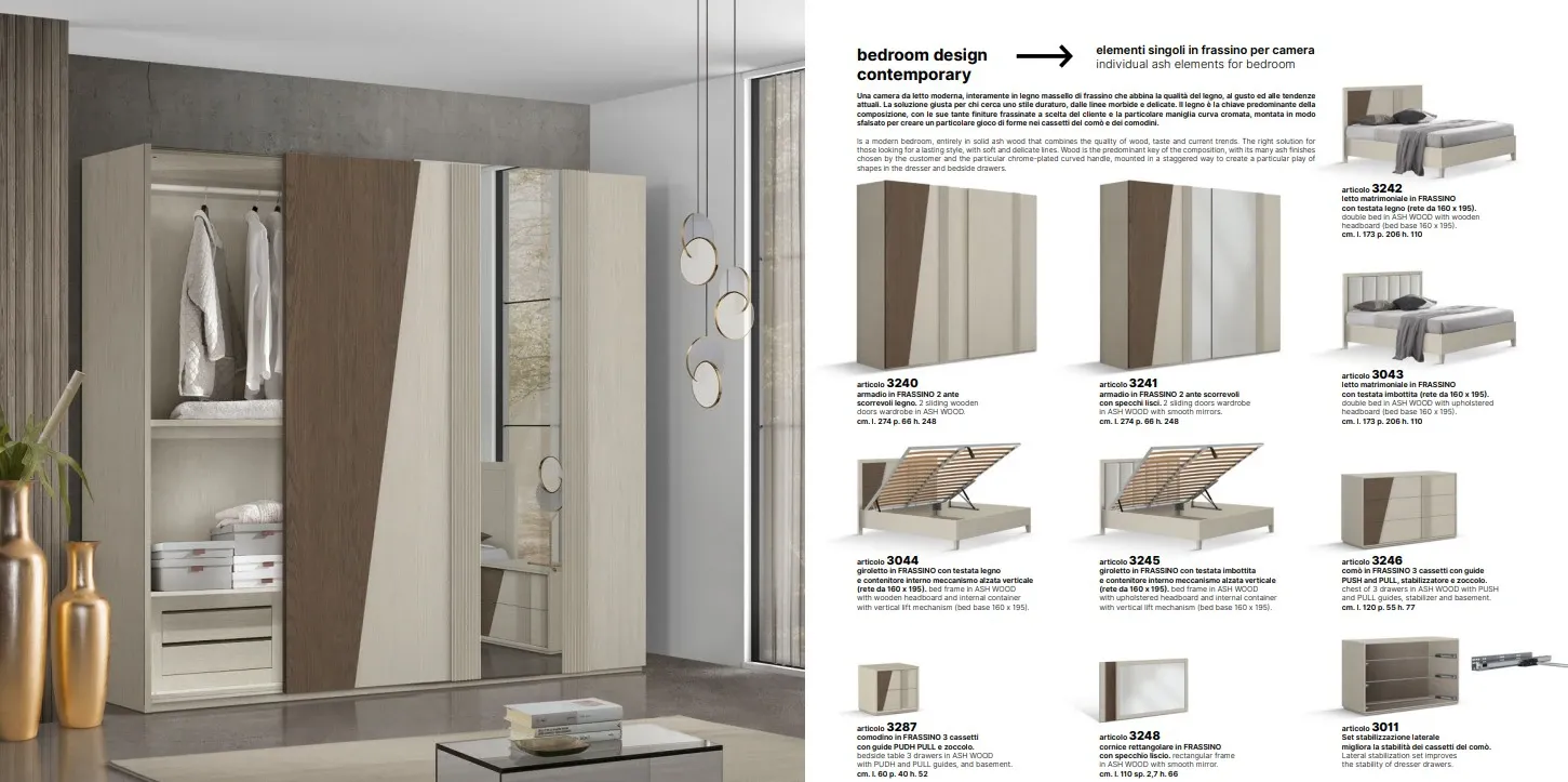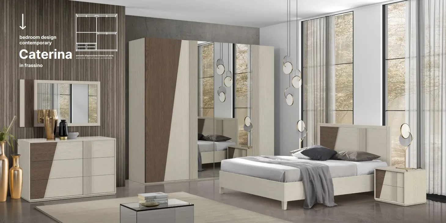 Dalla collezione esclusiva Mottes Mobili, presentiamo camera matrimoniale in legno di linea contemporanea modello CATERINA. Una camera da letto moderna, interamente in legno massello di frassino che abbina la qualità del legno, al gusto ed alle tendenze attuali. La soluzione giusta per chi cerca uno stile duraturo, dalle linee morbide e delicate. Il legno è la chiave predominante della composizione, con le sue tante finiture frassinate a scelta del cliente.