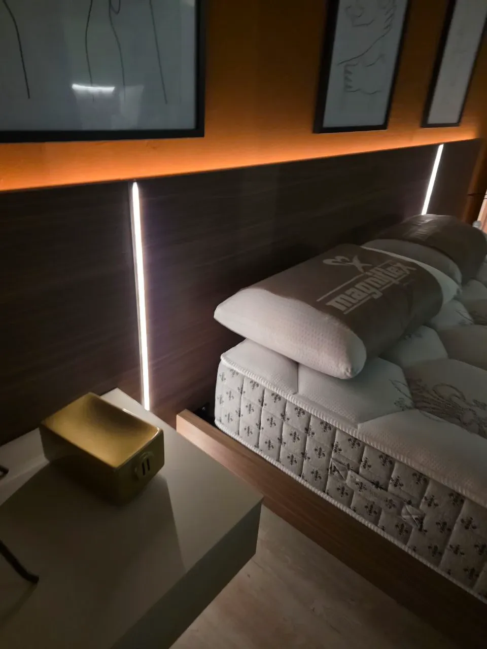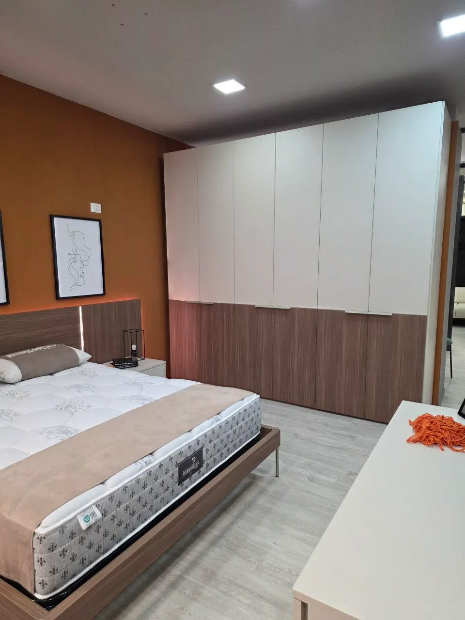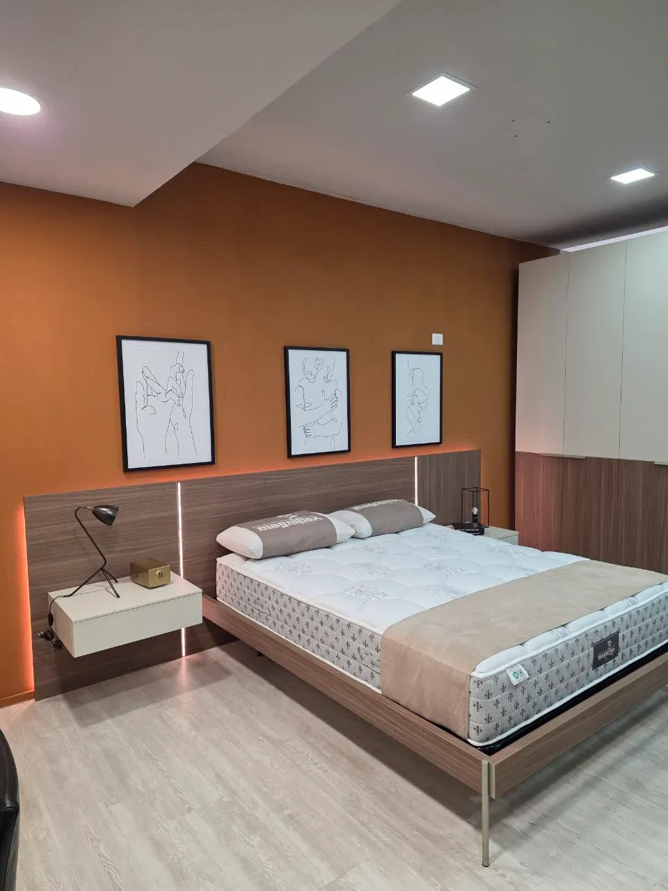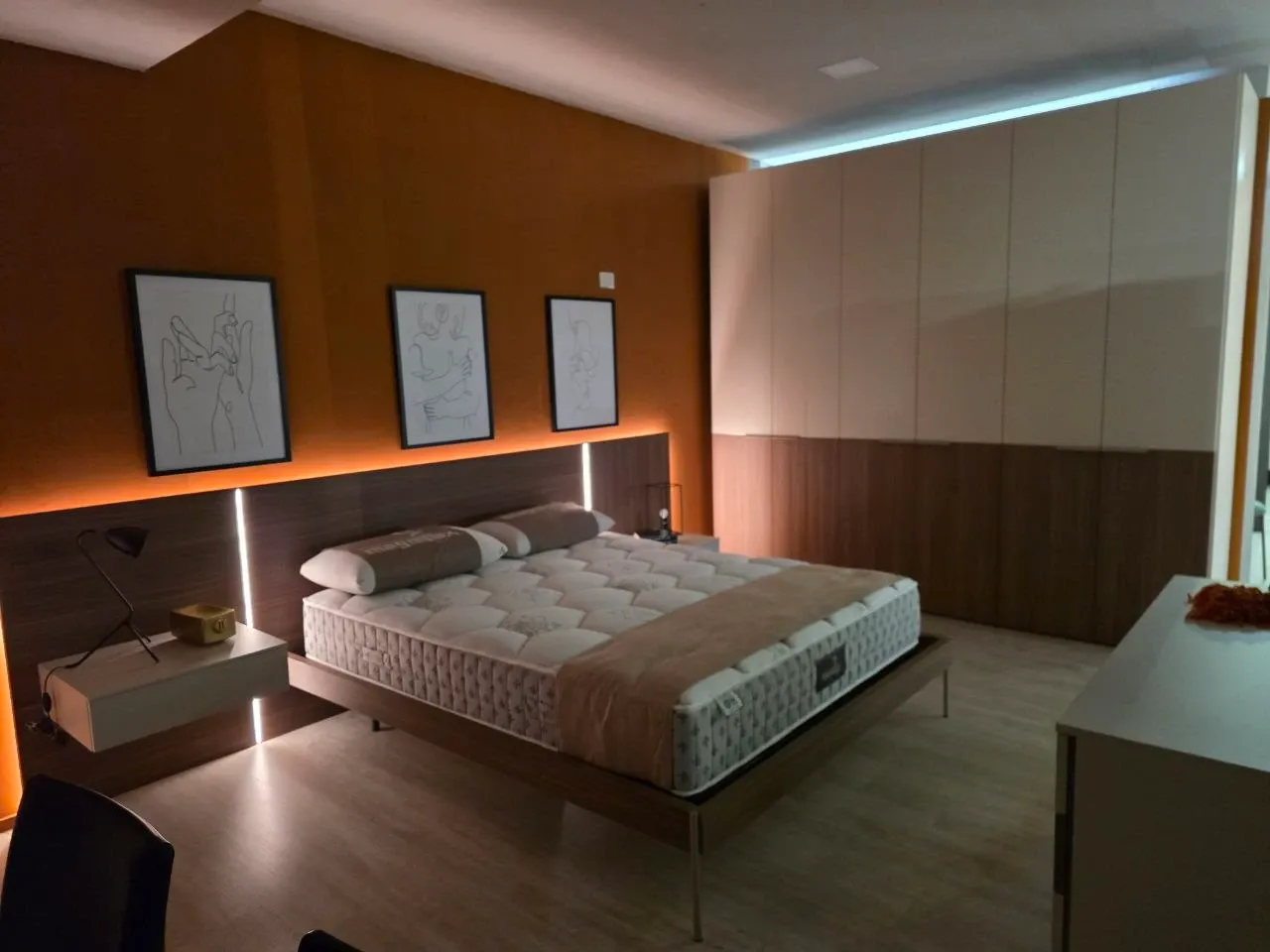 La testata a muro con illuminazione LED integrata crea un atmosfera calda e accogliente, valorizzando il design del letto e l intera zona notte.