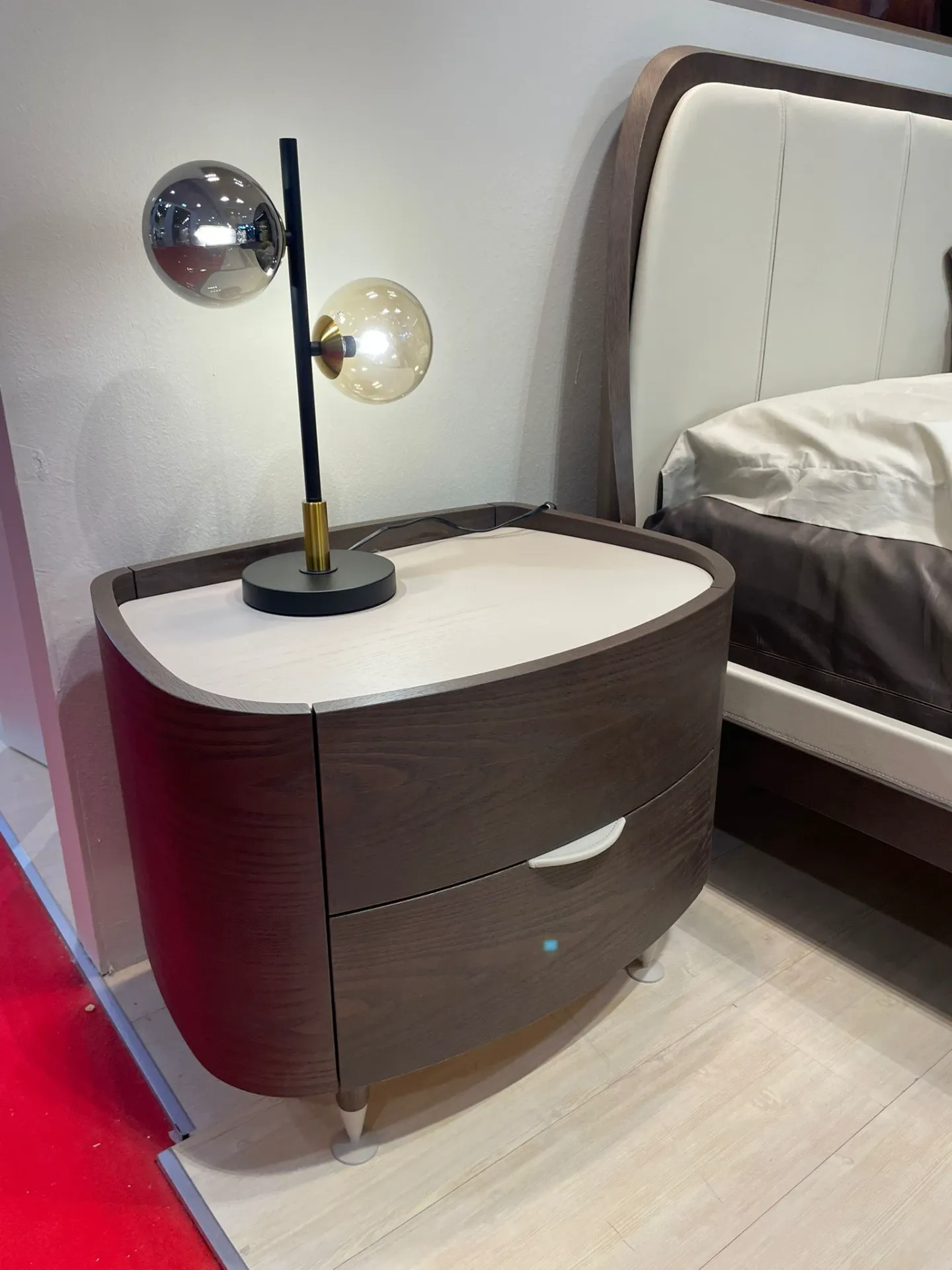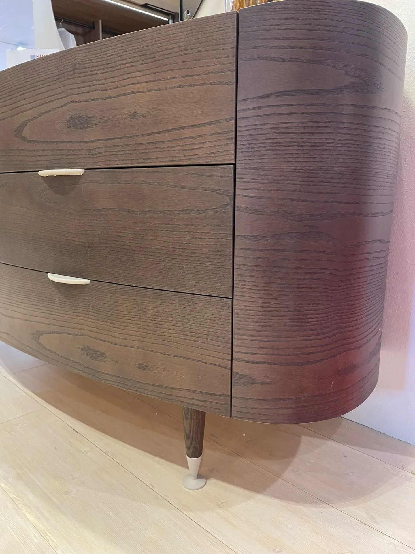 La sapiente lavorazione del legno insieme ai materiali metallo tessuti e pelli, arricchiscono la particolare forma curva dei contenitori della linea Ginevra, snelliti da quattro piedi di forma conica personalizzabili in innumerevoli soluzioni insieme ai top rivestiti, creano un prodotto di design molto particolare e attuale che richiama lo stile degli anni 80.