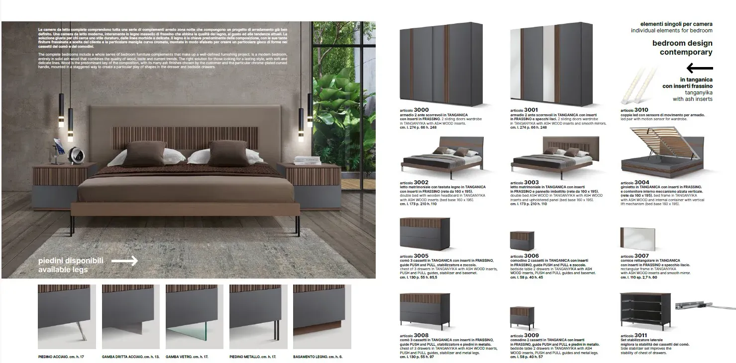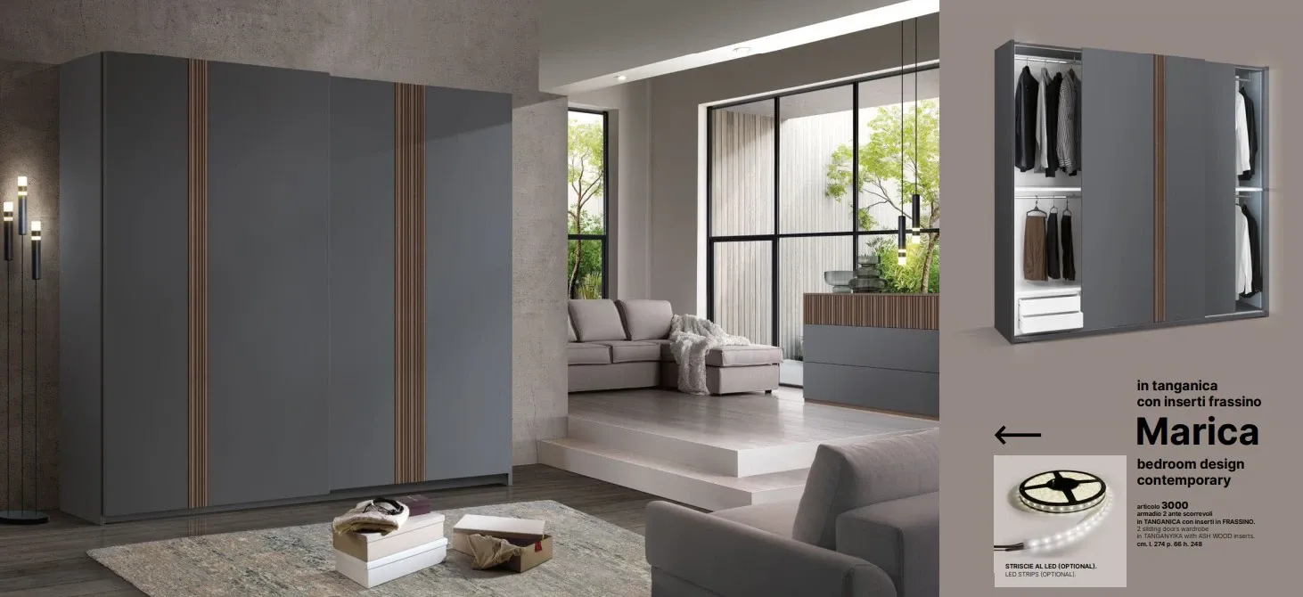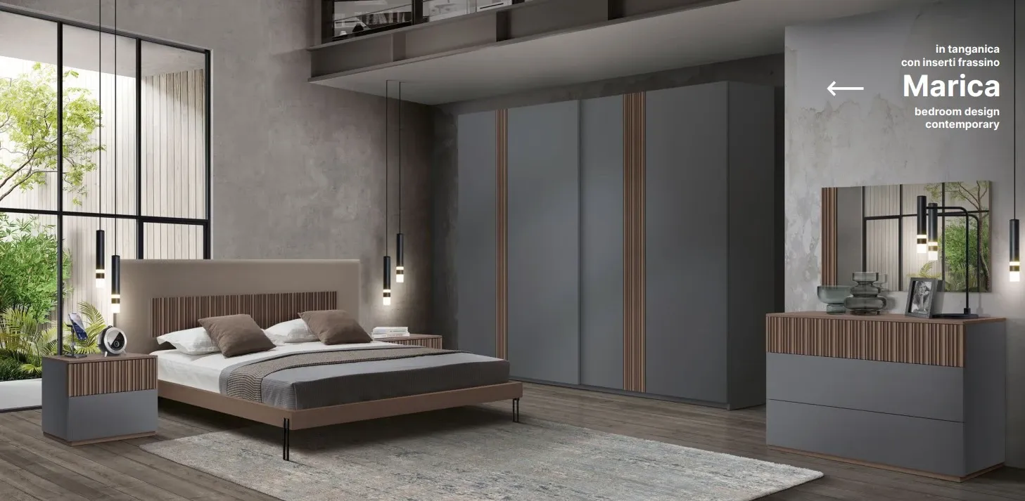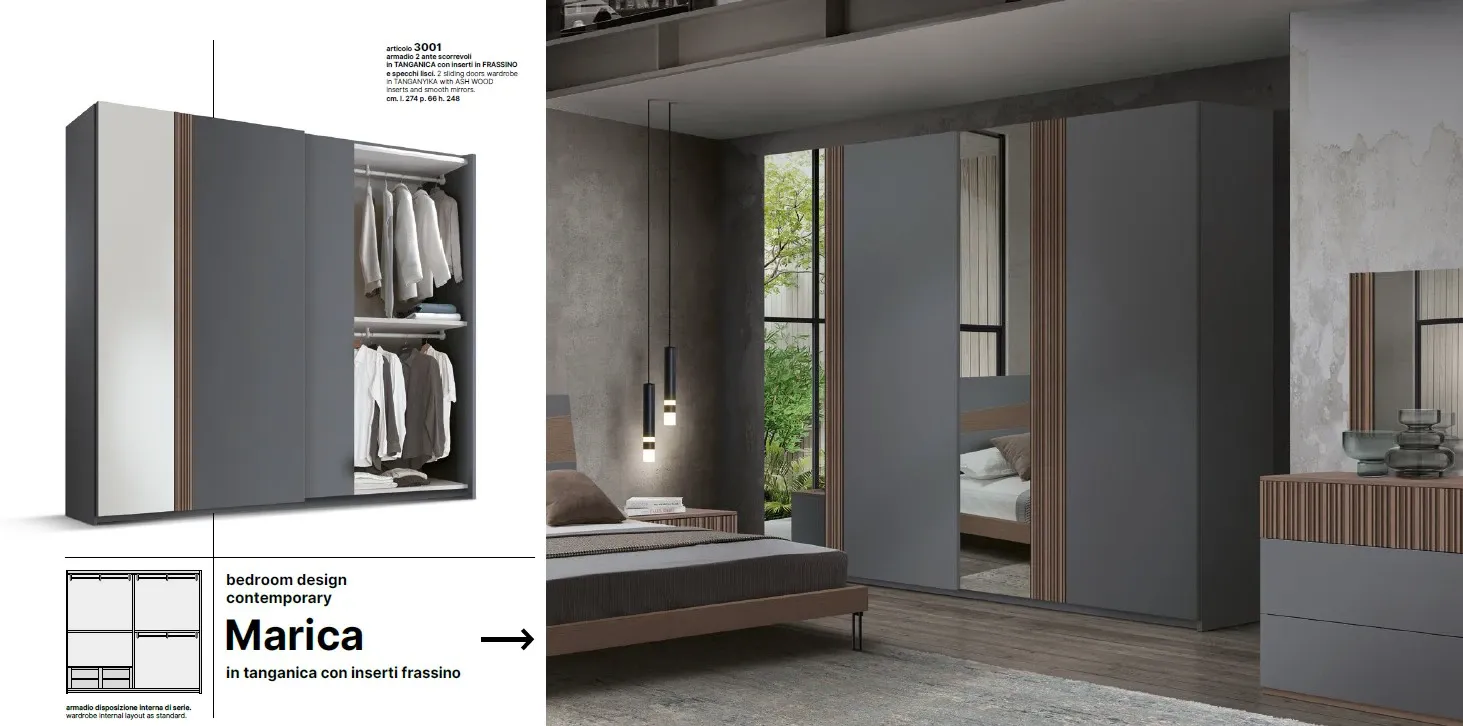 Dalla collezione esclusiva Mottes Mobili, presentiamo camera matrimoniale in legno di linea contemporanea modello MARICA. Armadio in noce Tanganika con inserti in frassino di linea contemporanea con due ante scorrevoli. Dotazione interna: tre bastoni portaabito, due ripiani. Possibilità di aggiunta cassettiera interna euro 200,00, eventuale specchio esterno con maggiorazione di 200,00 Larghezza: 274cm, Altezza: 248cm, Profondità: 65cm. Letto matrimoniale in noce tanganika di linea contemporanea con testata imbottita in ecopelle di colore bianco e inserti in frassino, completo di rete a doghe, materasso escluso. Comodino e comò in legno Noce Tanganica con inserti in legno di frassino di linea contemporanea con due cassetti con apertura push and pull, Possibilità di scelta delle finiture senza variazione di prezzo. Consegna compresa nel prezzo in tutto il territorio nazionale, 60 giorni lavorativi. L'offerta per la camera MARICA come da foto è di euro 6.700,00. Per maggiori informazioni contattaci via mail o passa a trovarci nel nostro showroom.