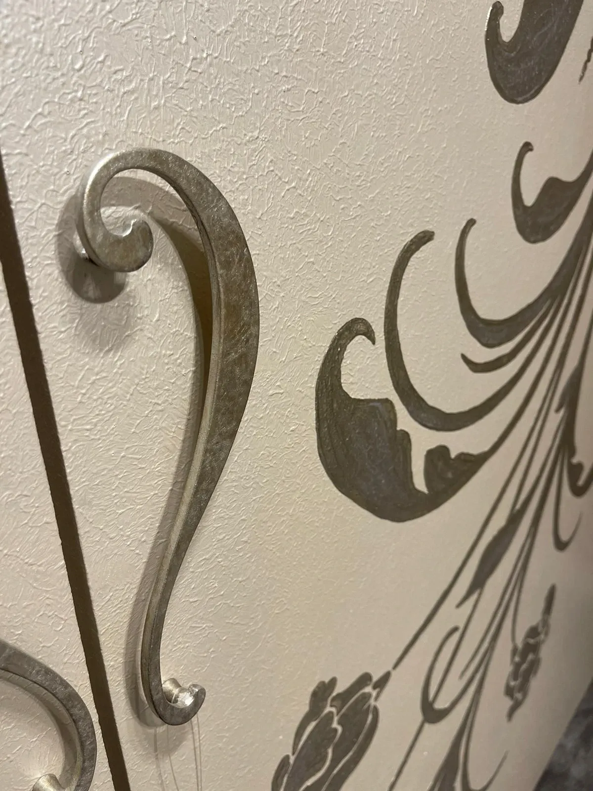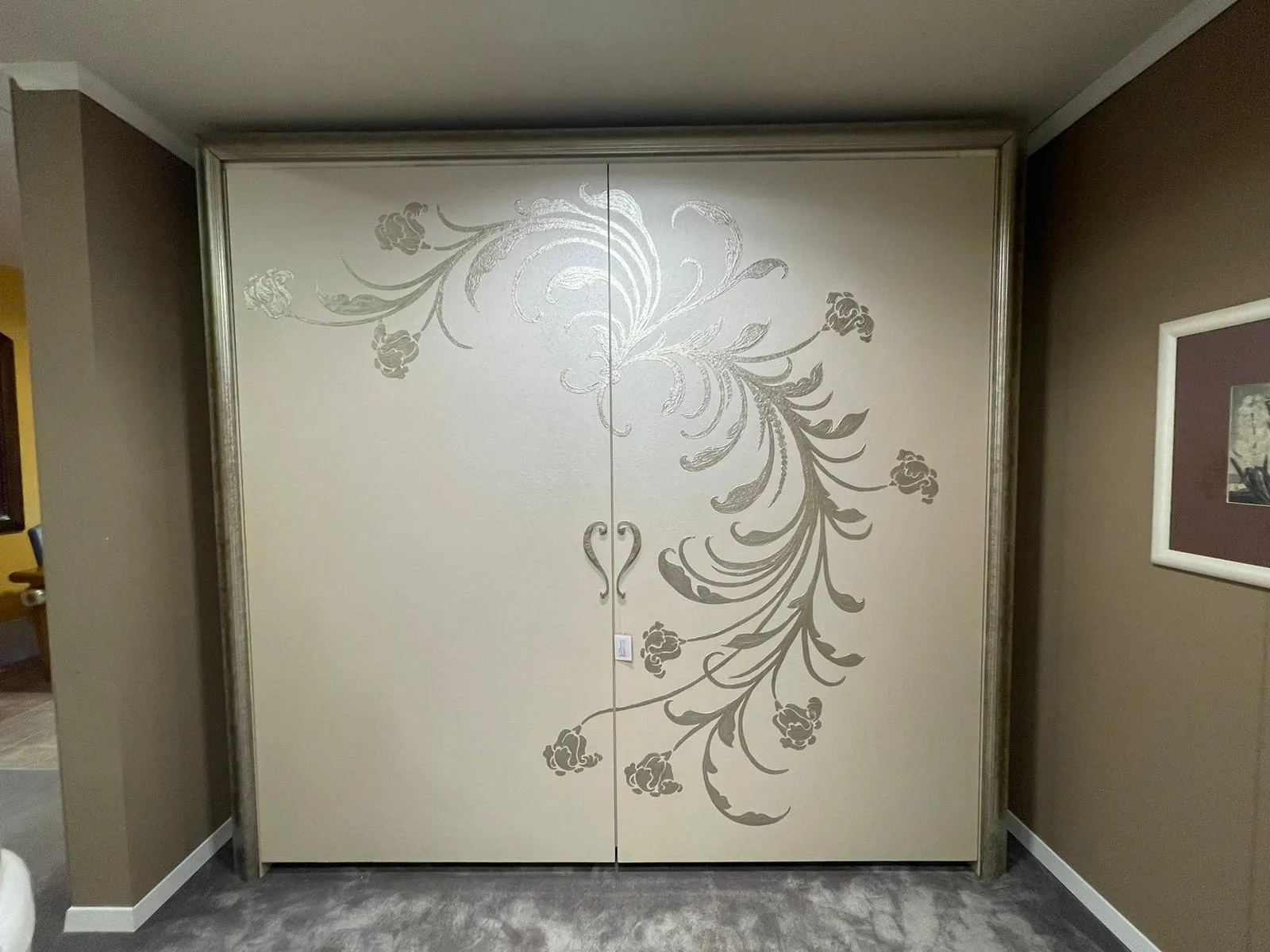 266-C-B_ARMADIO WALL IN LEGNO 2 ANTE COMPLANARI. LACCATO ANTICO B57 CAMEO DECORO FIORI A RILIEVO DECORO C46 - MANIGLIA CUORE C46 - CORNICE FOGLIA ARGENTO TORTORA DOTAZIONE INTERNA: 2 RIPIANI - 1 CASSETTIERA CON 3 CASSETTI - 3 BASTONI APPENDIABITI
