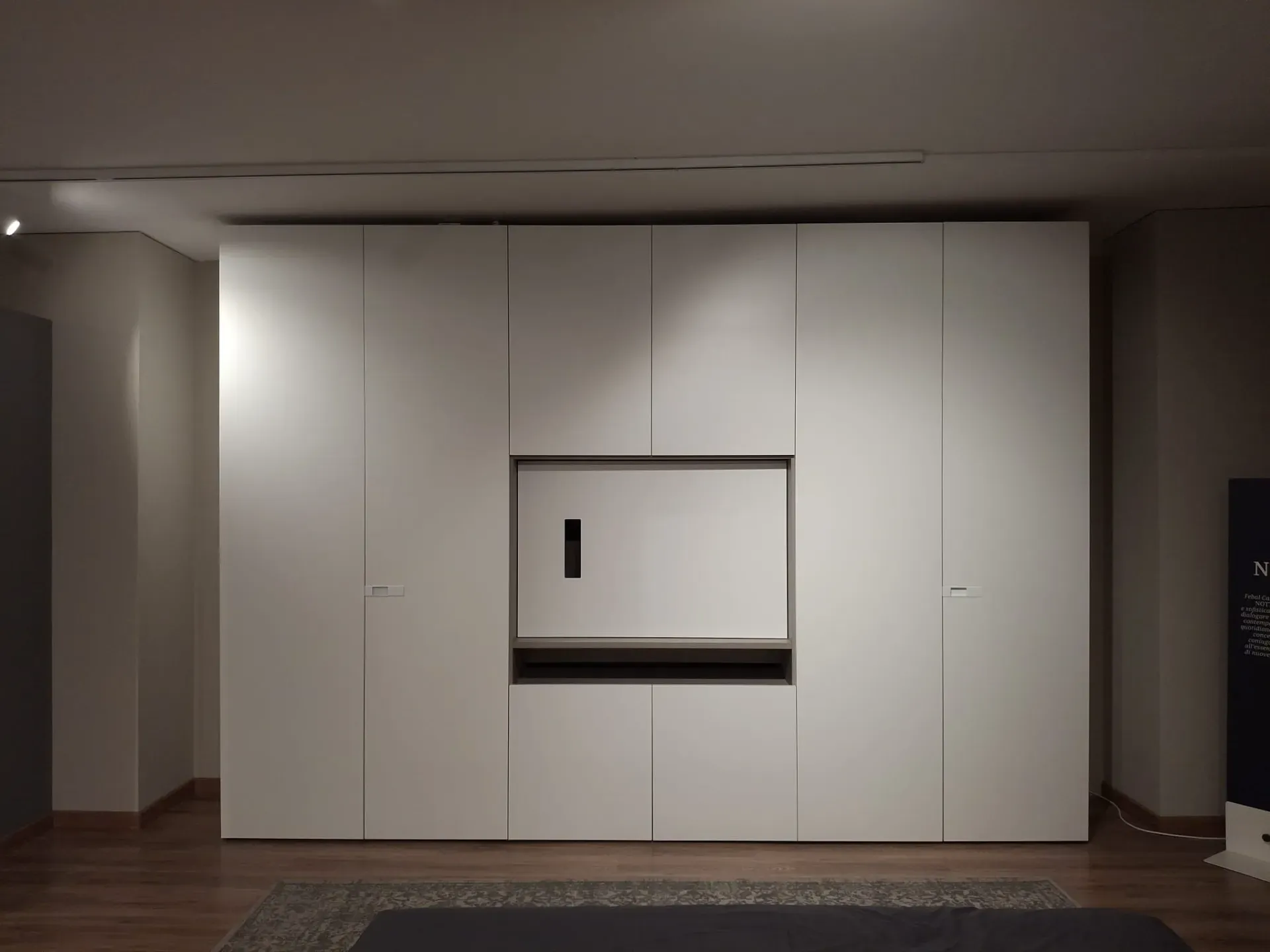 Armadio mod. Barret ad anta battente con maniglia integrata e finitura interna effetto tessuto leather grey, composizione da L 363 cm H 258 cm P 62 cm, suddiviso in tre moduli da 120 cm con vano TV centrale apribile (misura max TV 40 pollici) e dotazione interna con cassettiera 4 cassetti da 120 cm , vassoio porta cinture e servetto sali-scendi, n. 4 ripiani da 120 cm, porta pantaloni e luce a led interna con sensore.